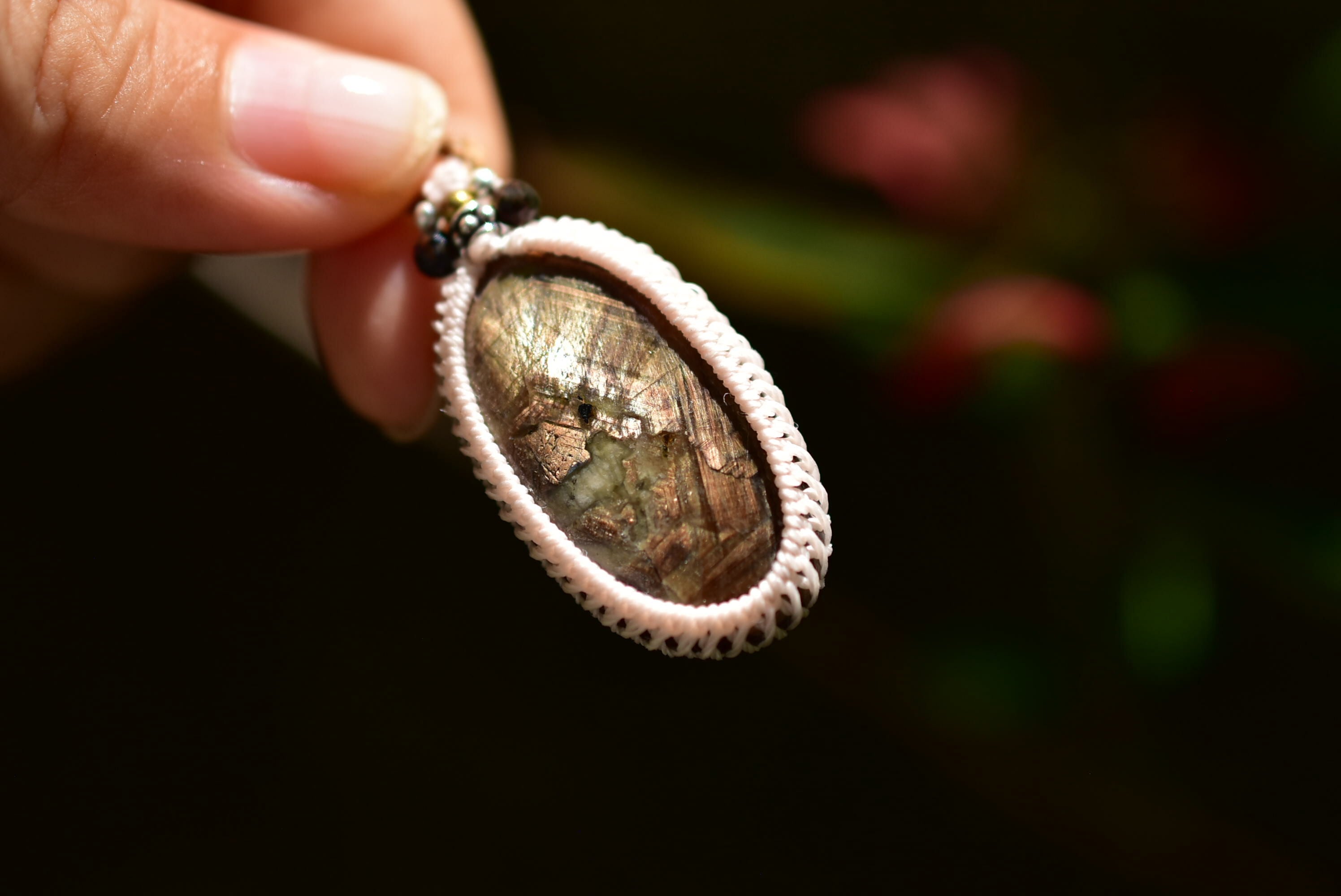 ◆このたびはナチュラルホワイト、ゴールドブラウン色の蝋引き糸を使用しマクラメ編み装飾を施しました。