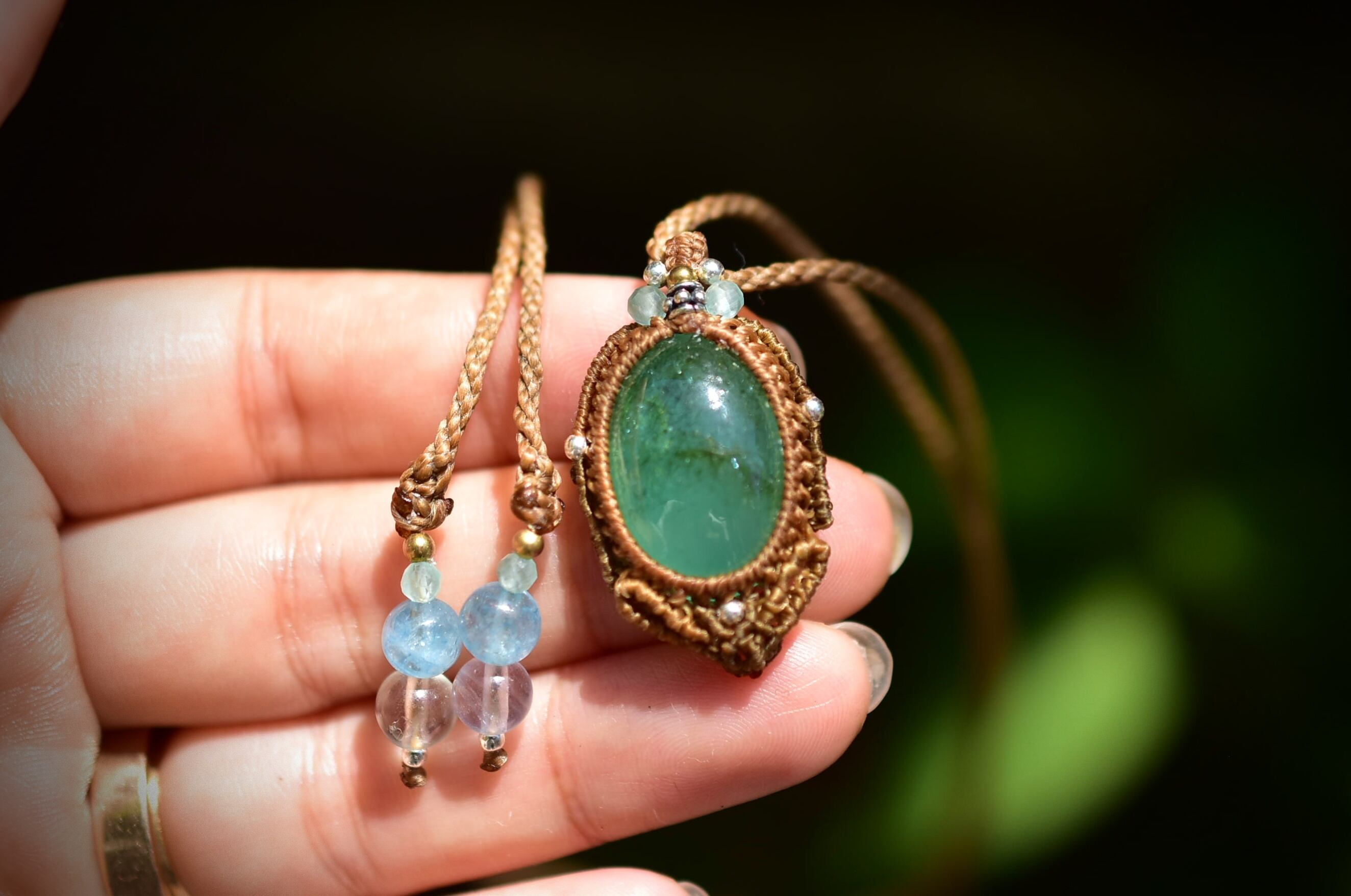 ◆このたびはゴールドブラウン色の蝋引き糸を使用しマクラメ編み装飾を施しました。