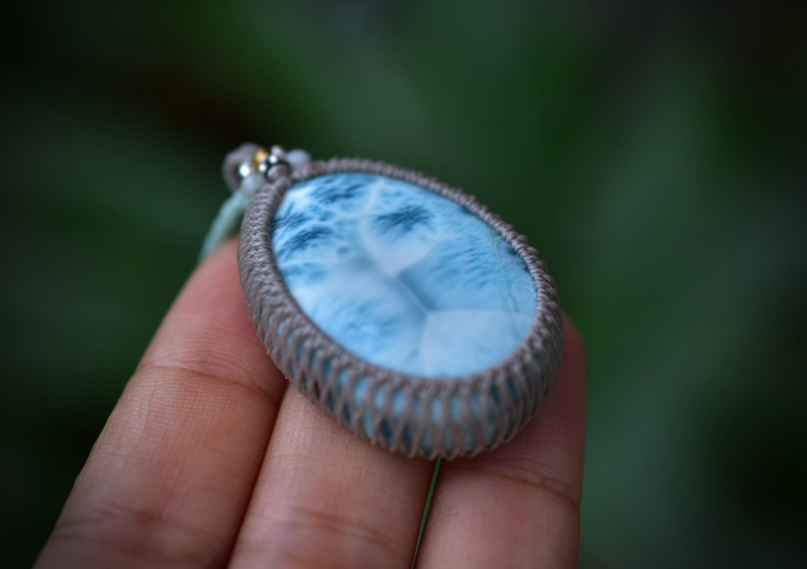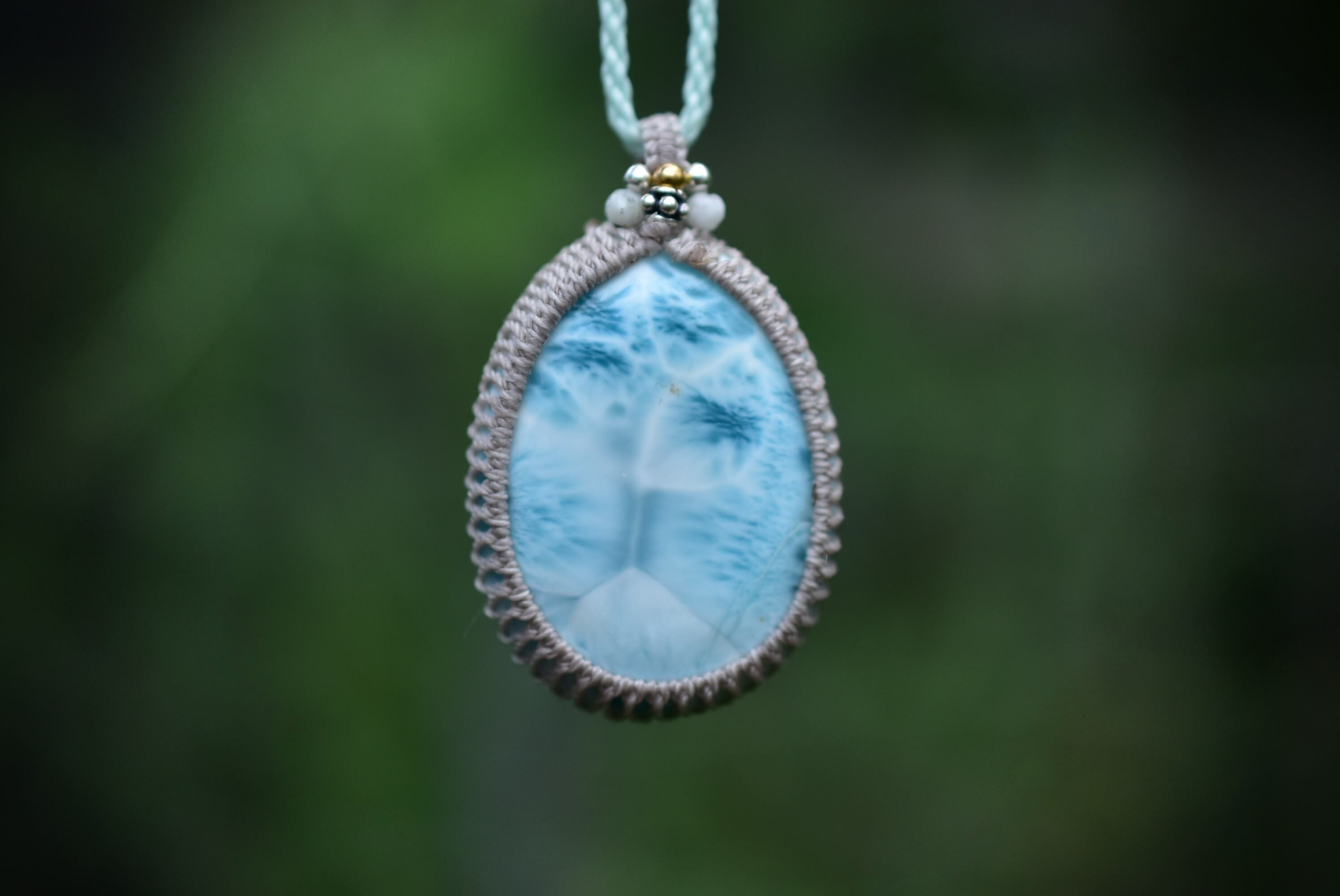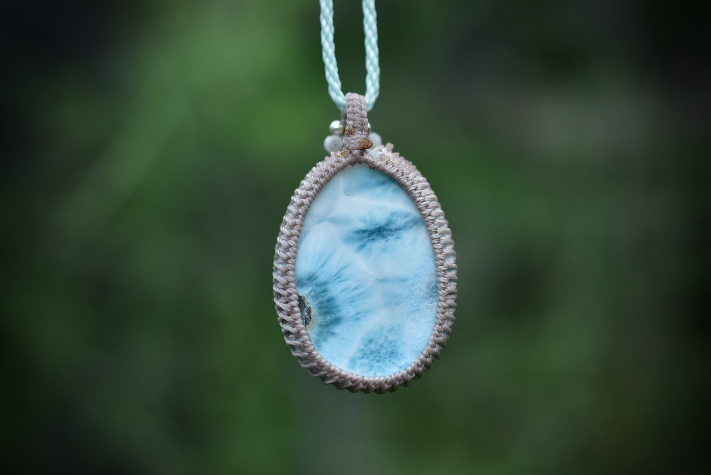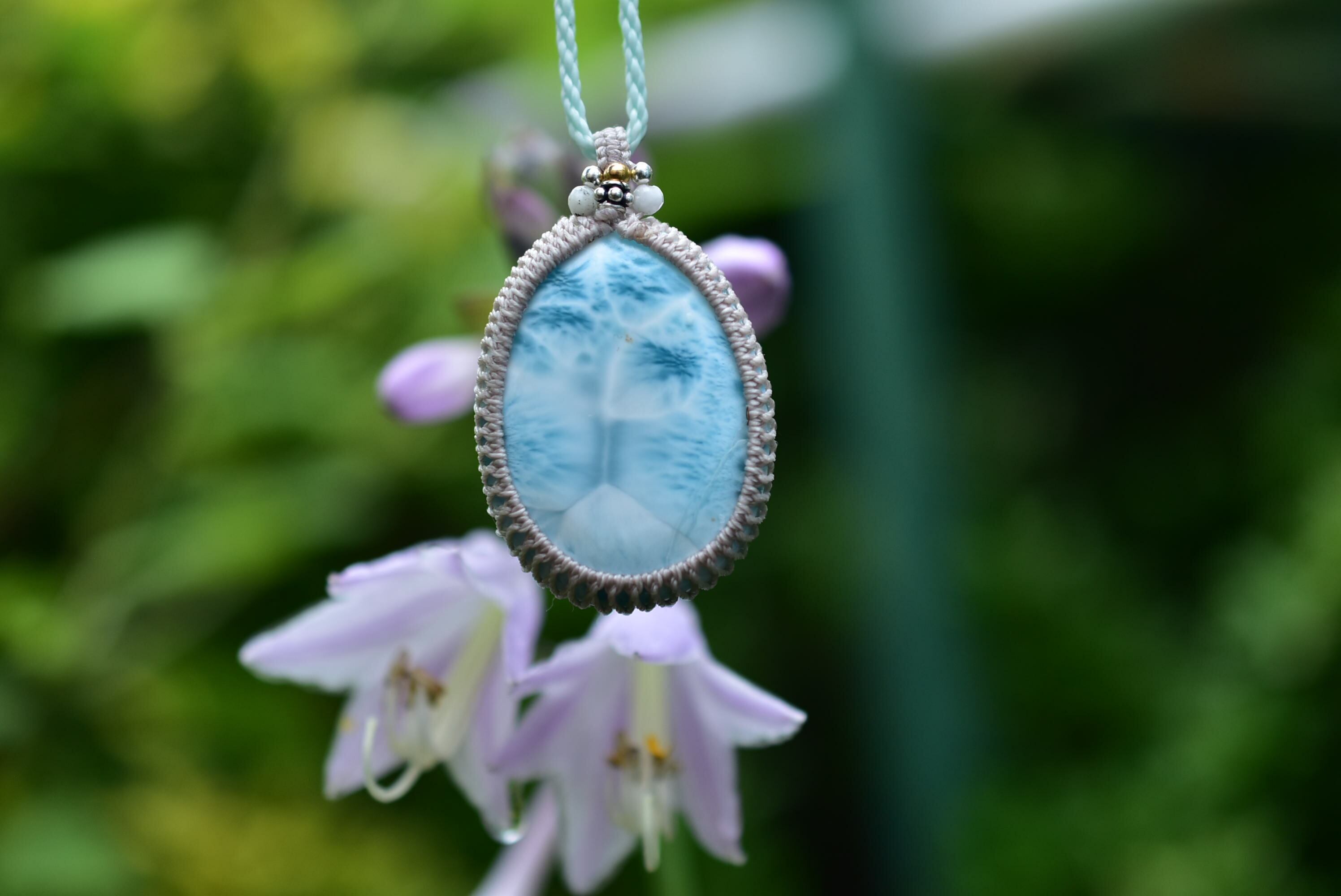◆このたびはカフェオレ色の蝋引き糸を使用しマクラメ編み装飾を施しました。