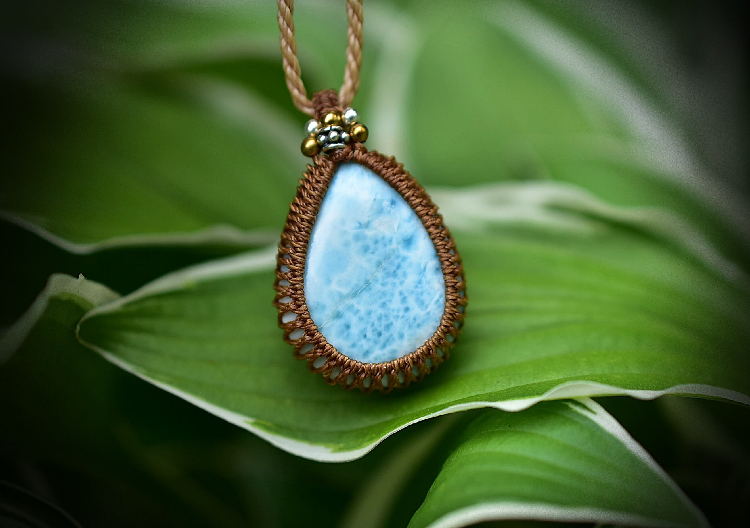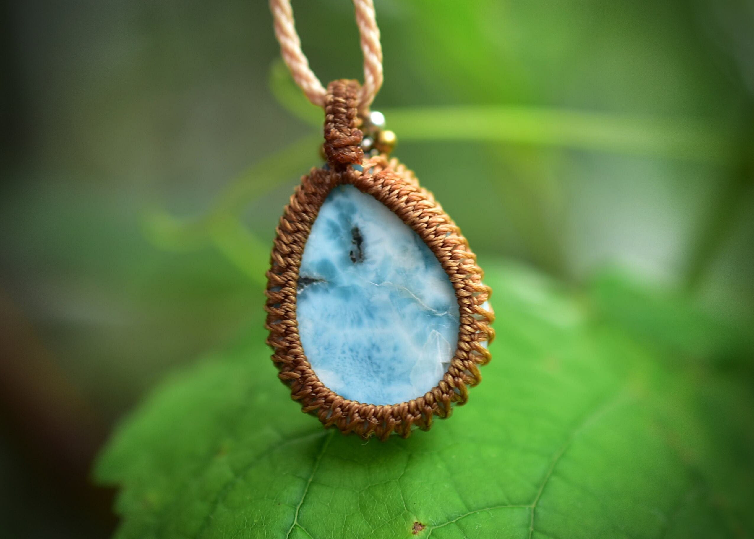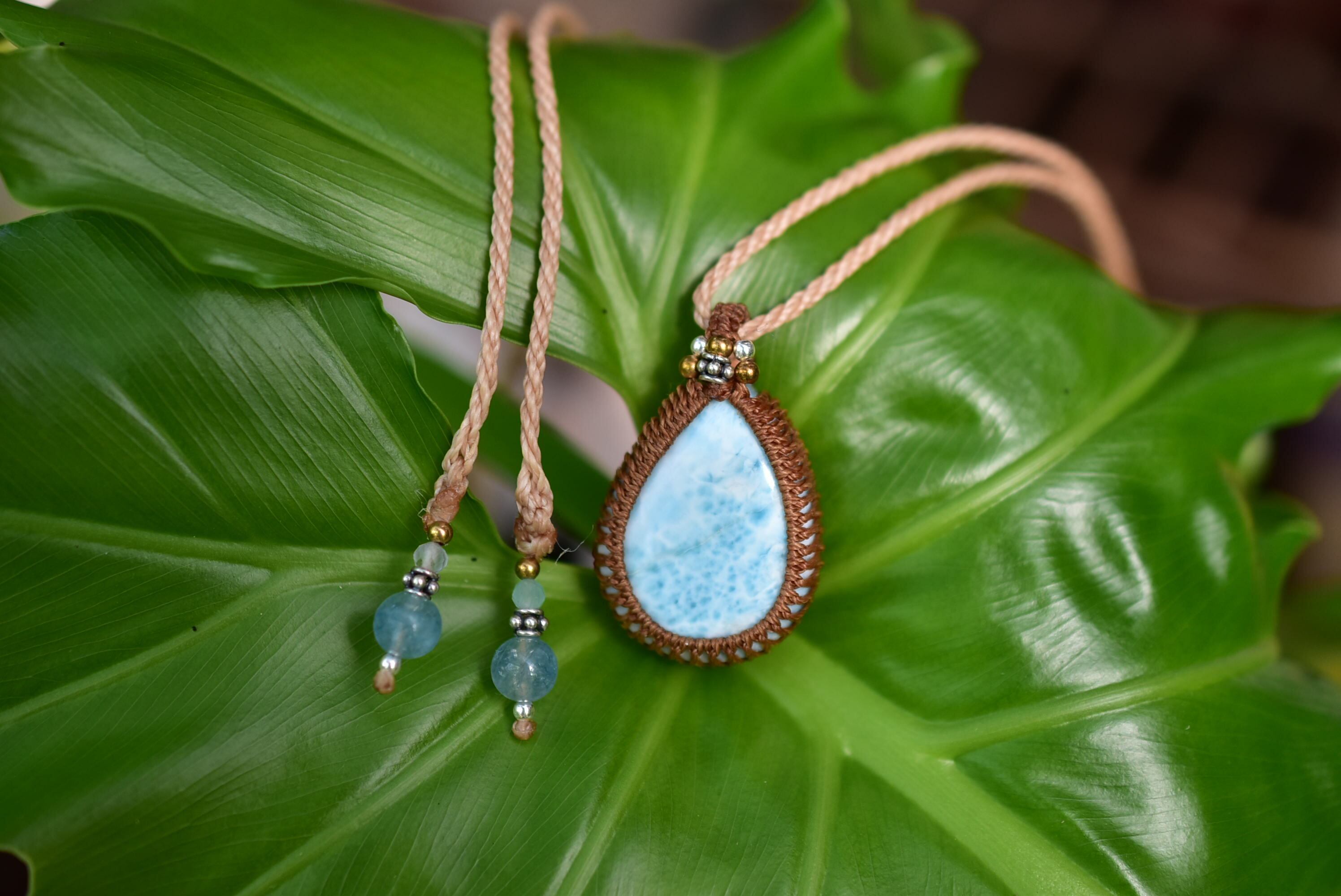 ◆このたびはキャラメル、ゴールドブラウン色の蝋引き糸を使用しマクラメ編み装飾を施しました。