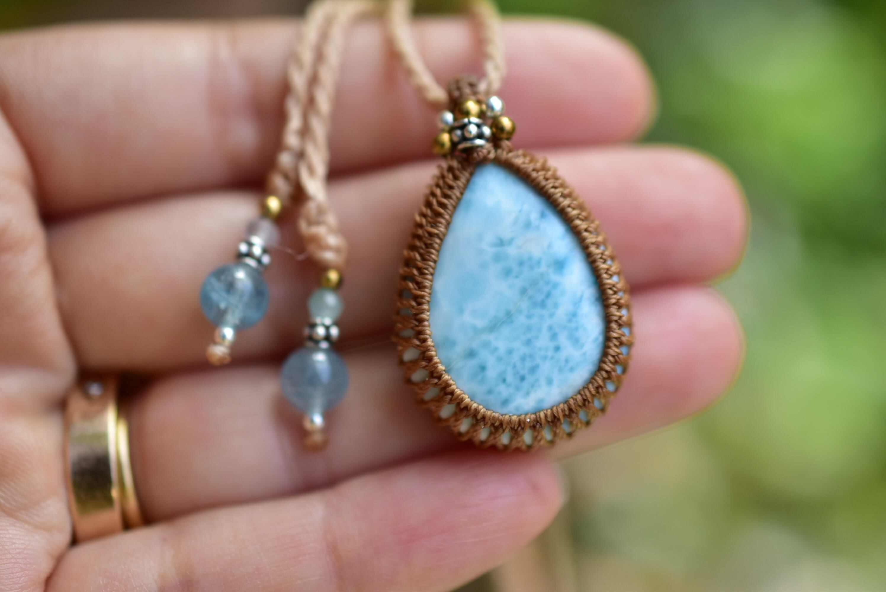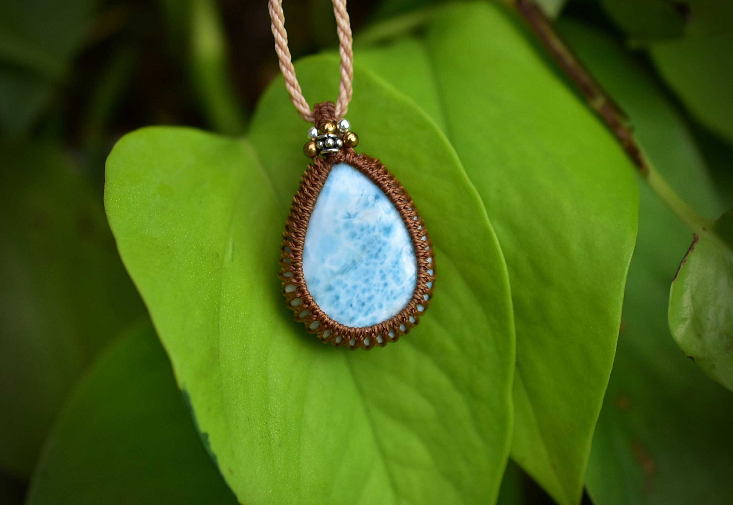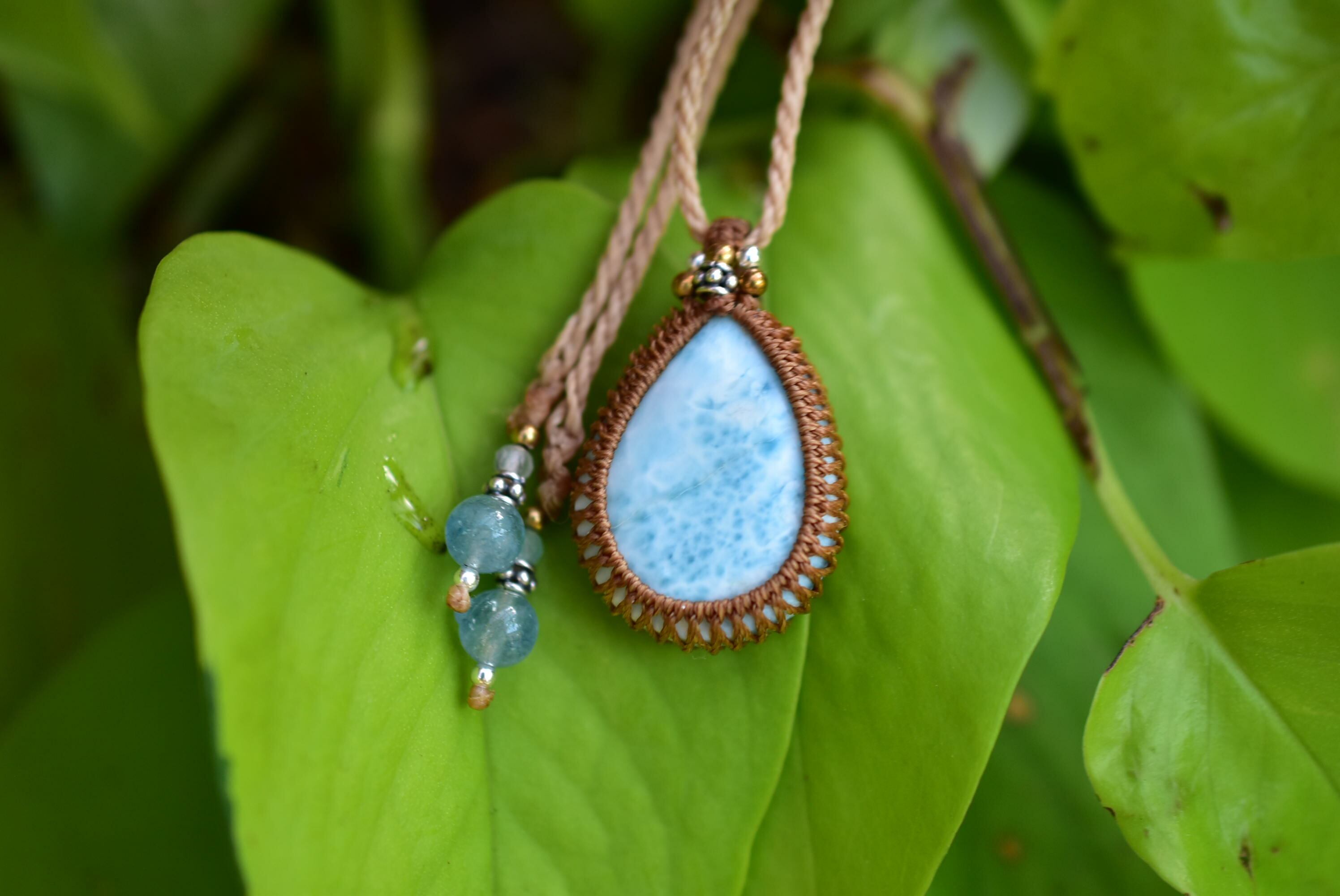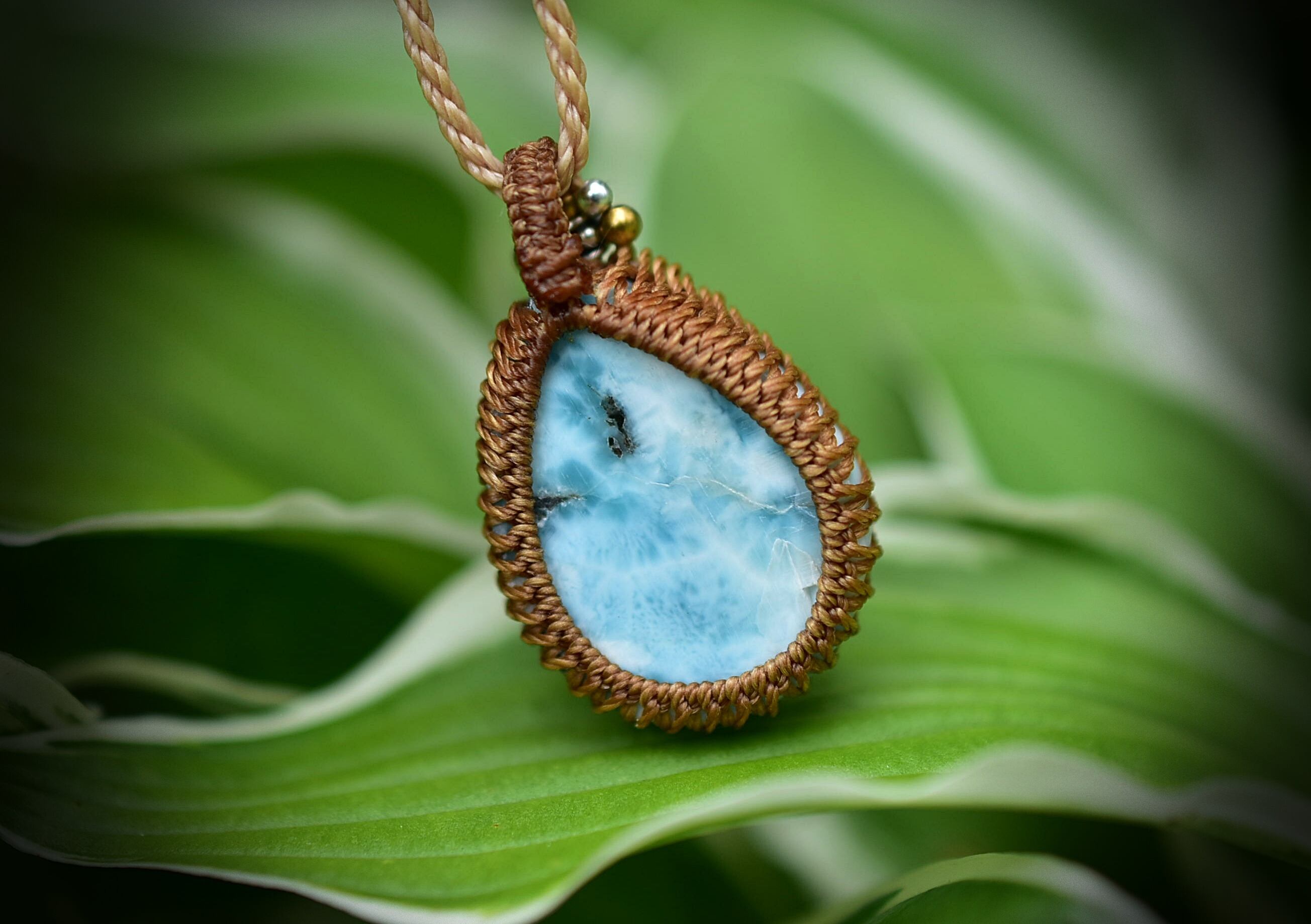 ◆このたびはキャラメル、ゴールドブラウン色の蝋引き糸を使用しマクラメ編み装飾を施しました。