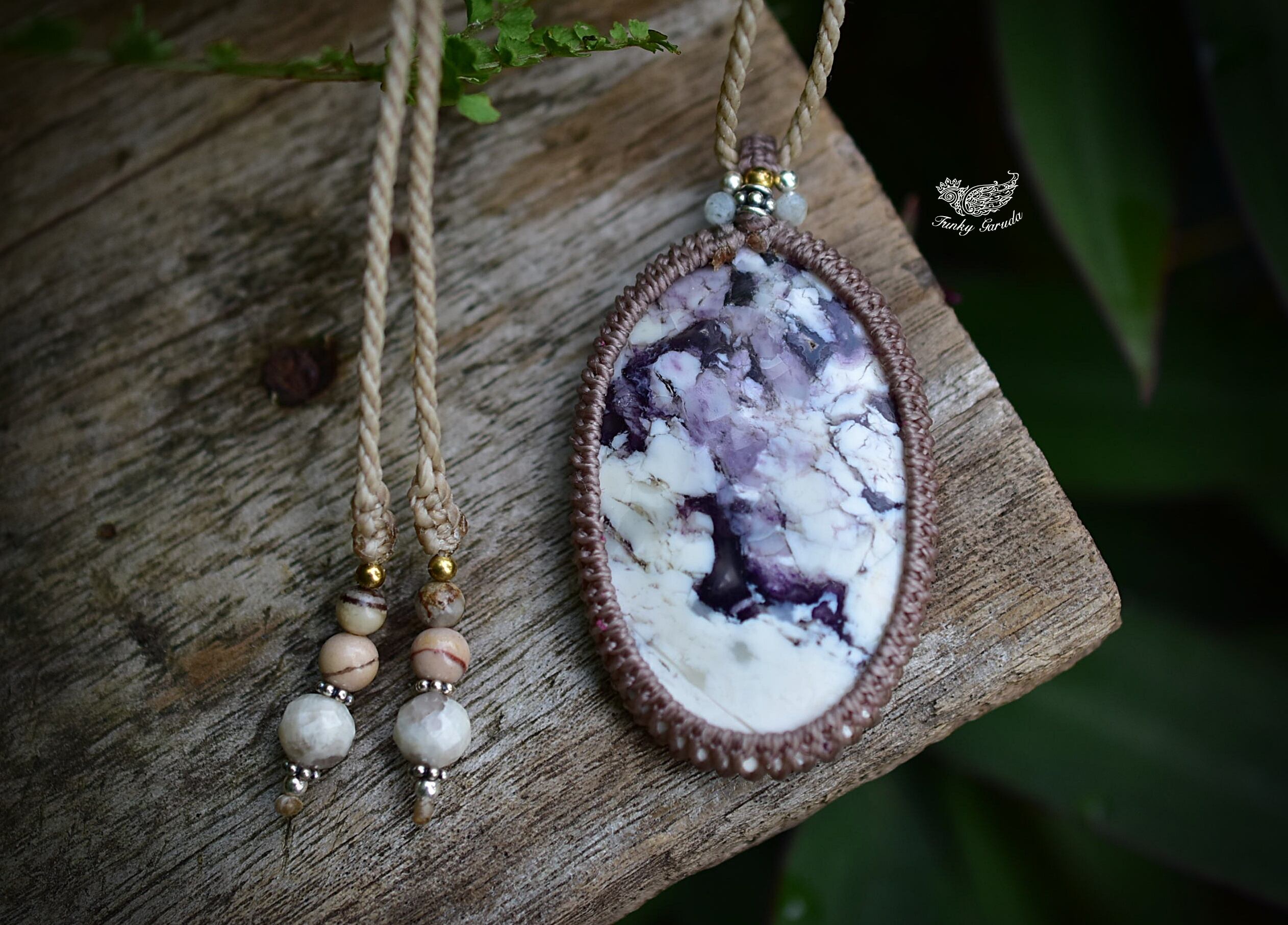 ◆このたびはカフェオレ、キナリ色の蝋引き糸を使用しマクラメ編み装飾を施しました。