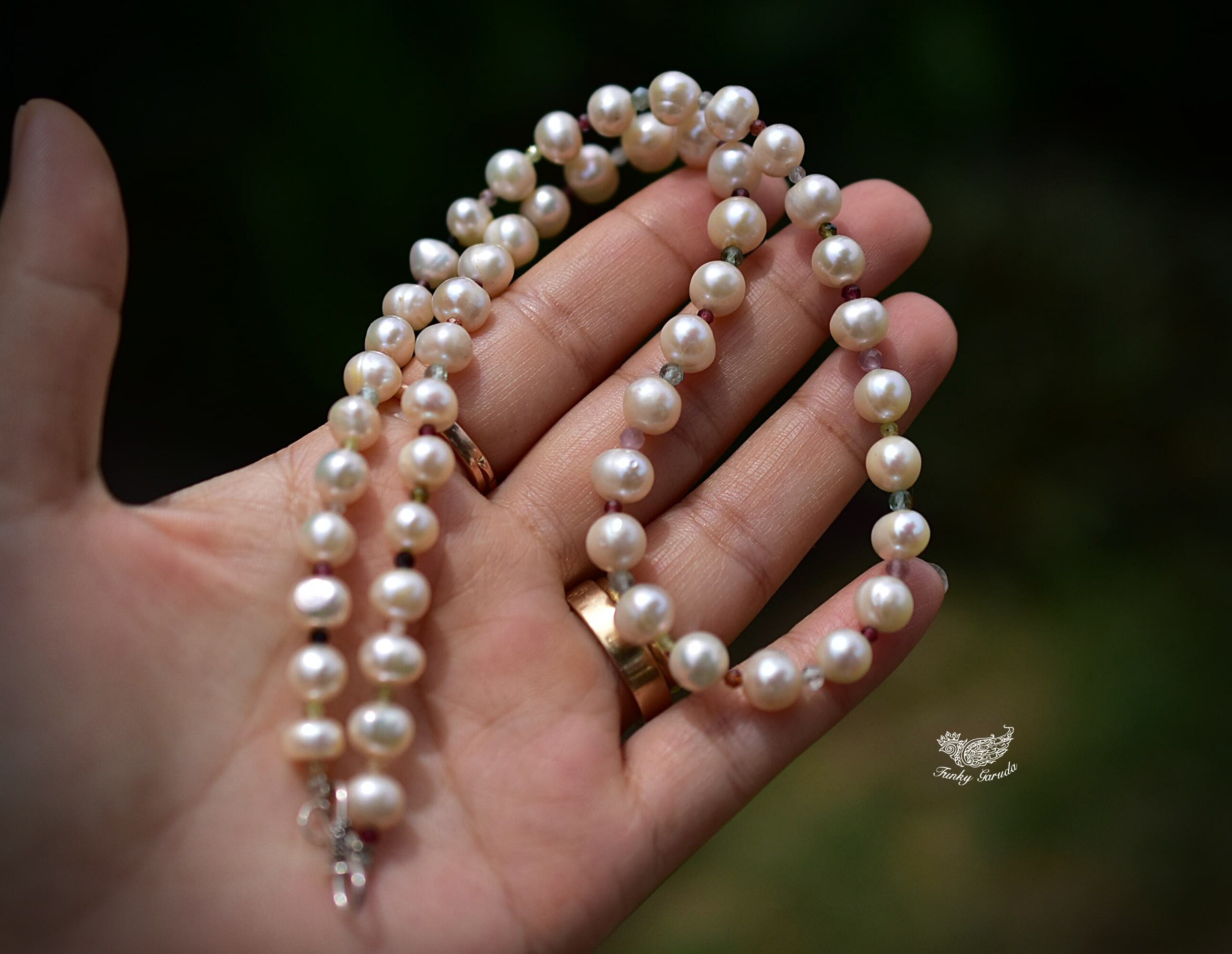 ひと粒ひと粒パールとトルマリンビーズを見立てて