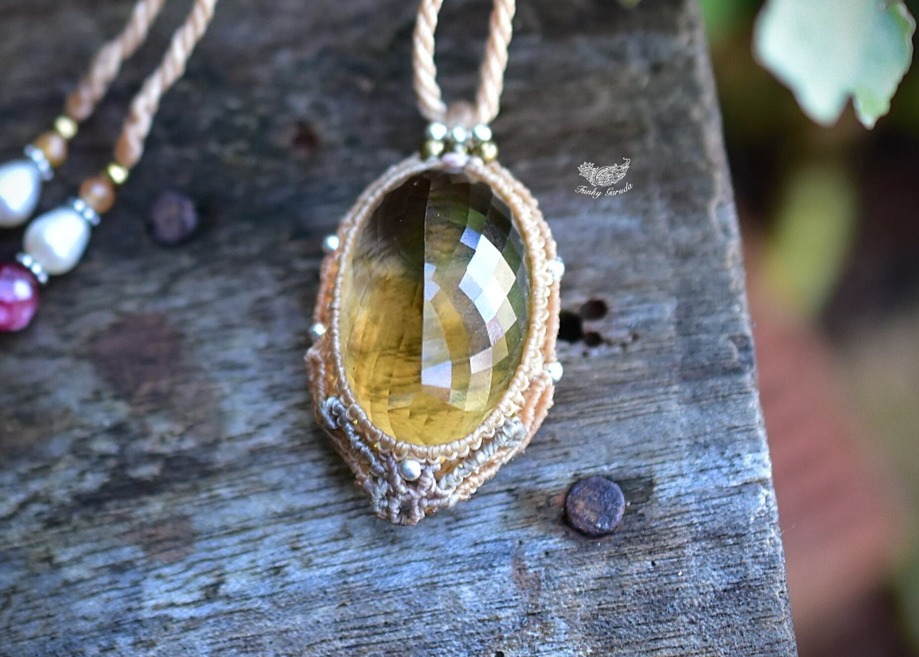 ◆このたびはキャラメル色の蝋引き糸を使用しマクラメ編み装飾を施しました。