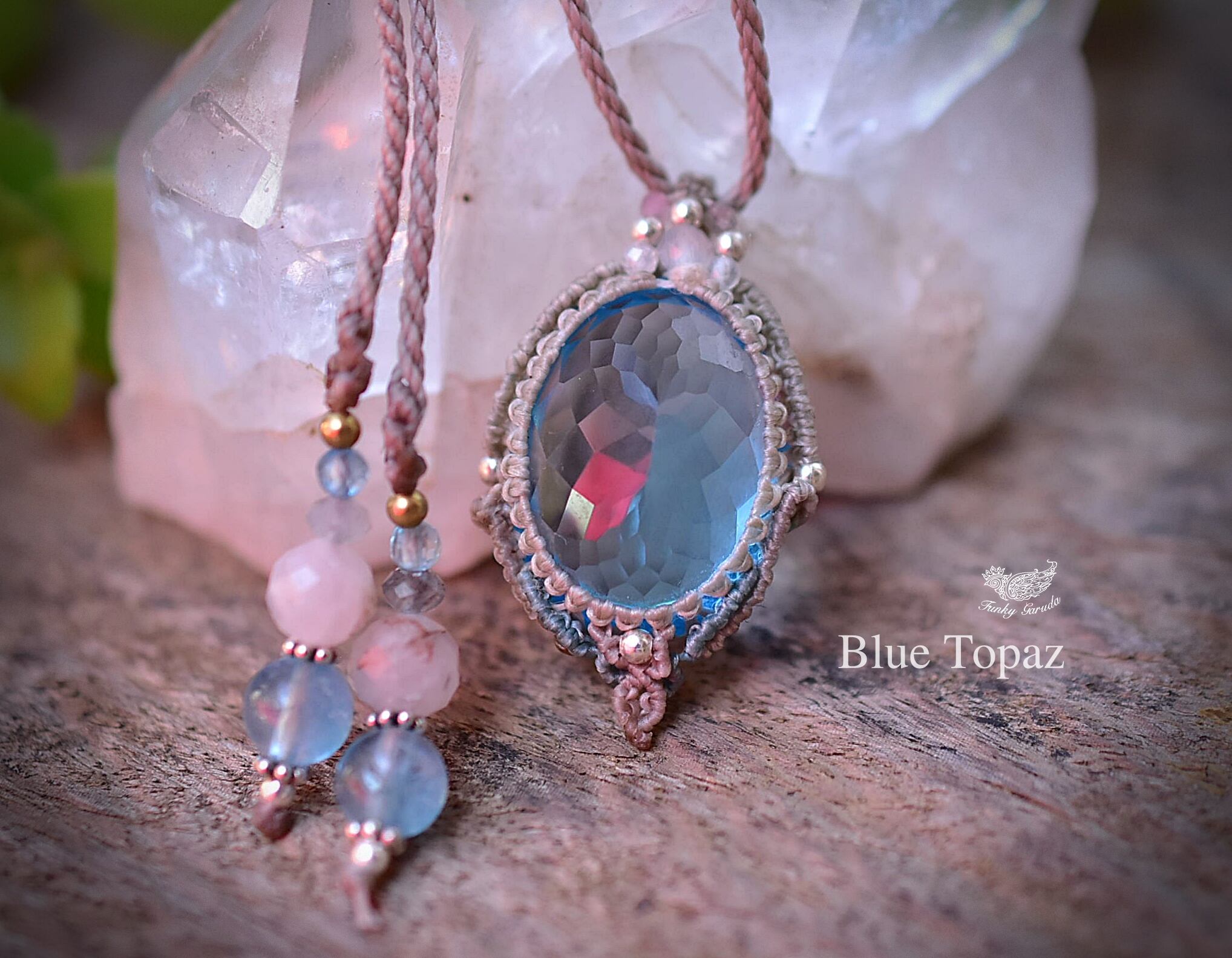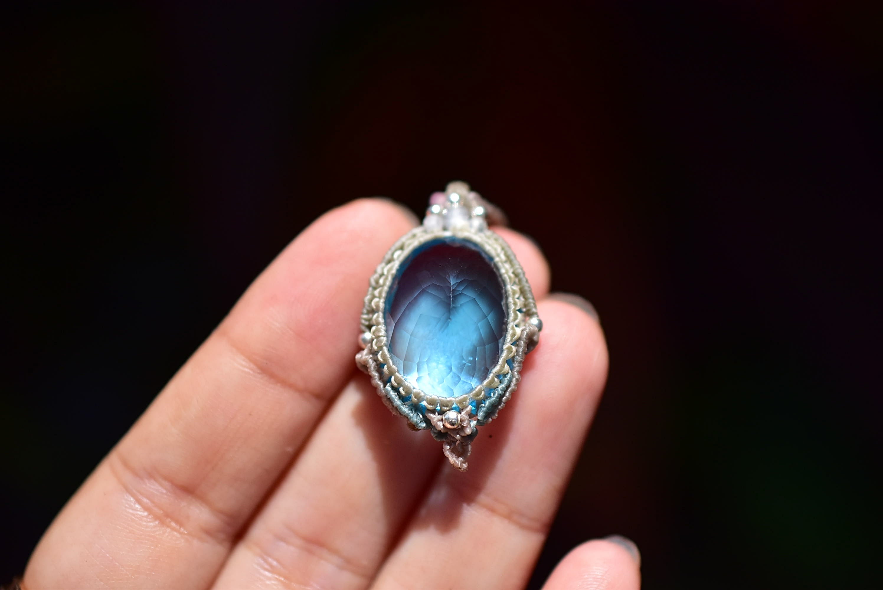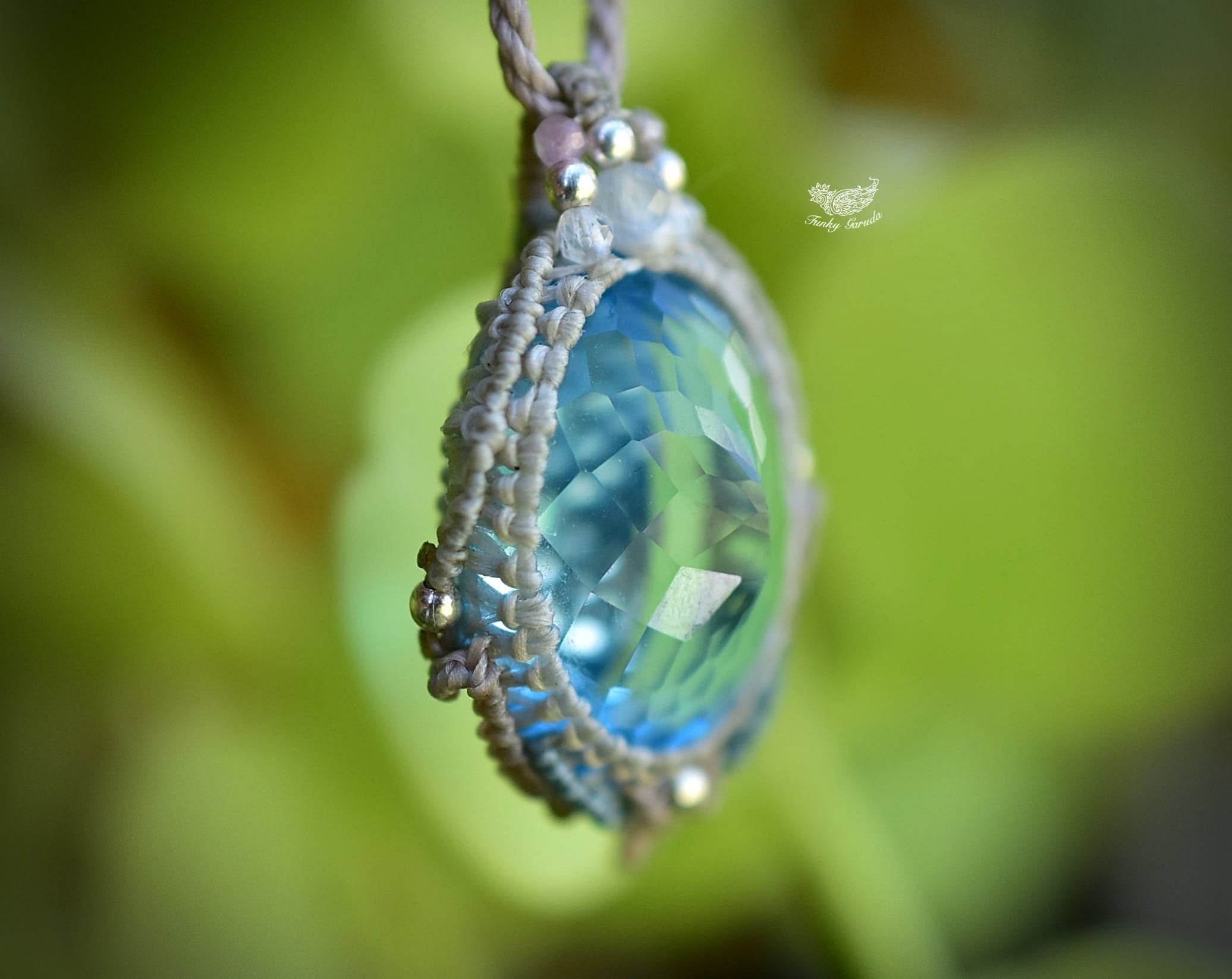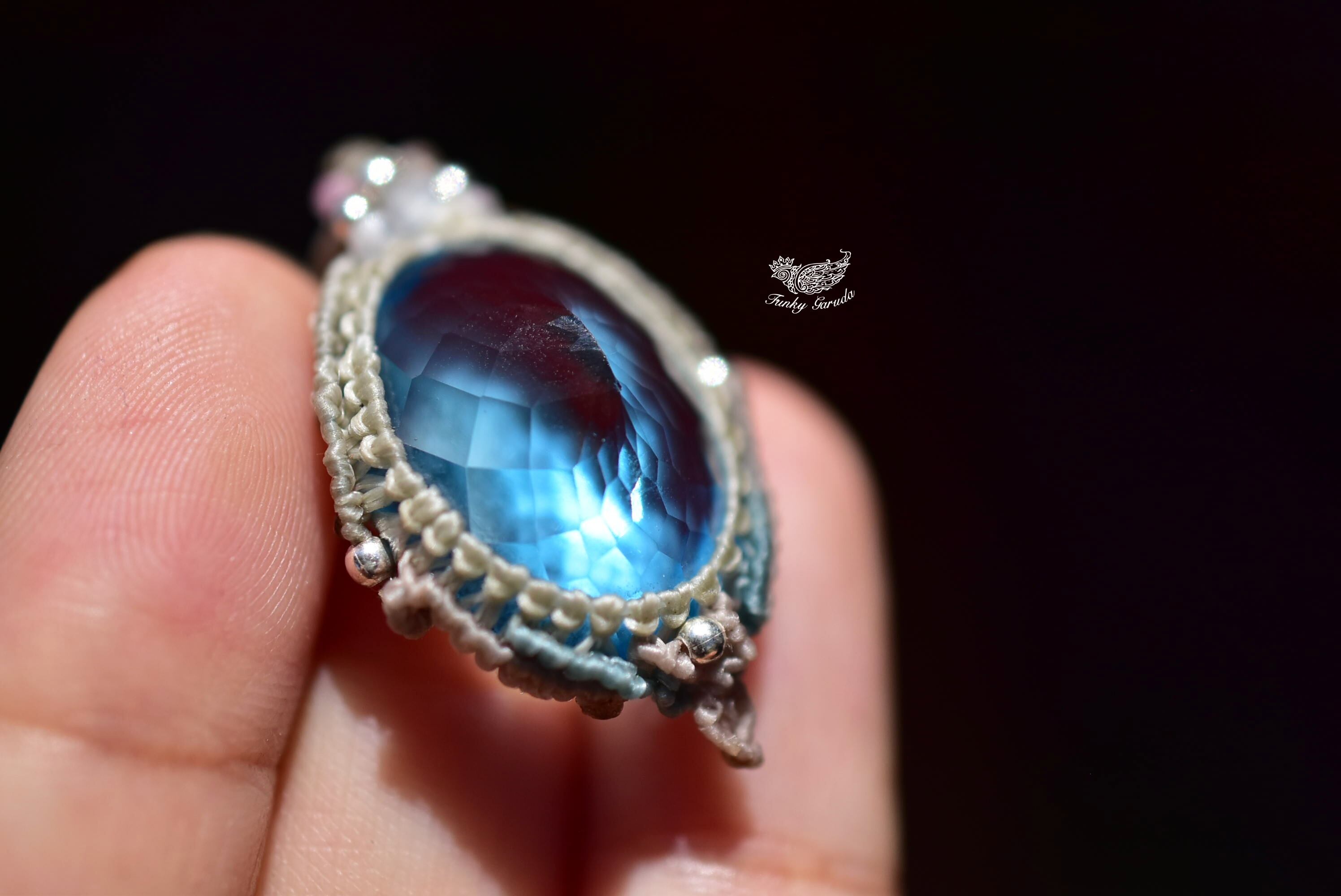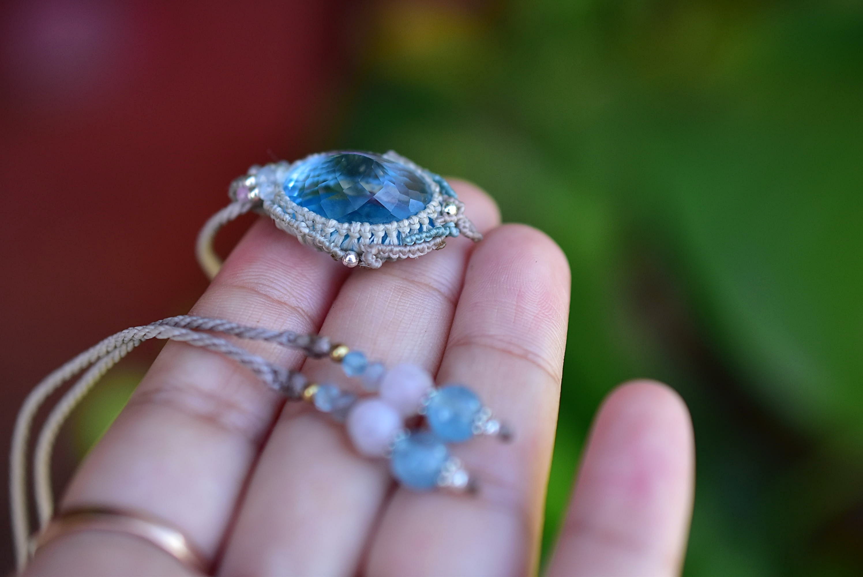 ◆このたびはピンク、カフェオレ、ブルー色の蝋引き糸を使用しマクラメ編み装飾を施しました。