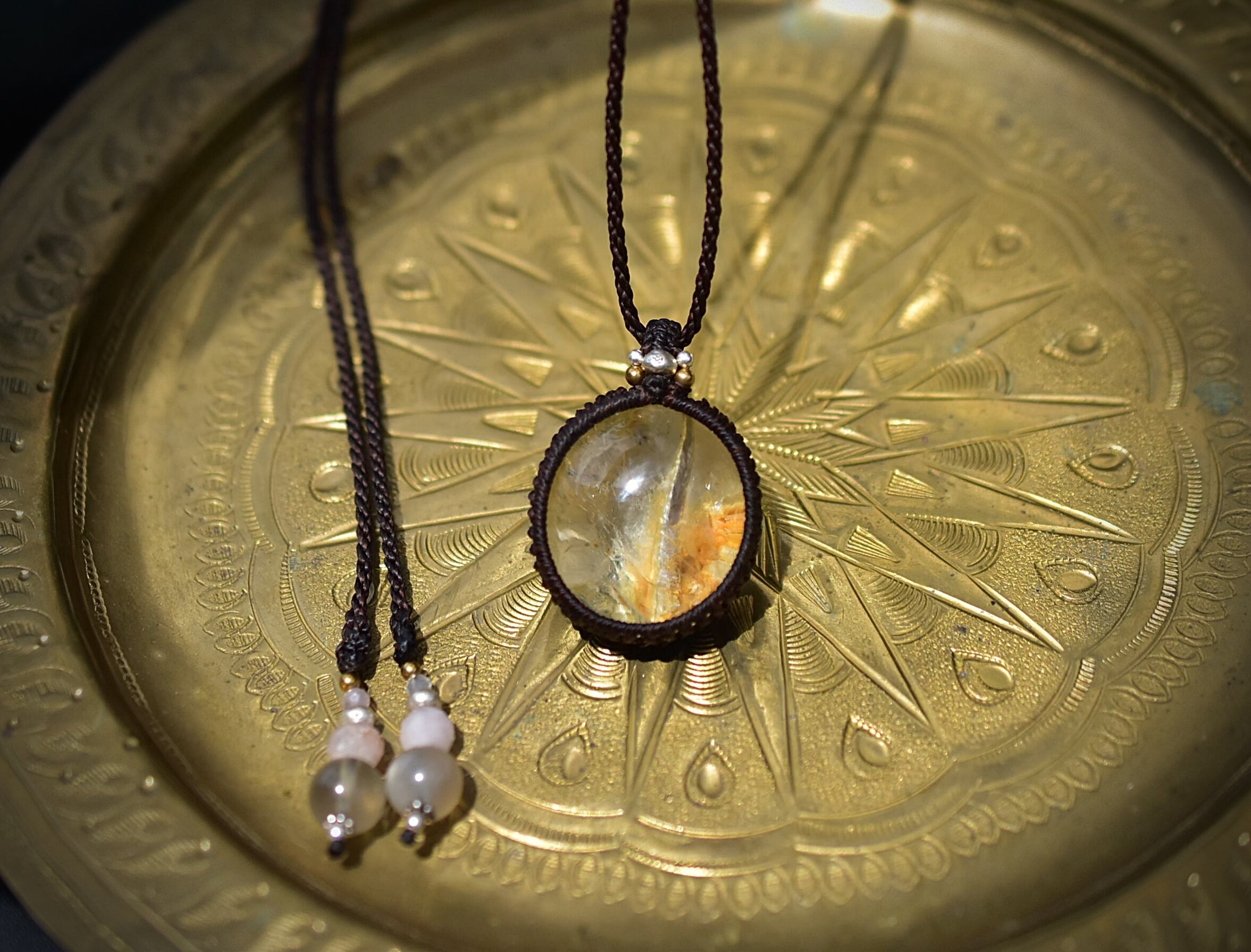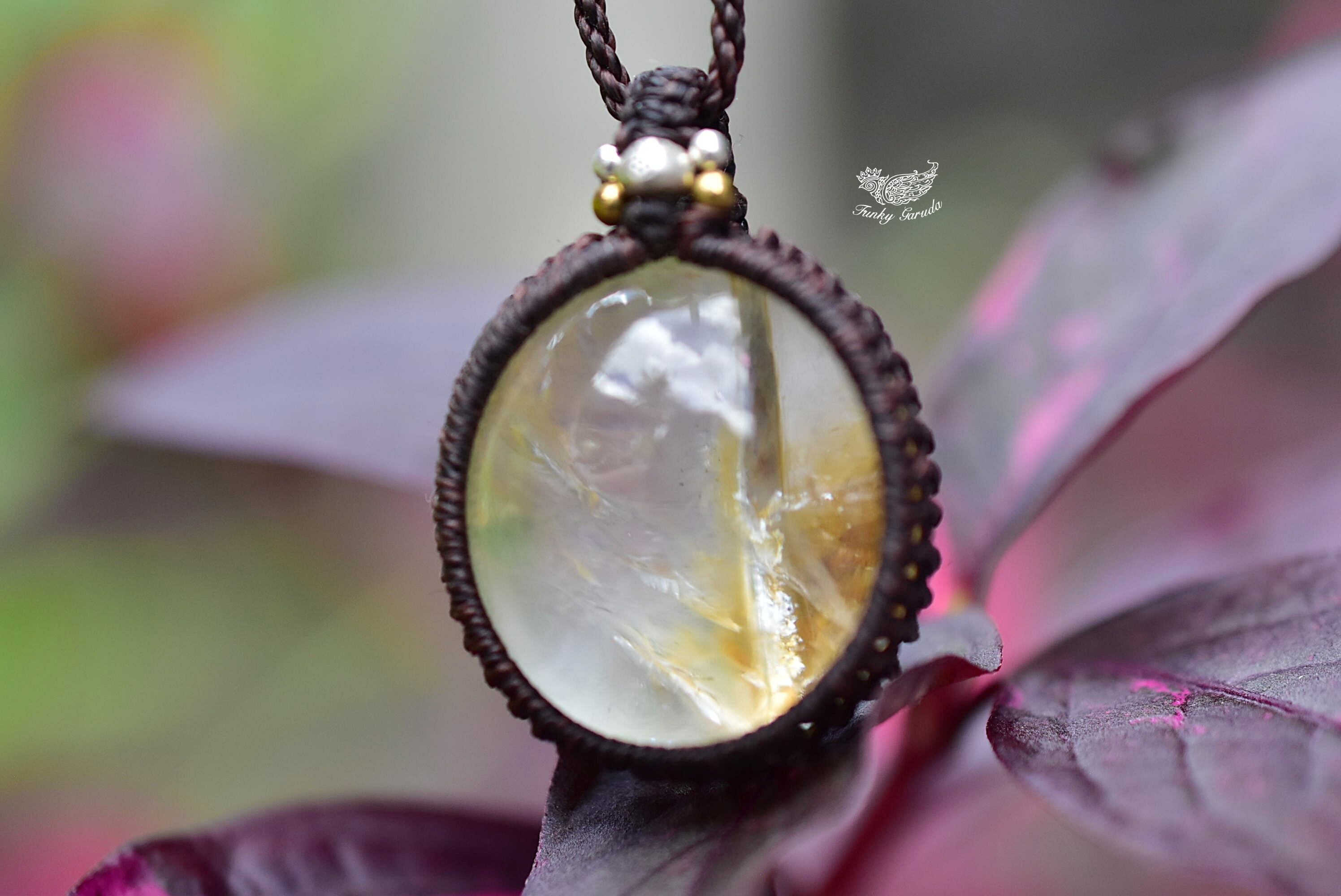 ◆このたびはダークブラウン色の蝋引き糸を使用しマクラメ編み装飾を施しました。