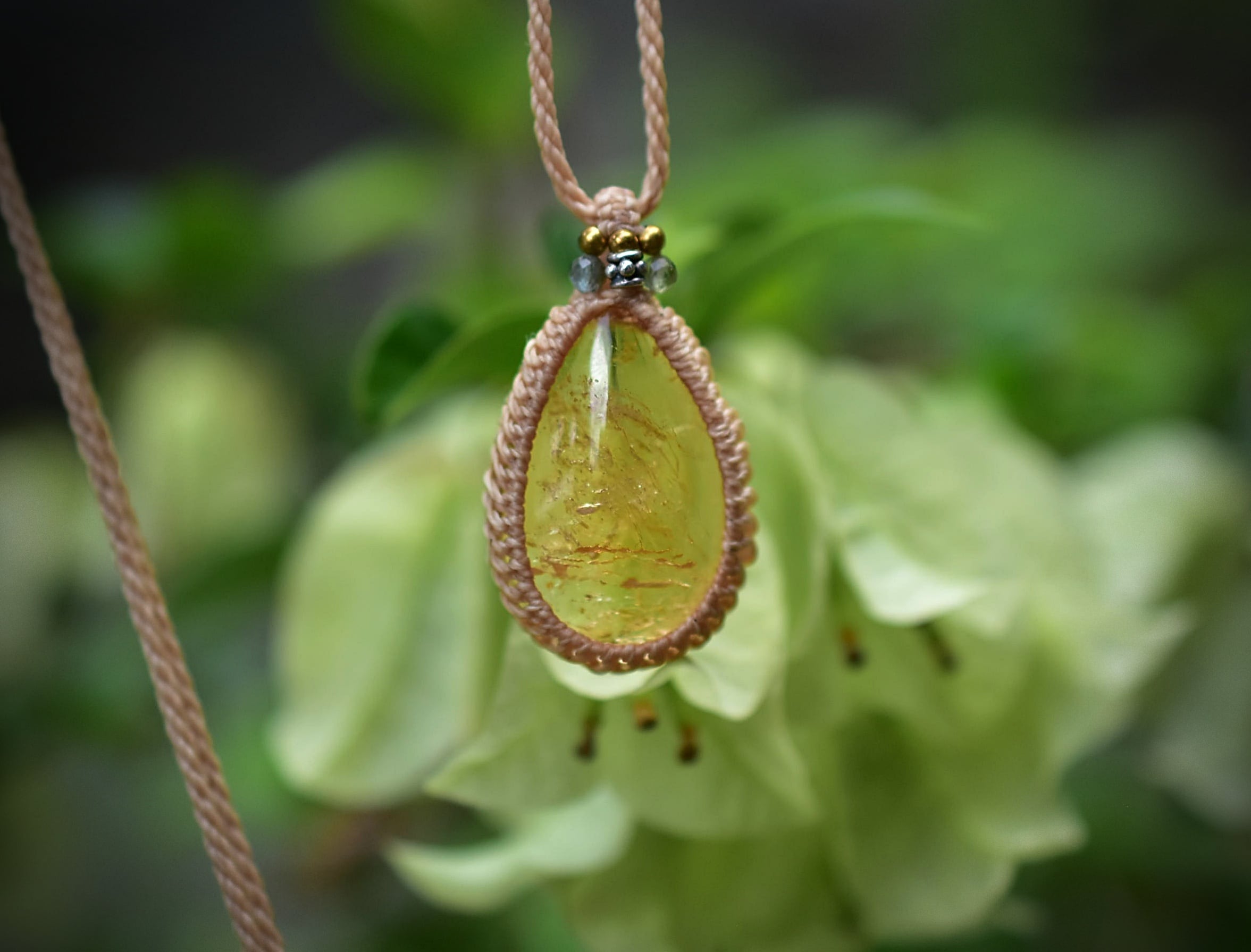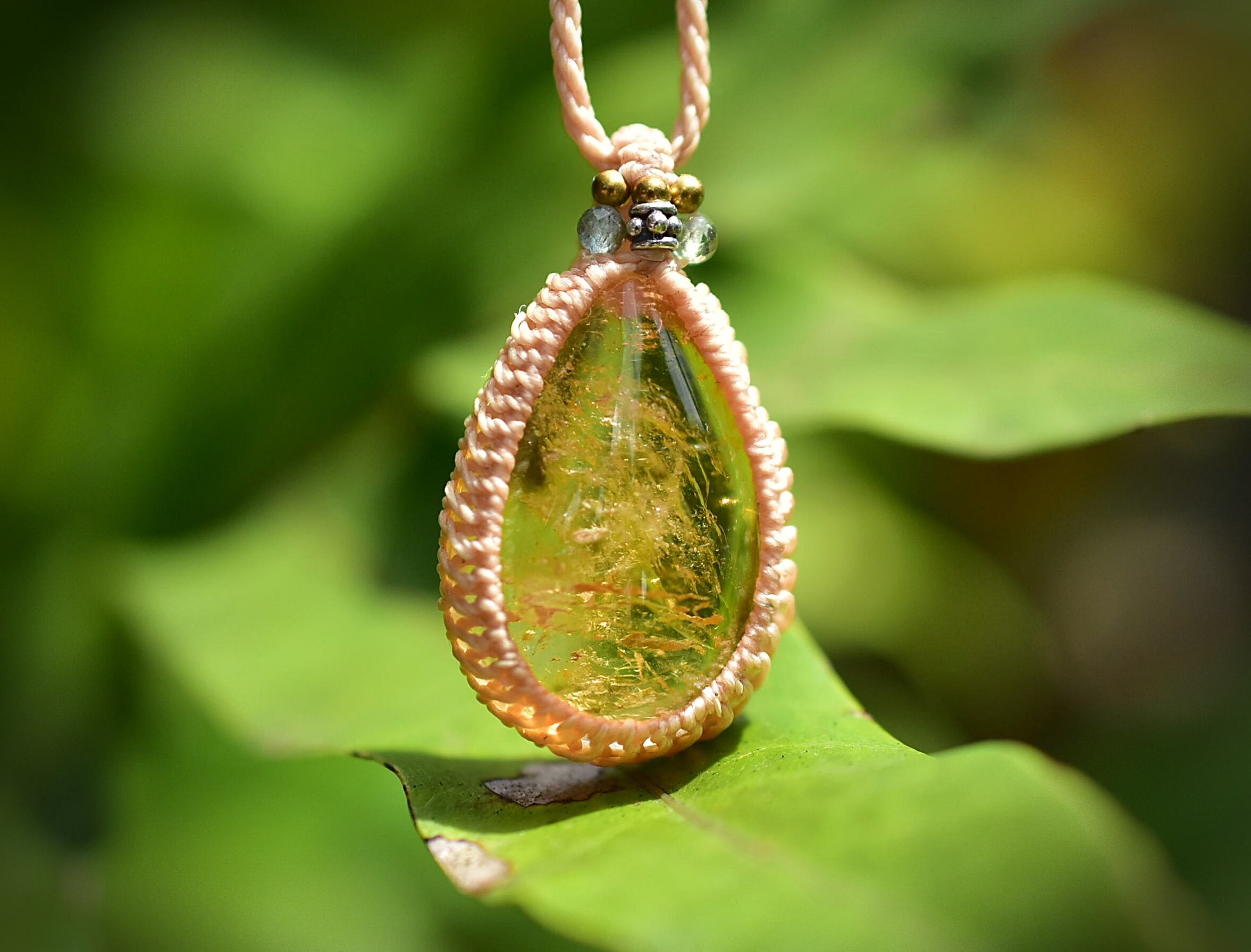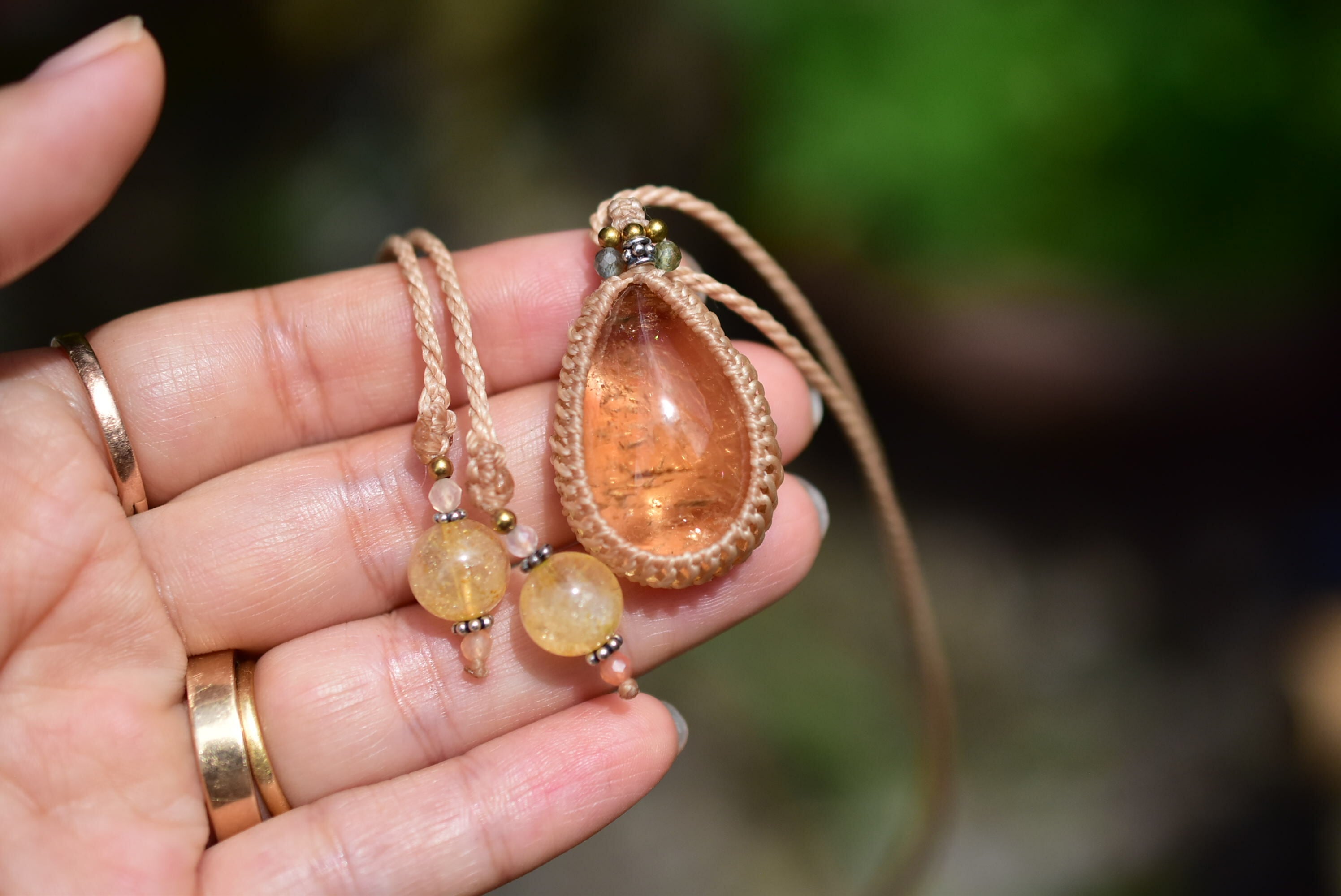 ◆このたびはキャラメル色の蝋引き糸を使用しマクラメ編み装飾を施しました。