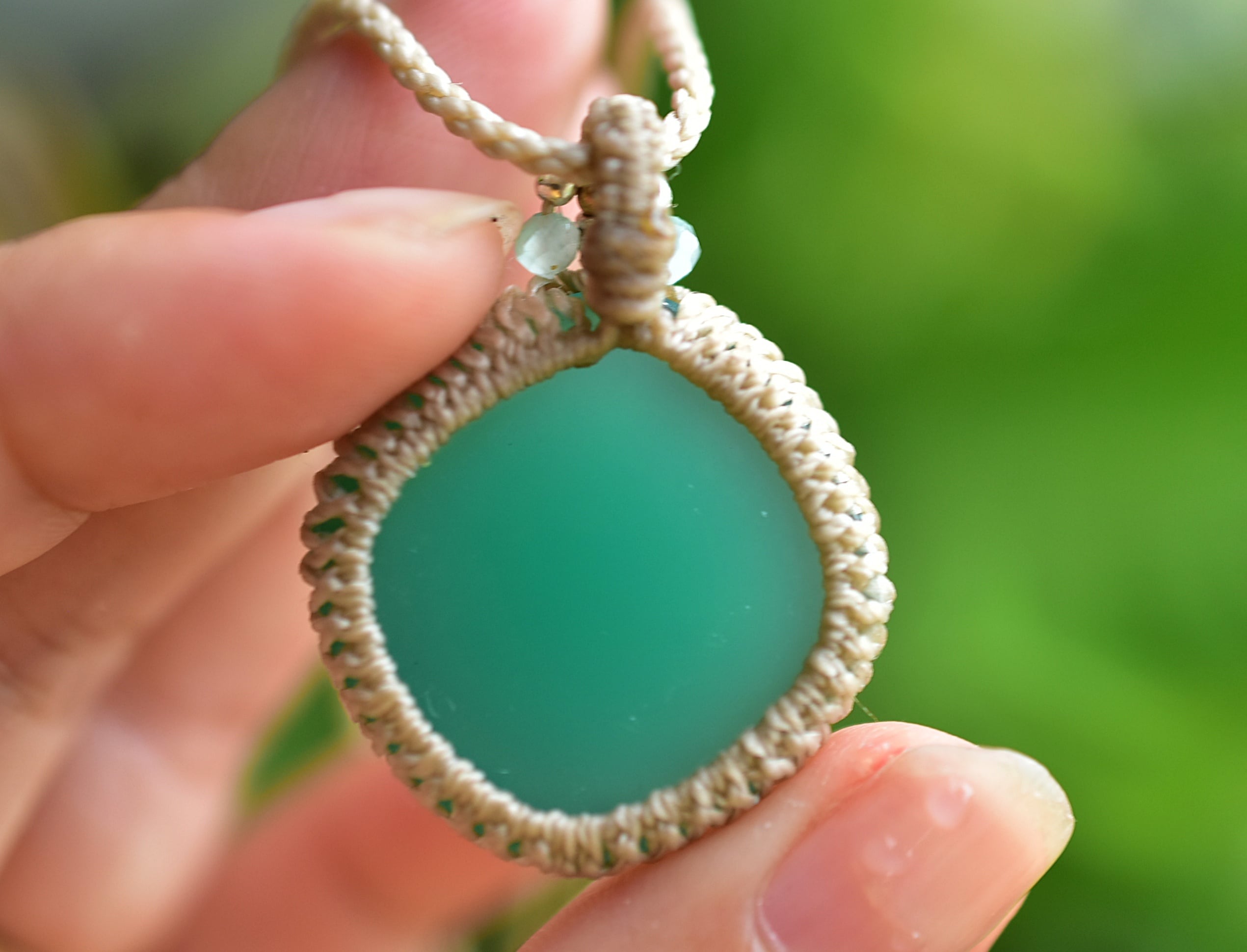 ◆このたびはヘンプ色の蝋引き糸を使用しマクラメ編み装飾を施しました。