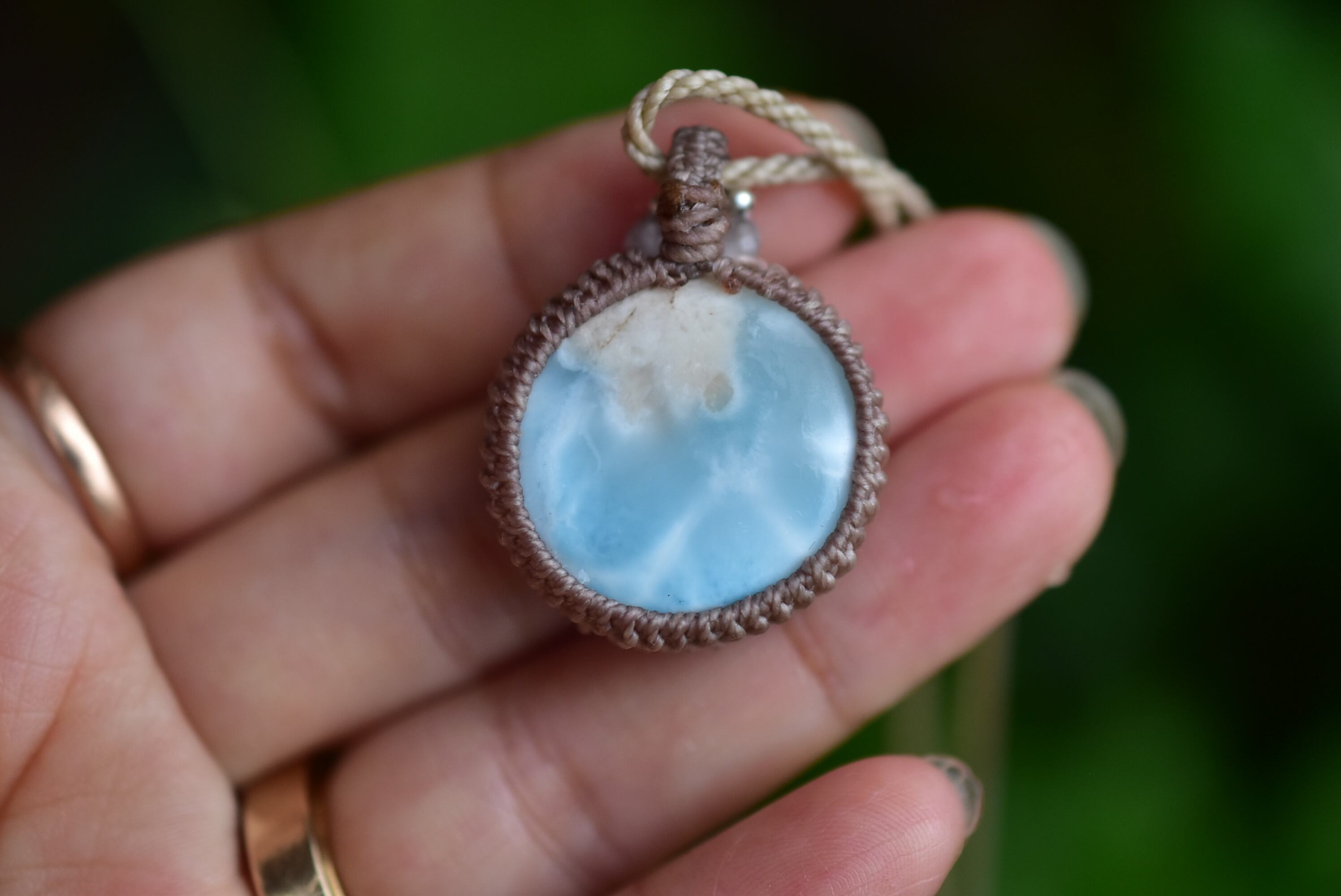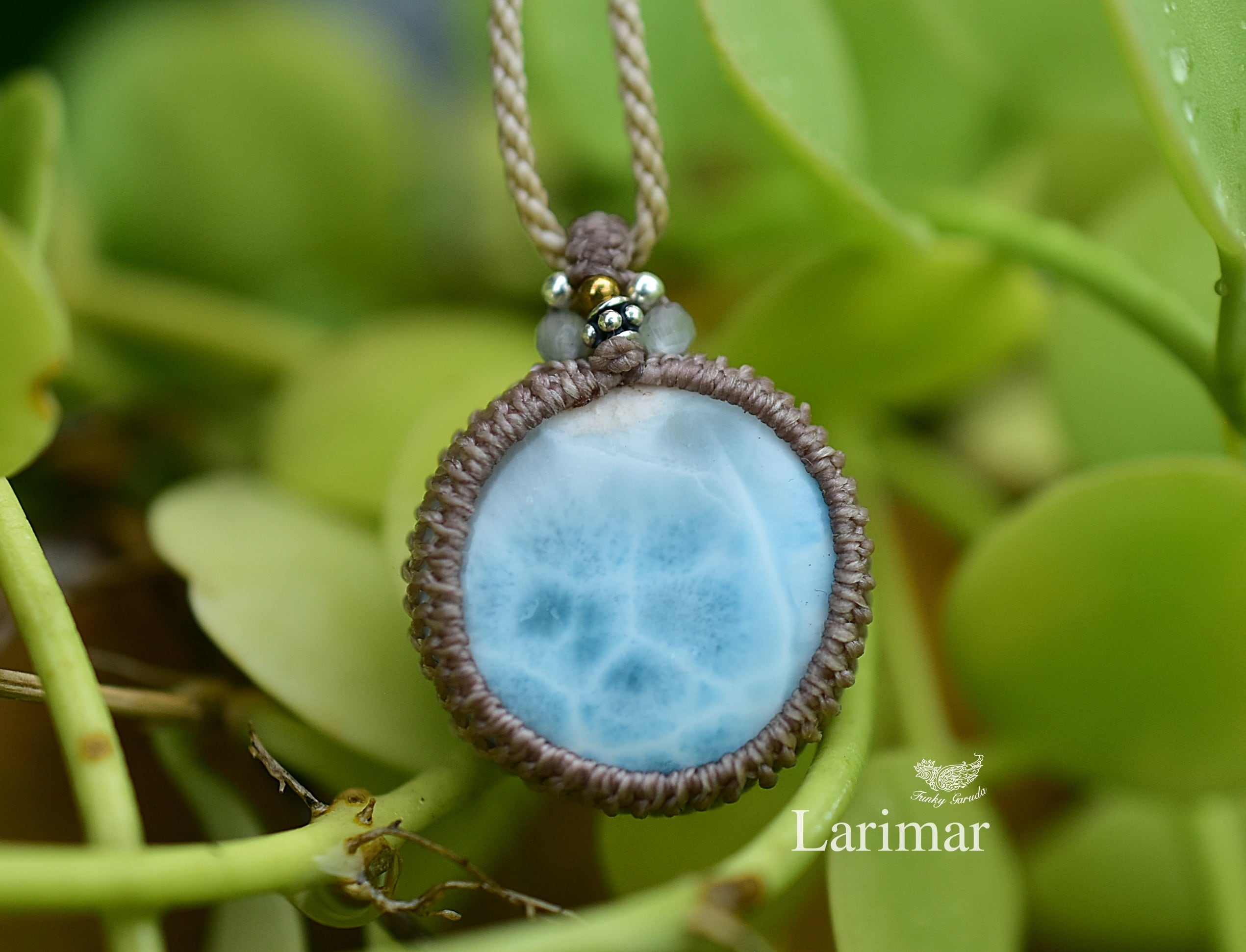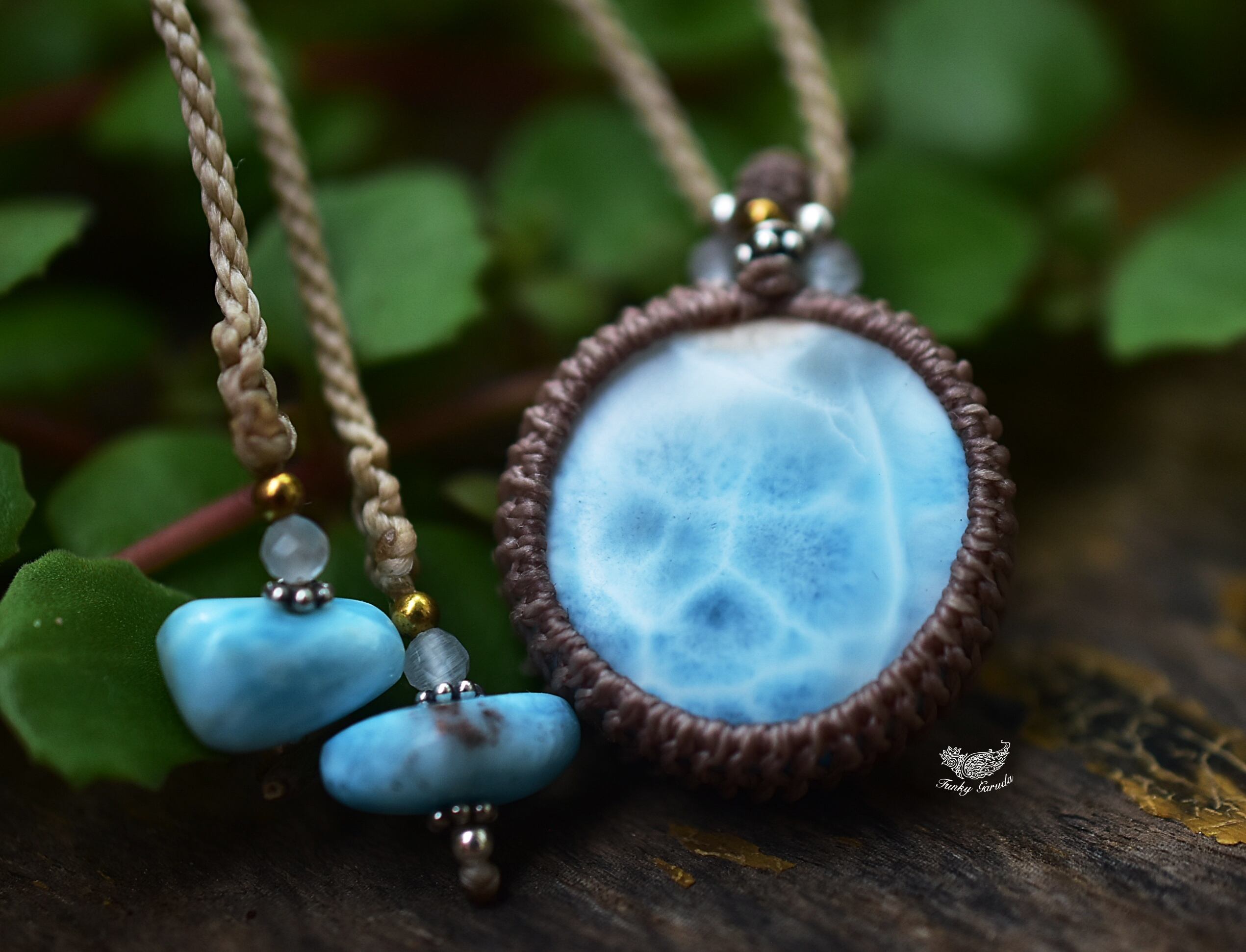 ◆このたびはカフェオレ、ヘンプ色の蝋引き糸を使用しマクラメ編み装飾を施しました。