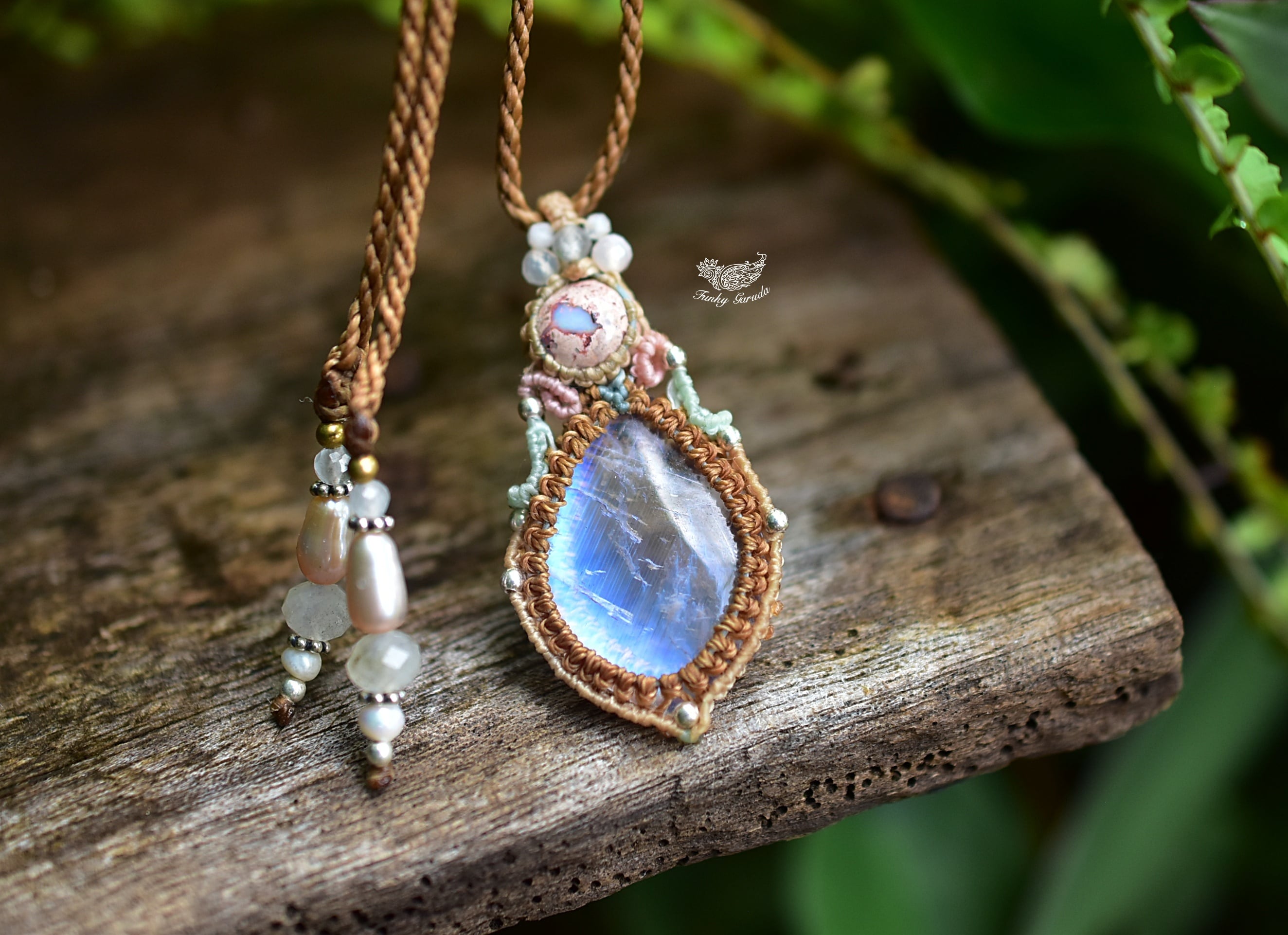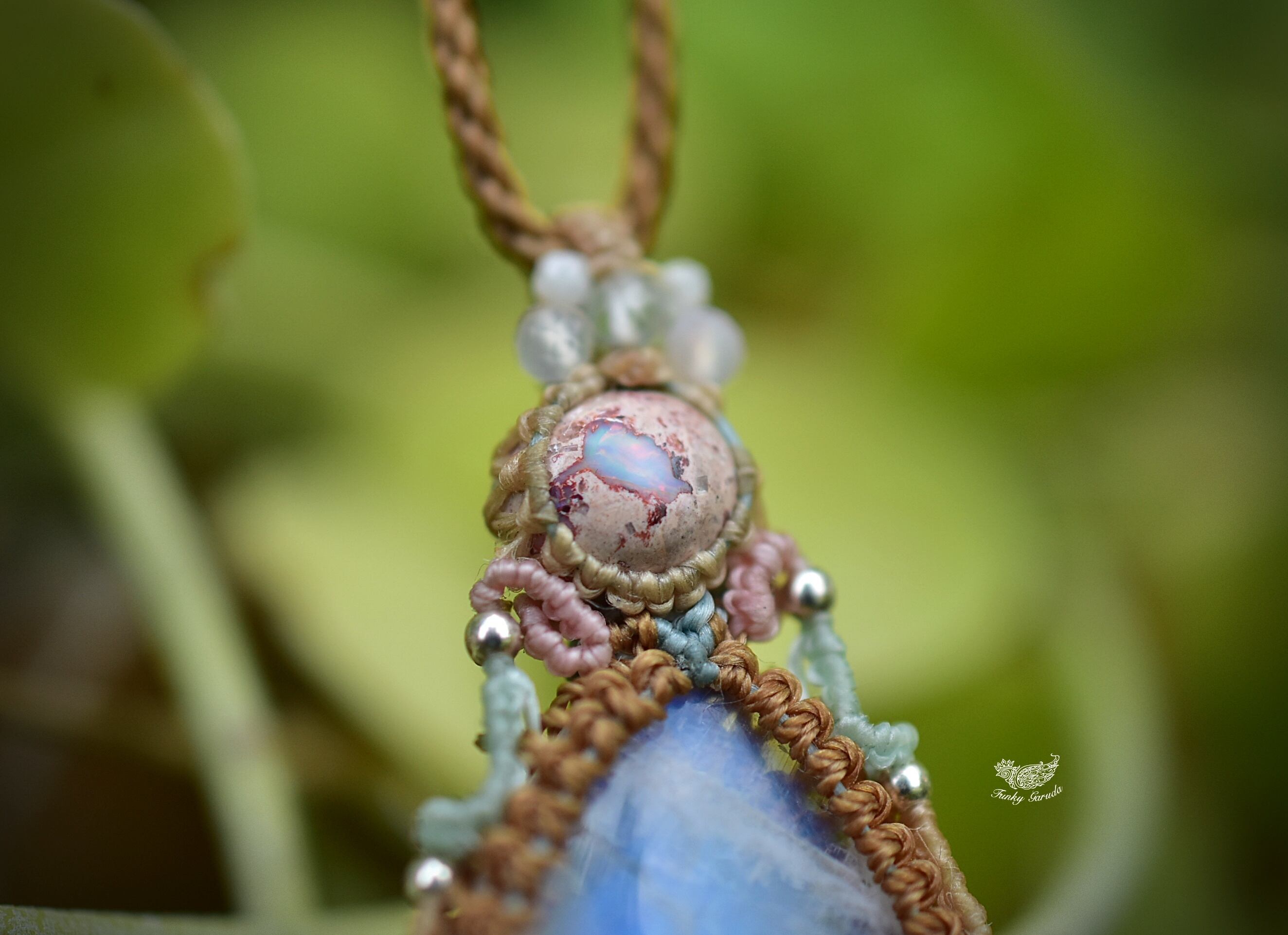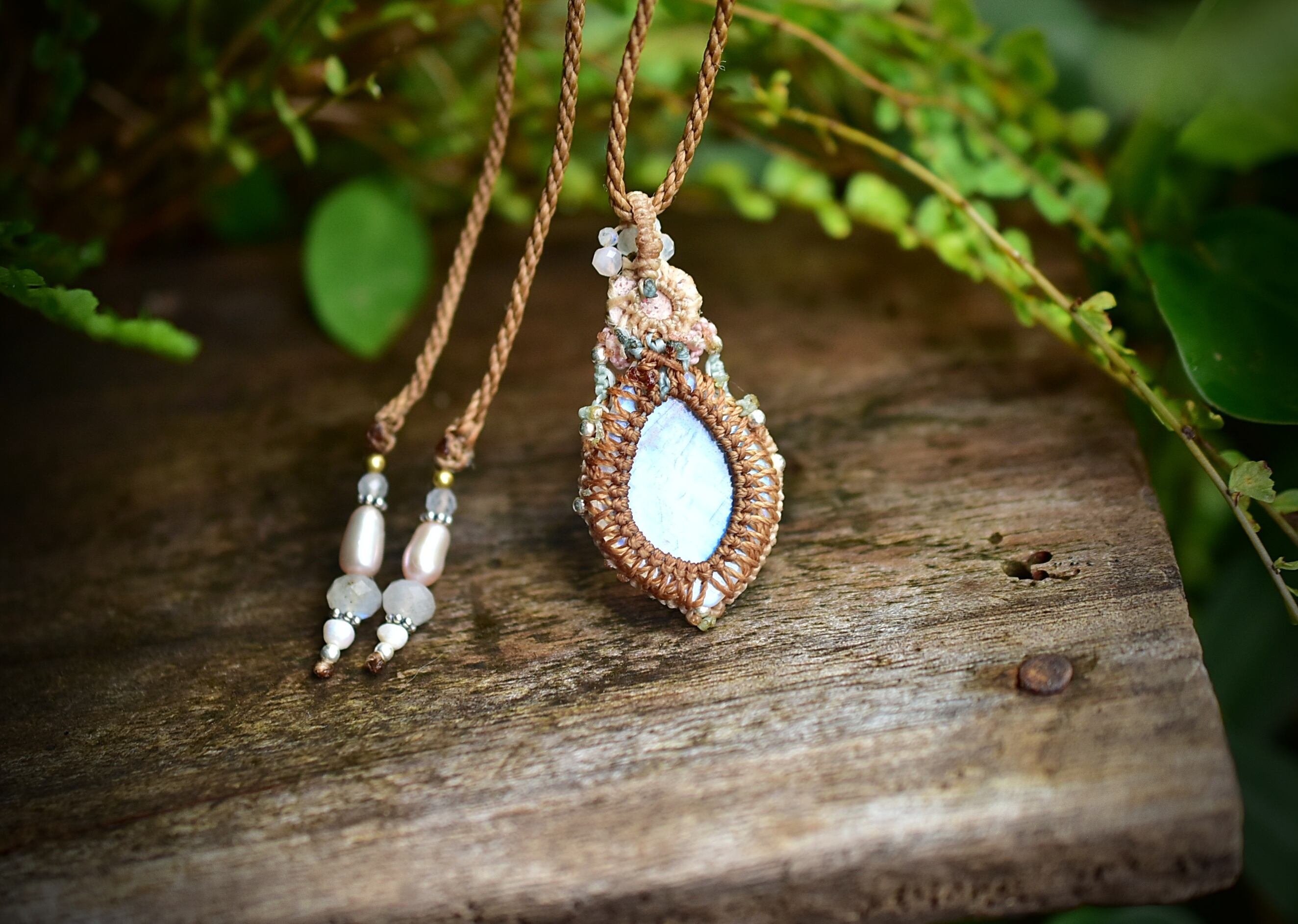 ◆このたびはカフェオレ・ナチュラルホワイト、ミント、ピンク、ゴールドブラウン色の蝋引き糸を使用しマクラメ編み装飾を施しました。