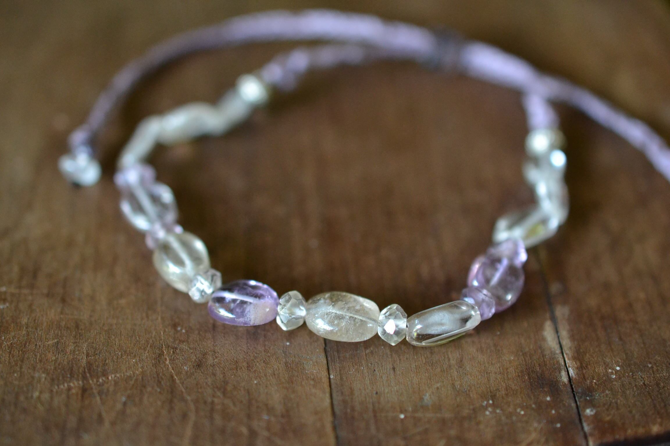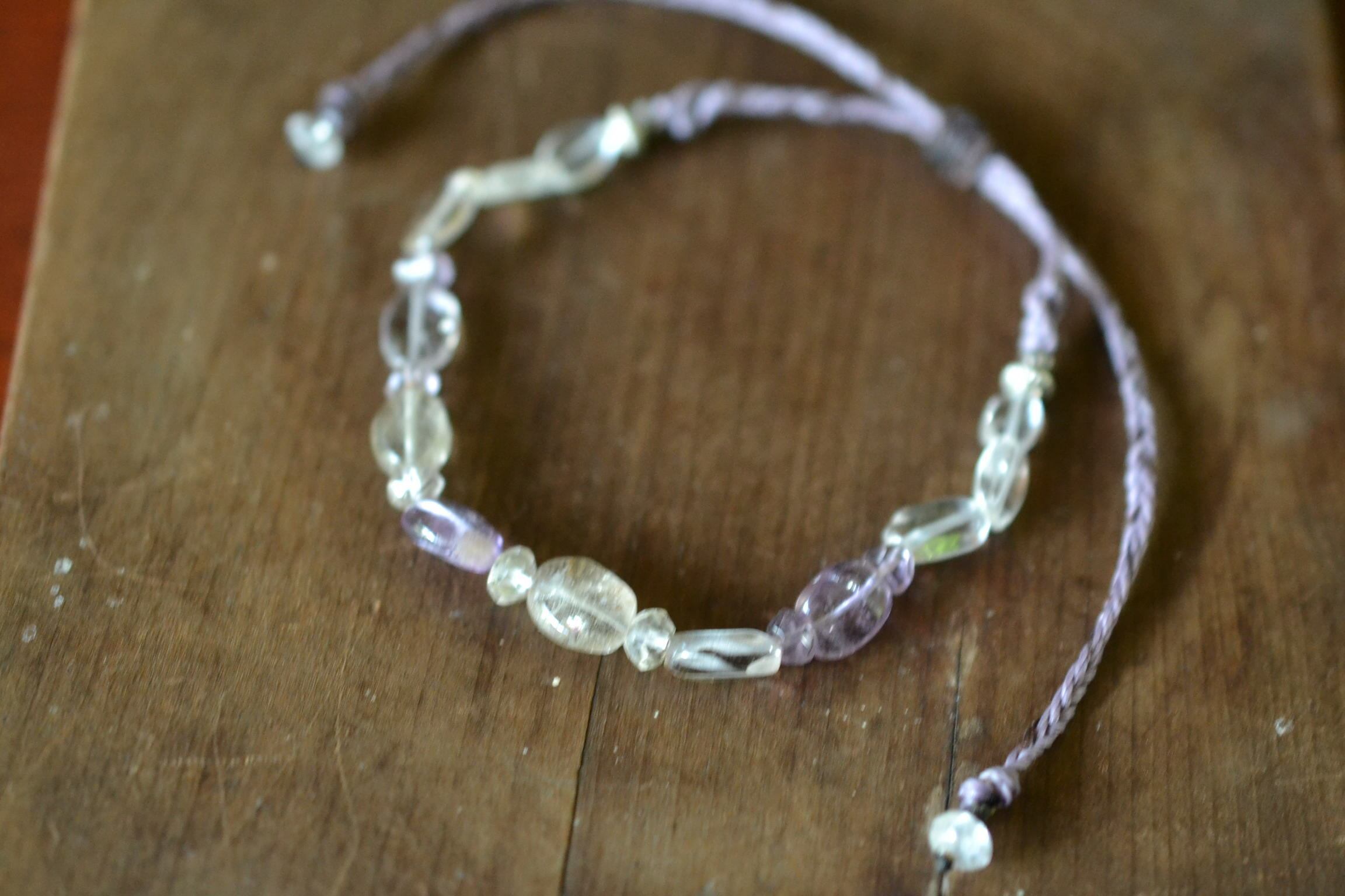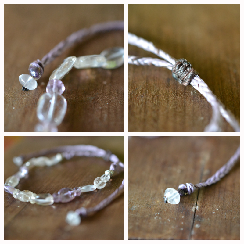 アメジストビーズ、スモーキークォーツ、クリアクォーツ、などを組み合わせて
