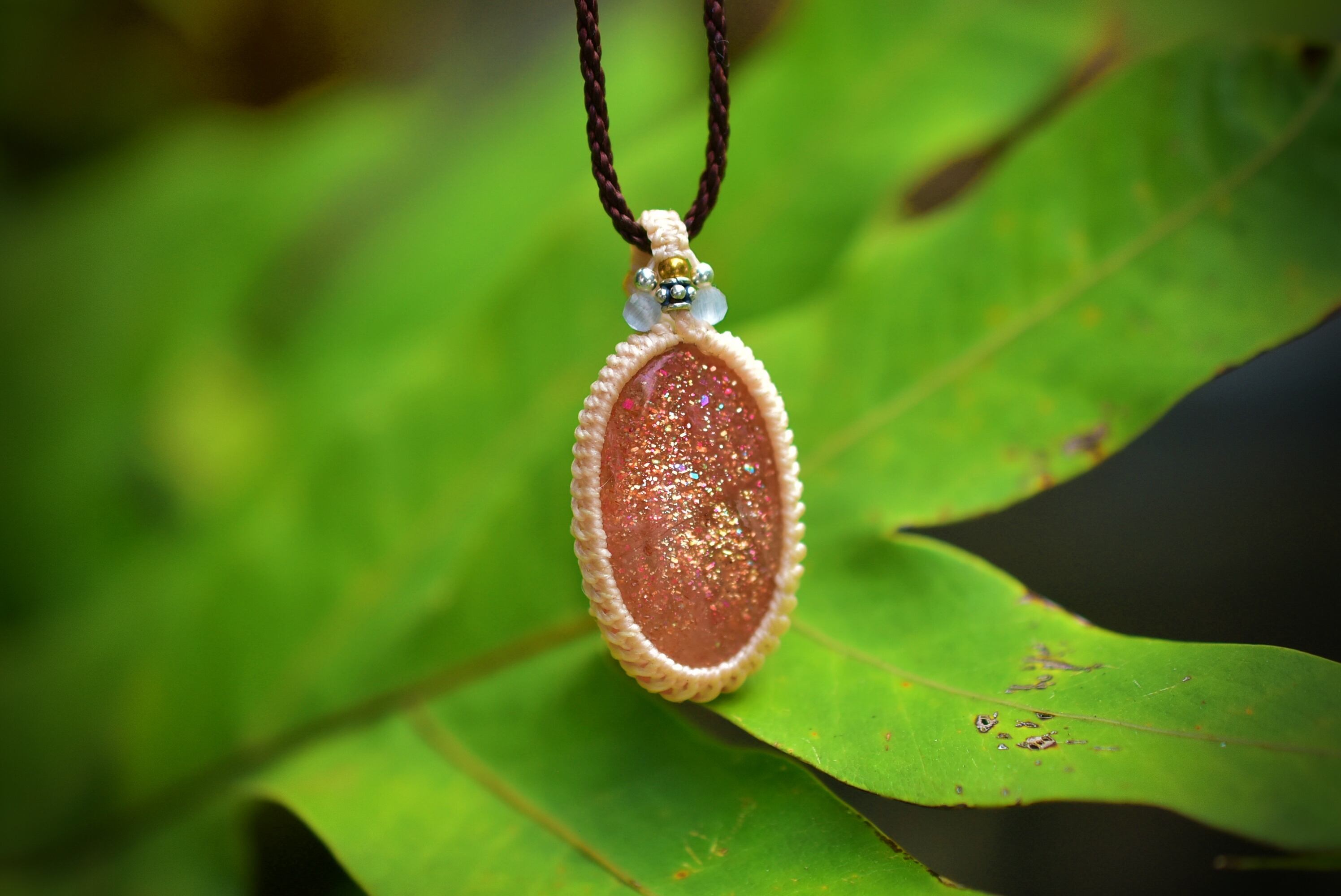 ◆このたびはナチュラルホワイト・ブラウン色の蝋引き糸を使用しマクラメ編み装飾を施しました。