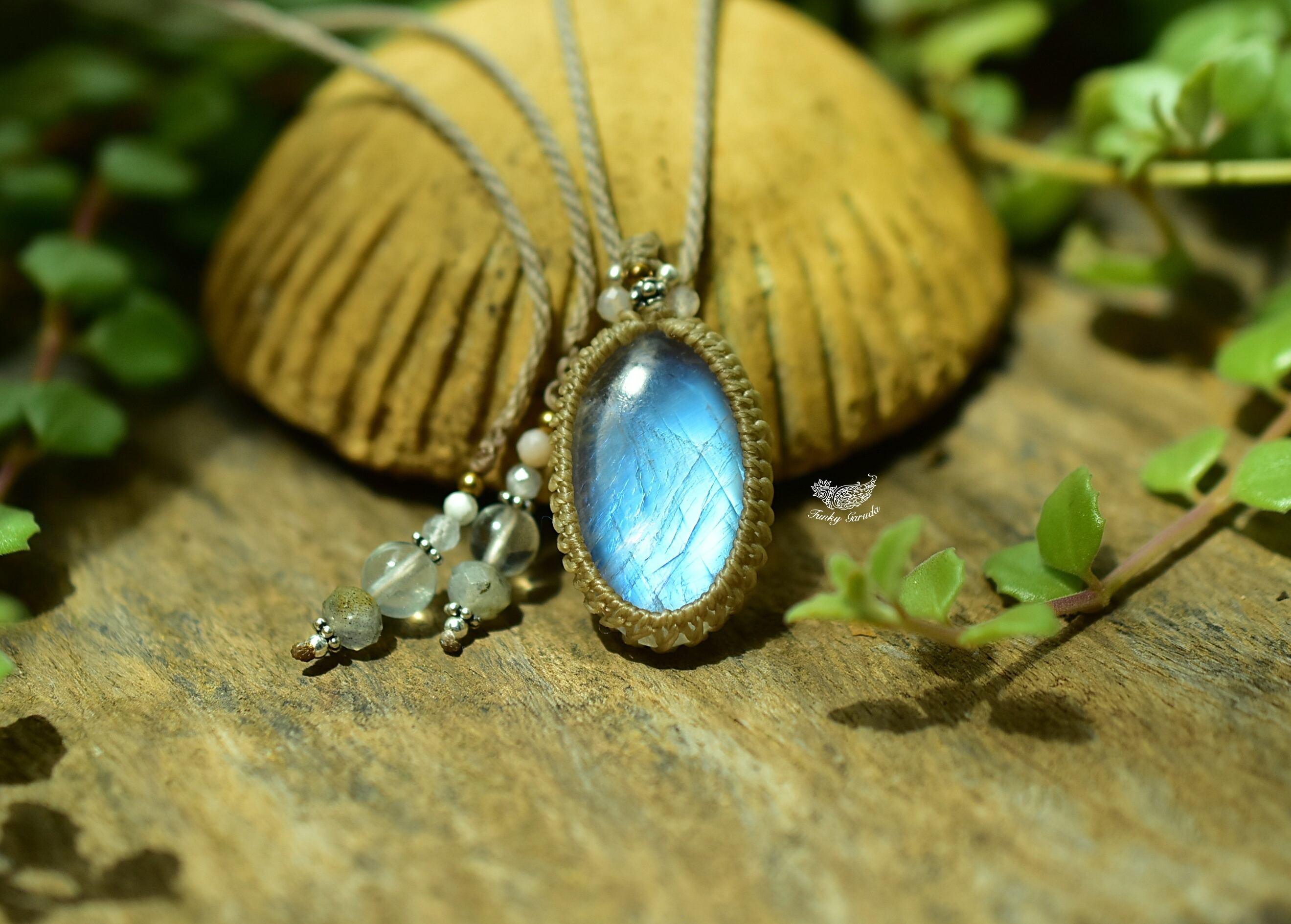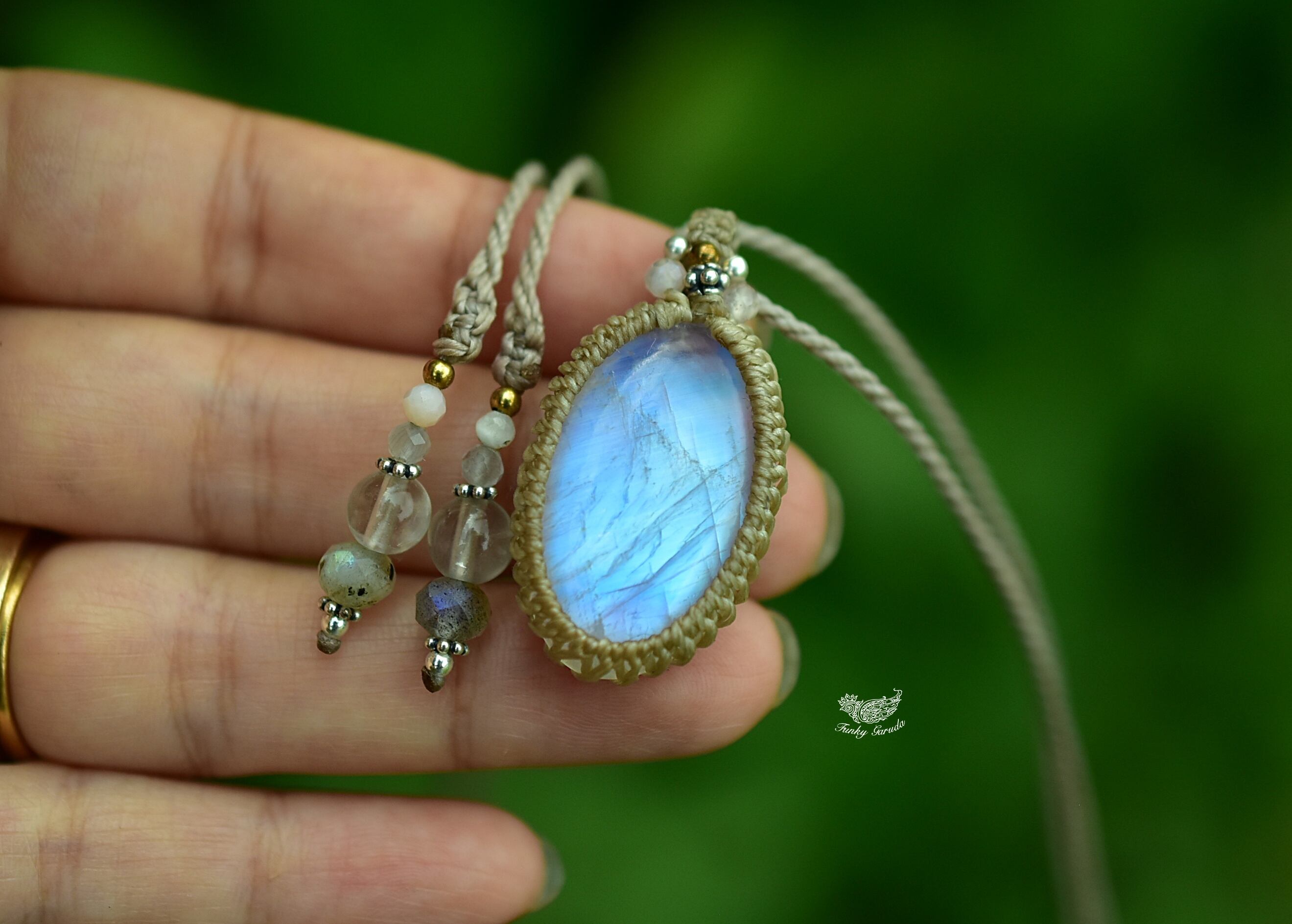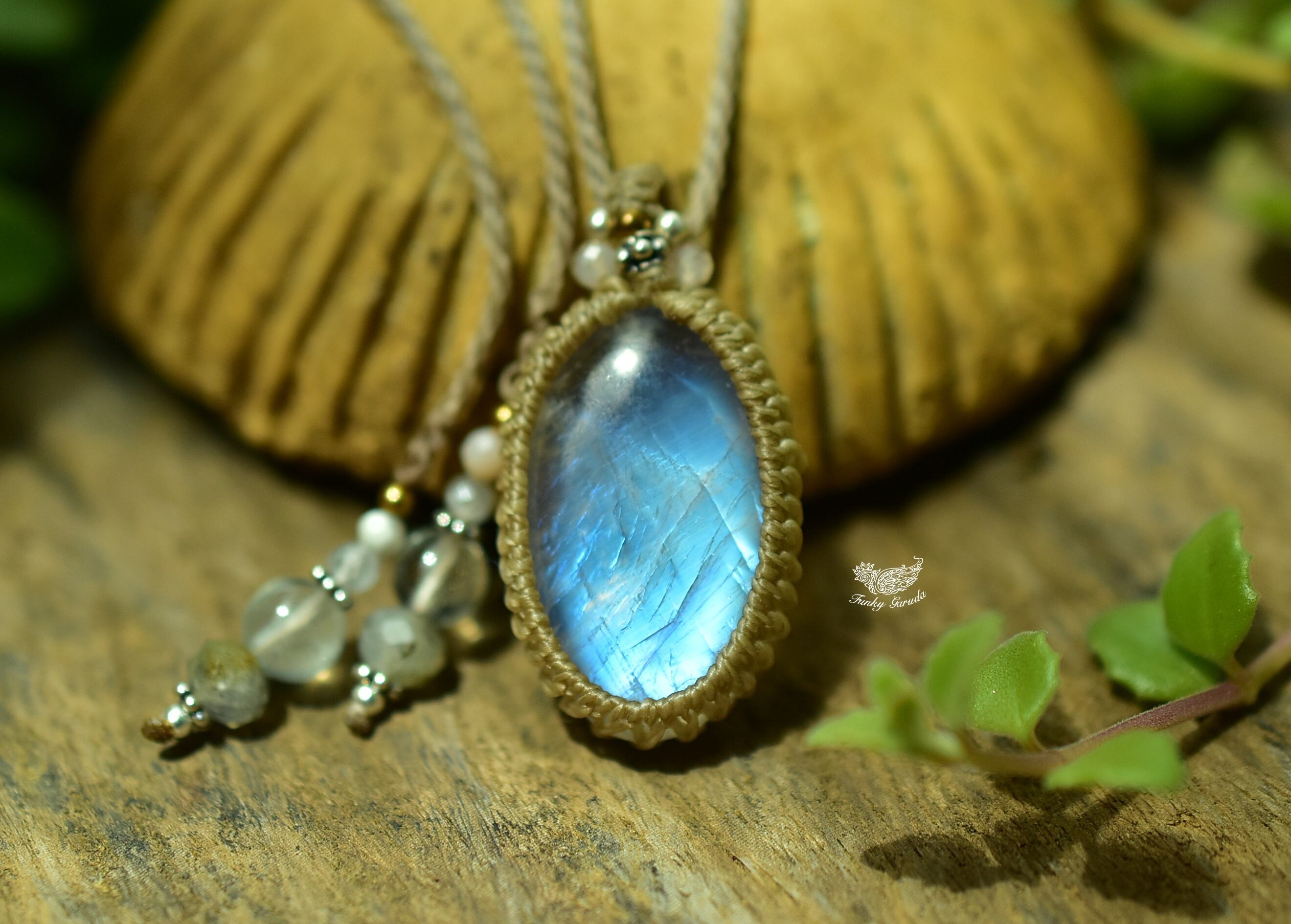 幻想ブルー★高品質★レインボームーンストーン マクラメペンダント714
