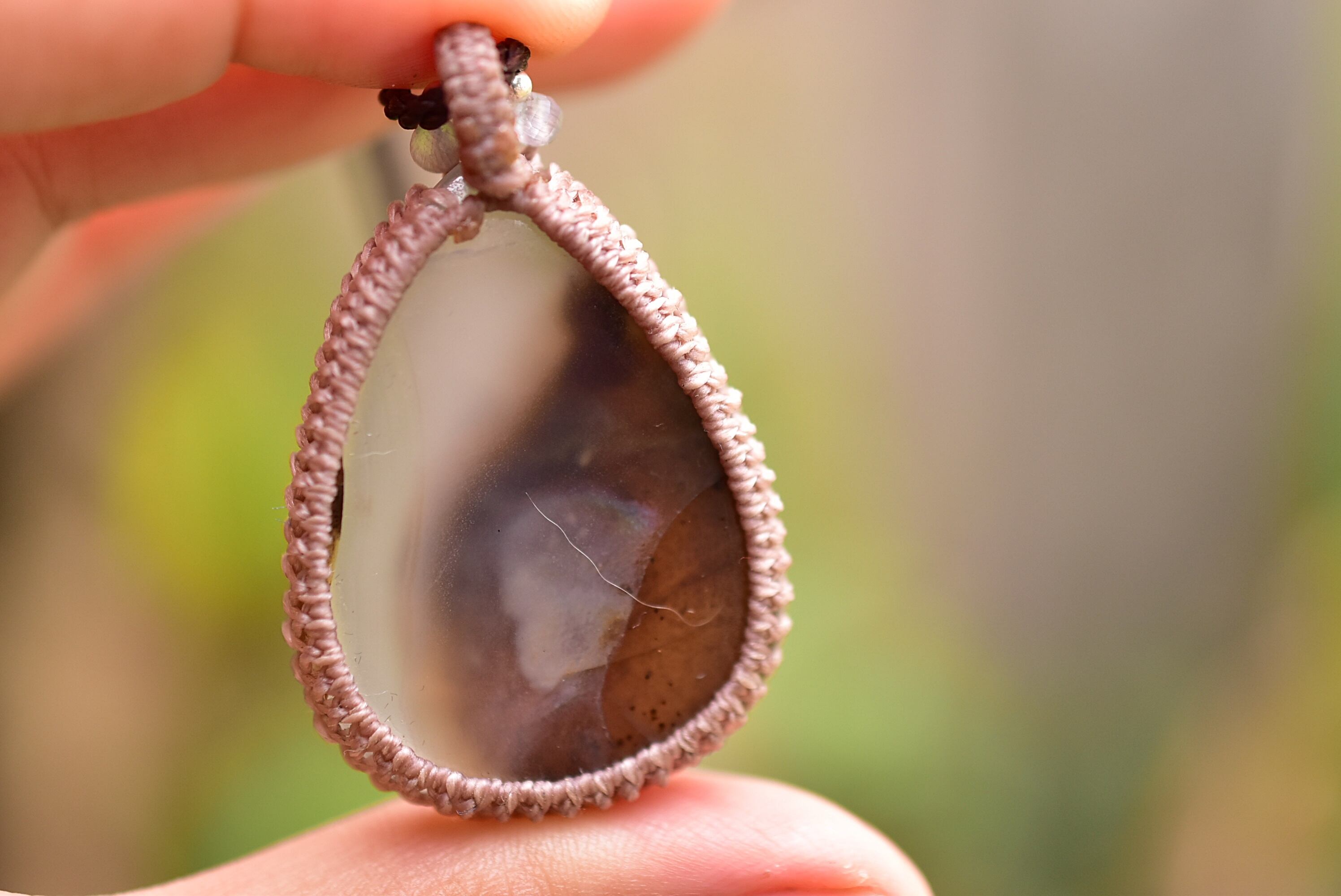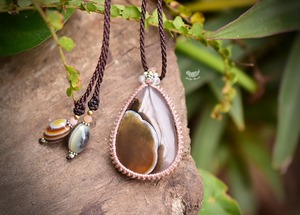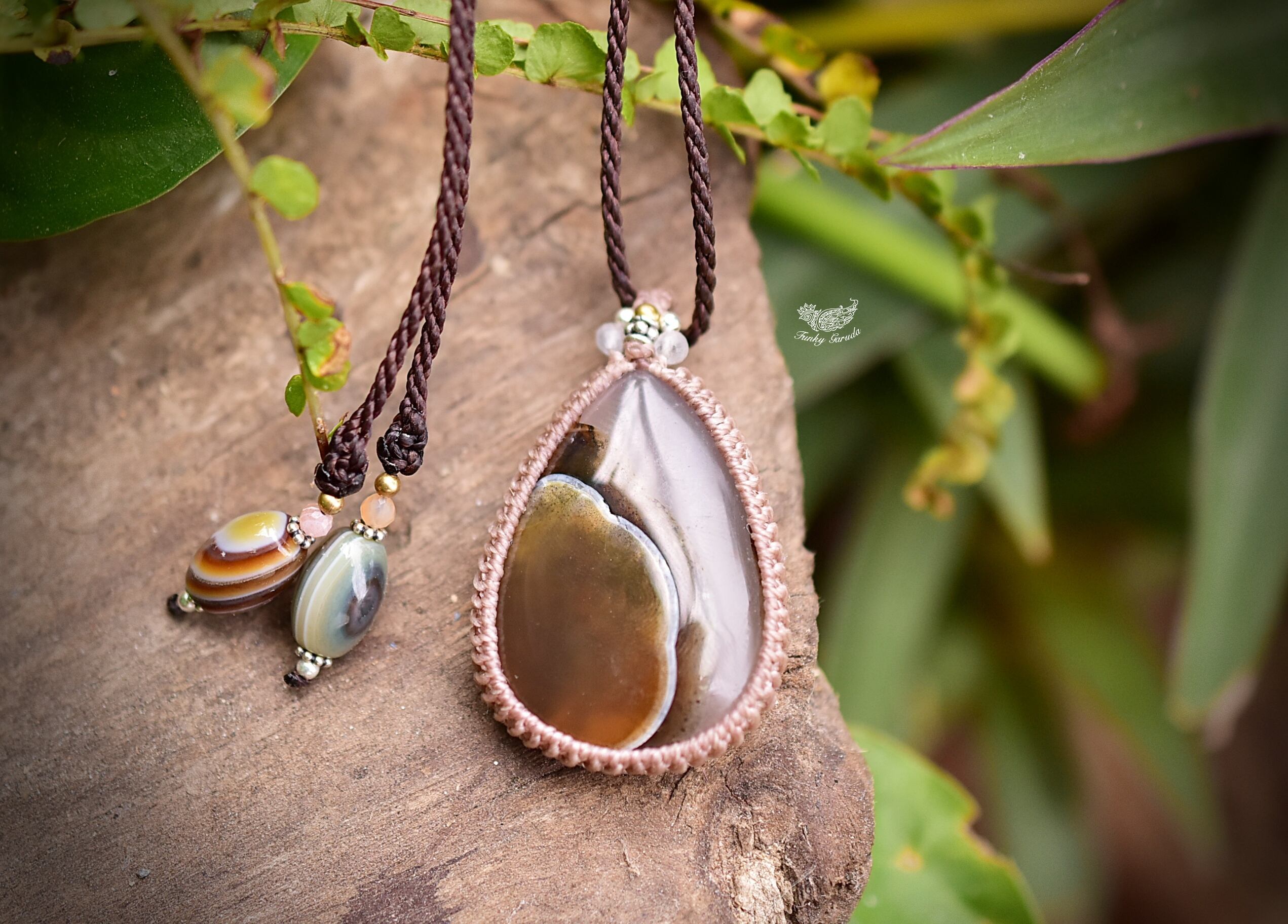 ◆このたびはブラウン、ミルクココア色の蝋引き糸を使用しマクラメ編み装飾を施しました。