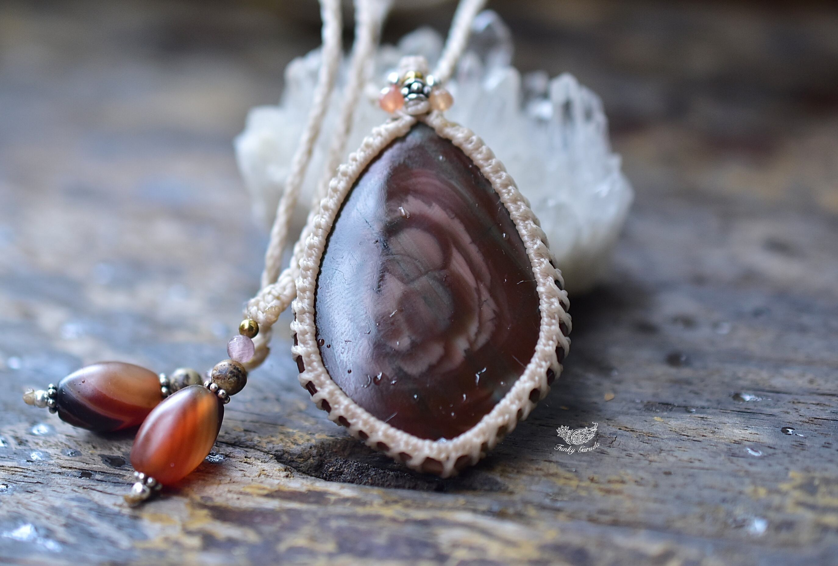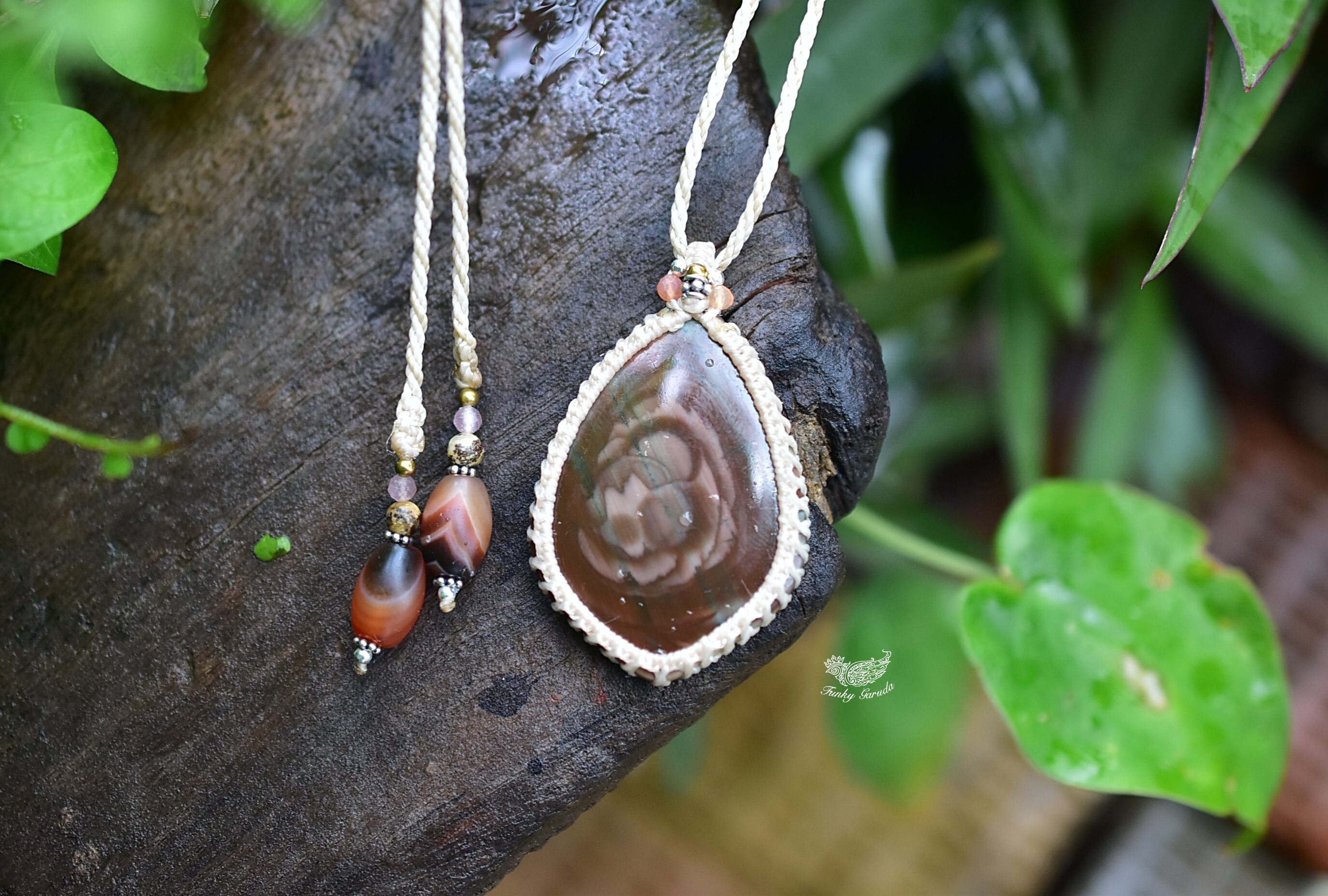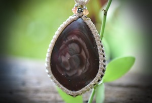 ◆このたびはナチュラルホワイト色の蝋引き糸を使用しマクラメ編み装飾を施しました。