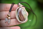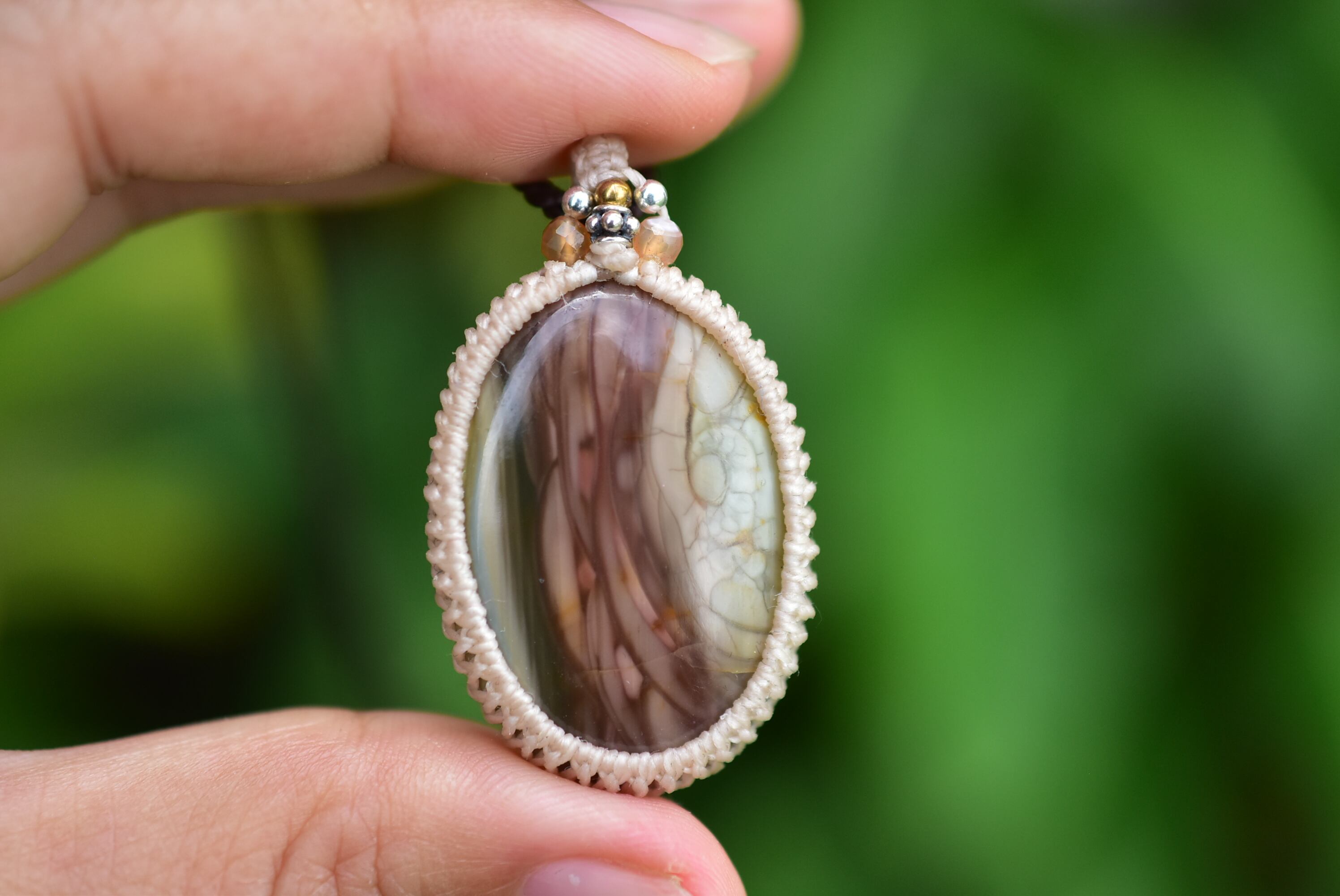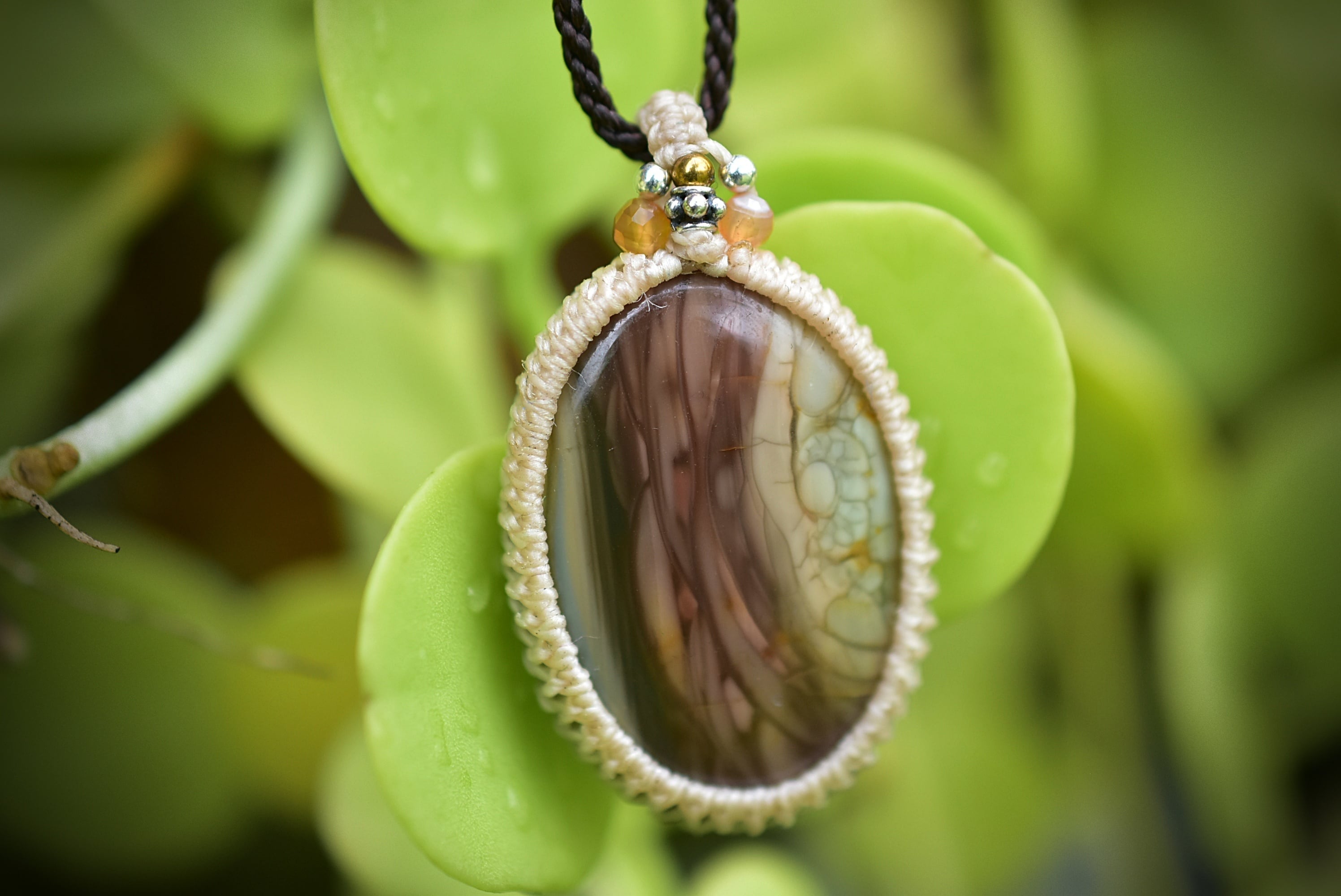 ◆このたびはホワイト、ブラウンの2色の蝋引き糸を使用しマクラメ編み装飾を施しました。