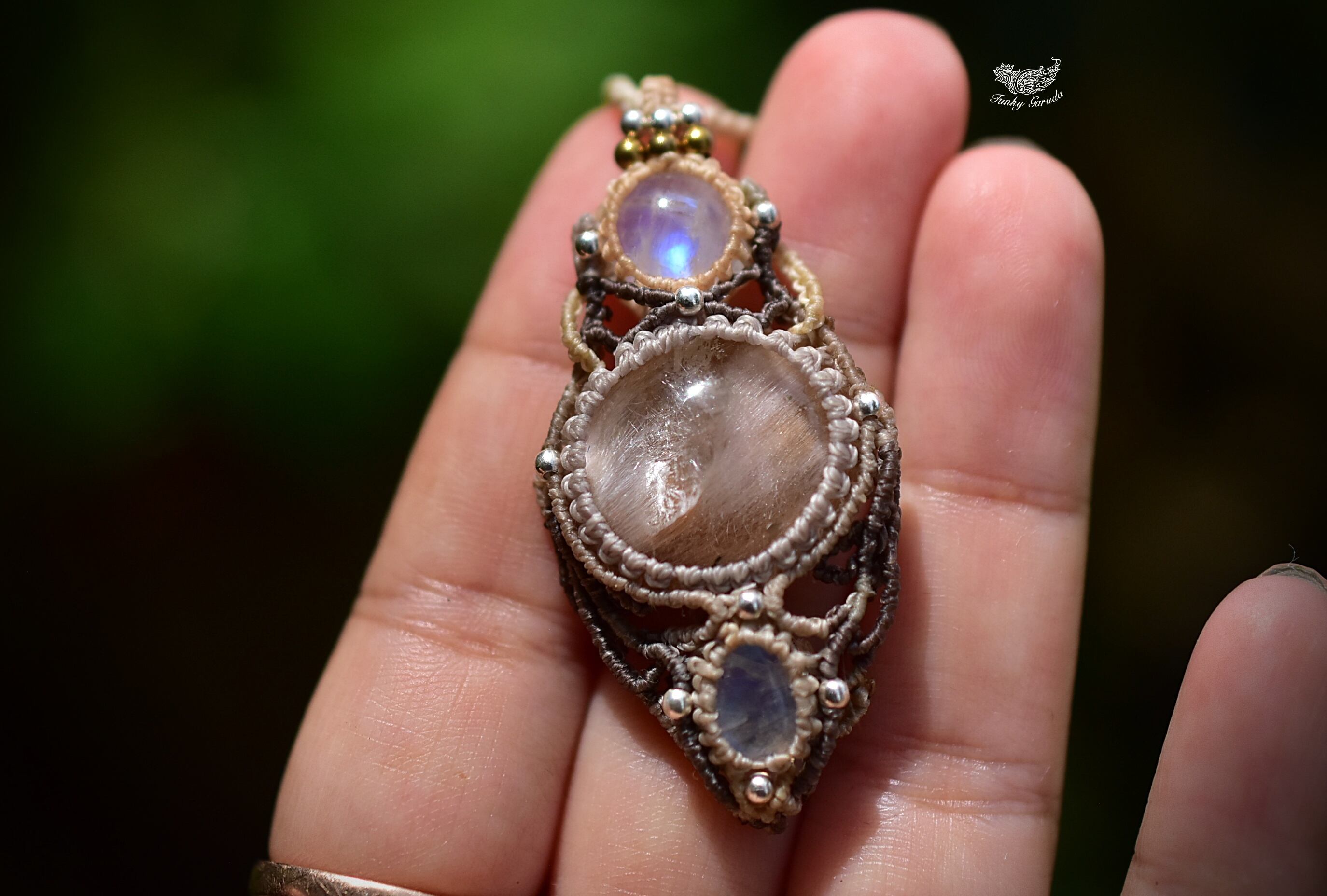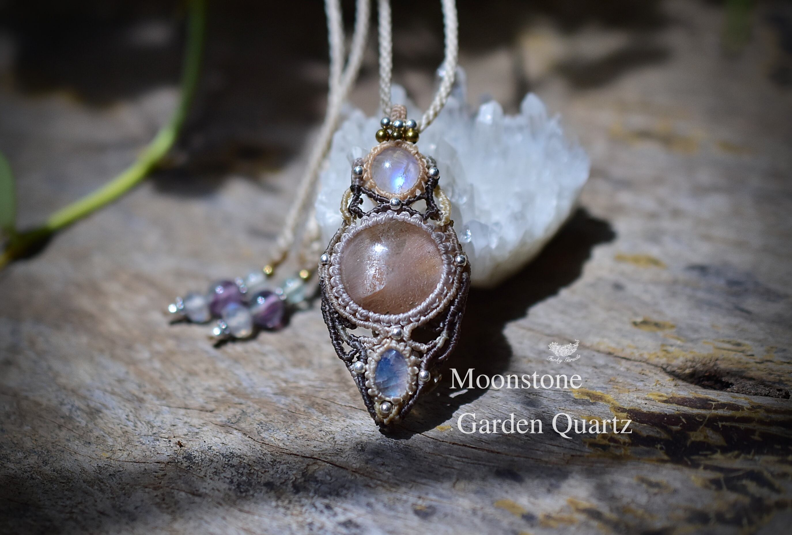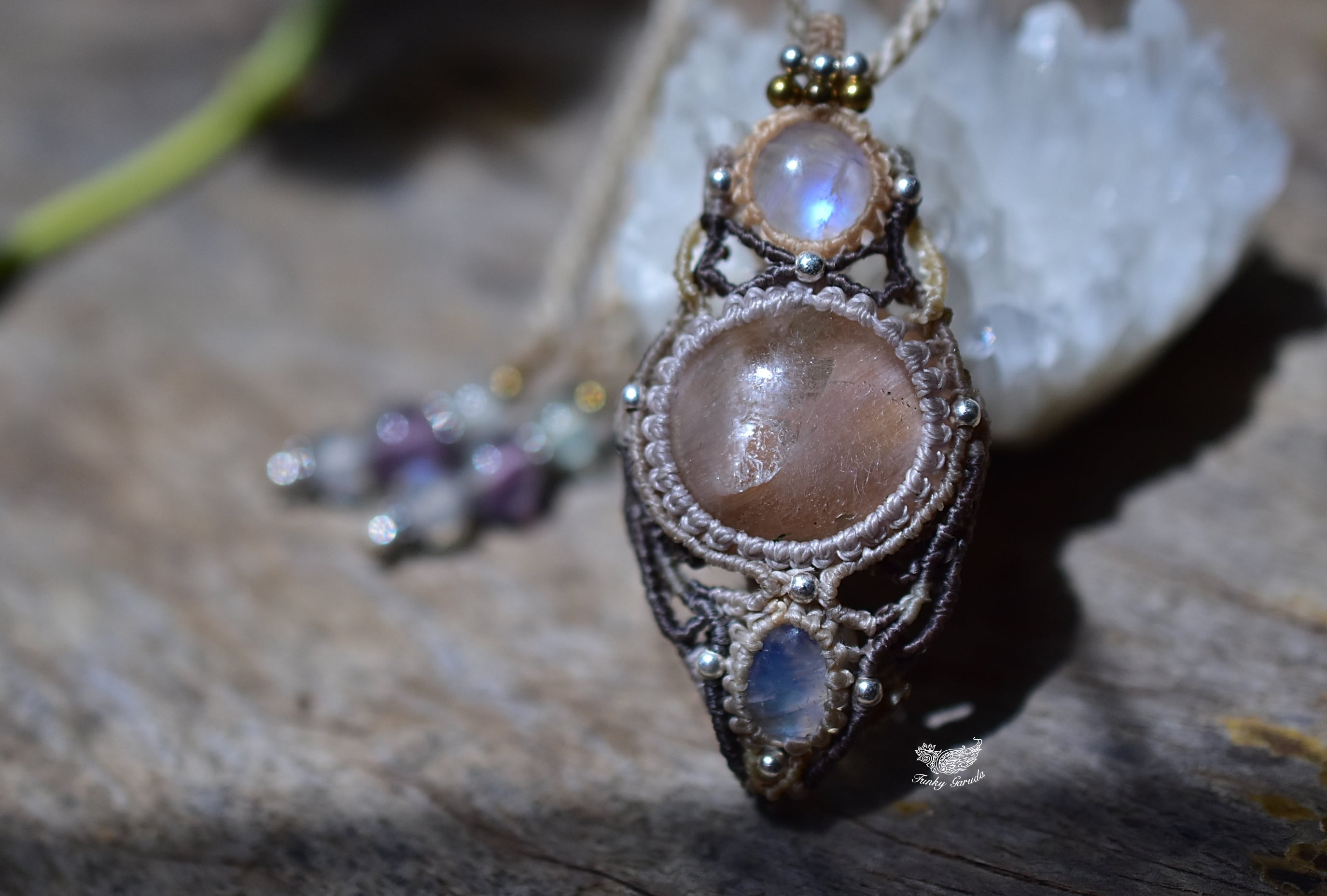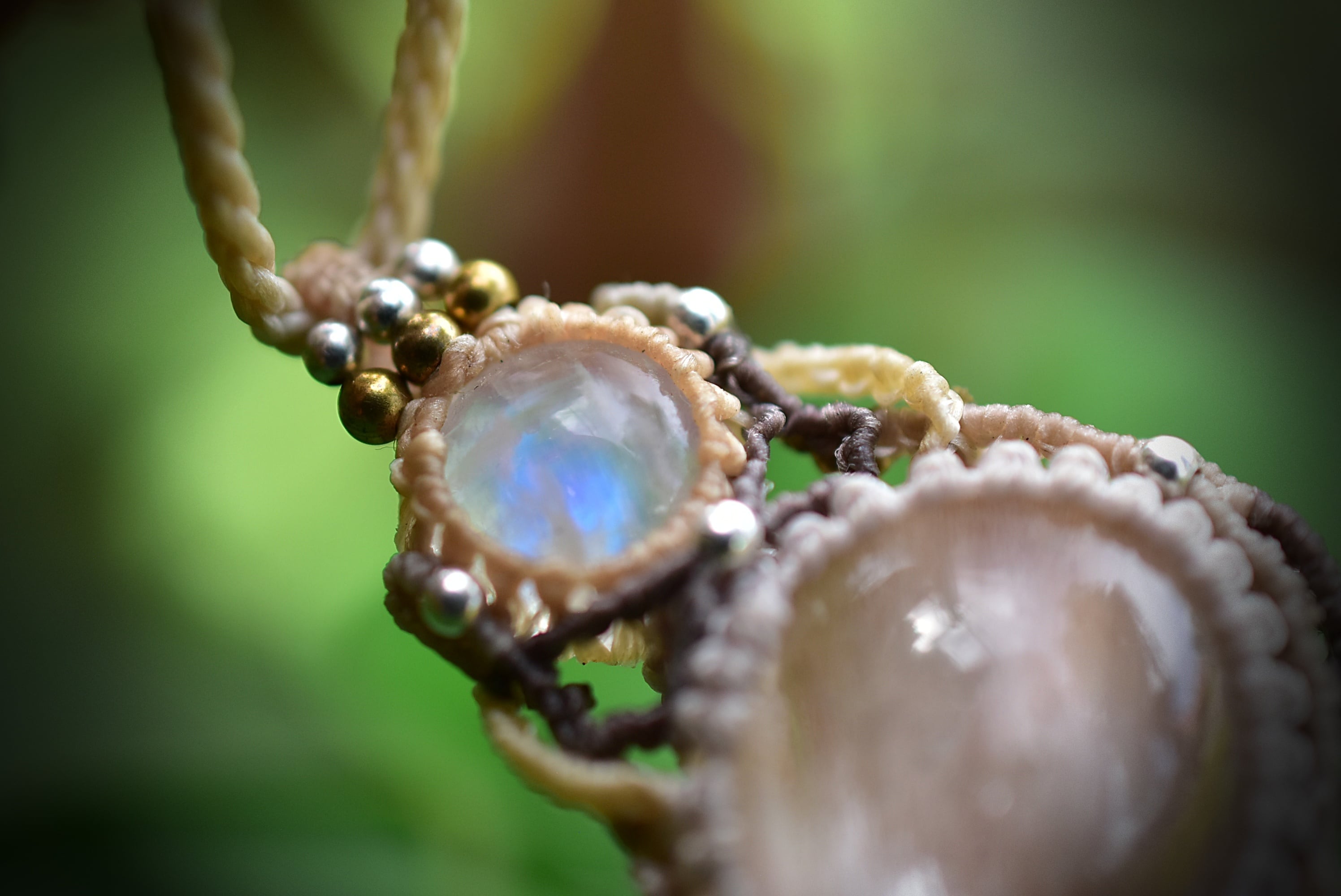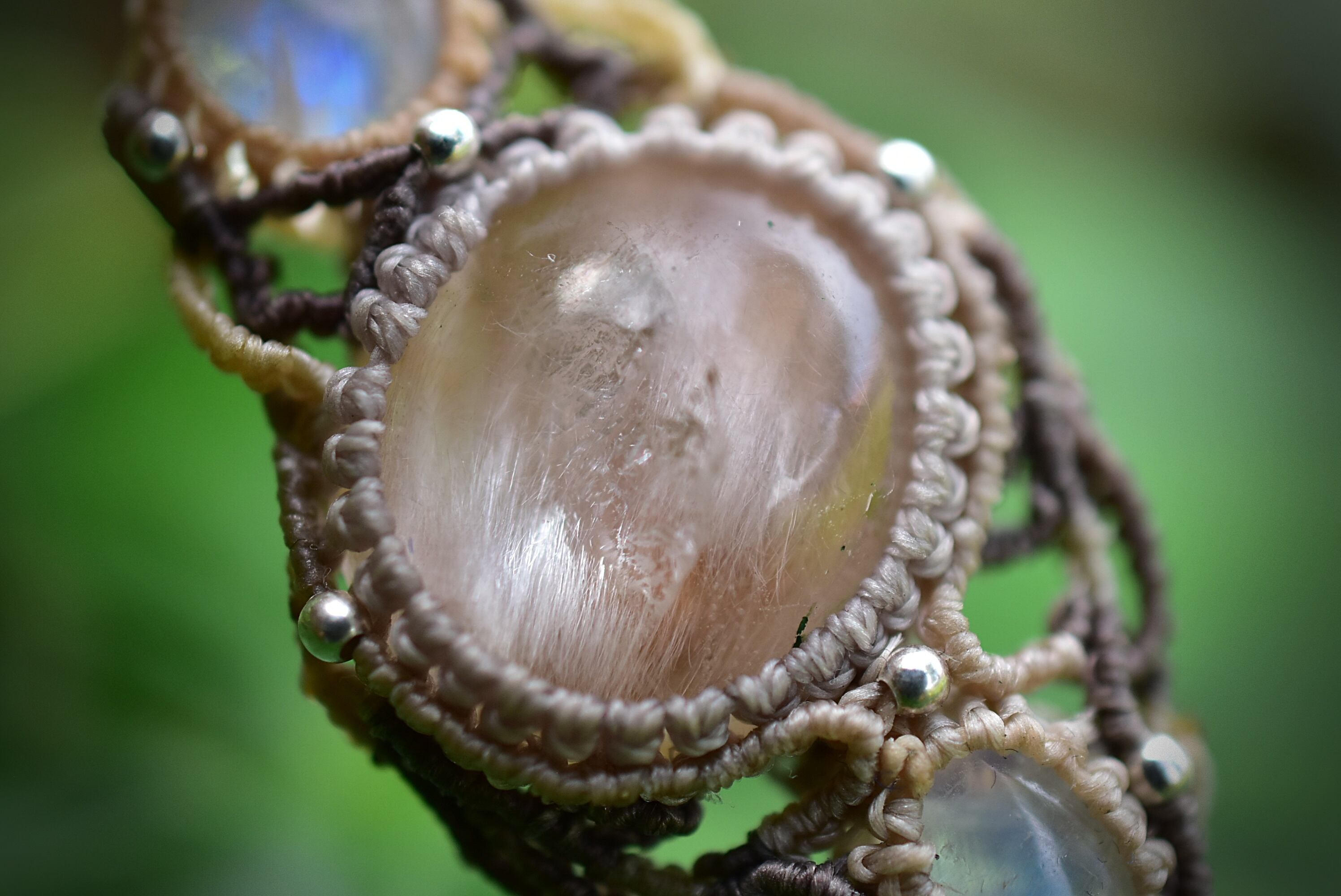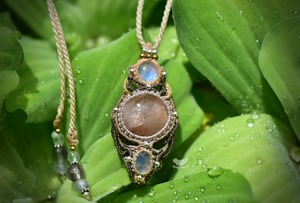 レインボームーンストーンを結び、マクラメ編み装飾。