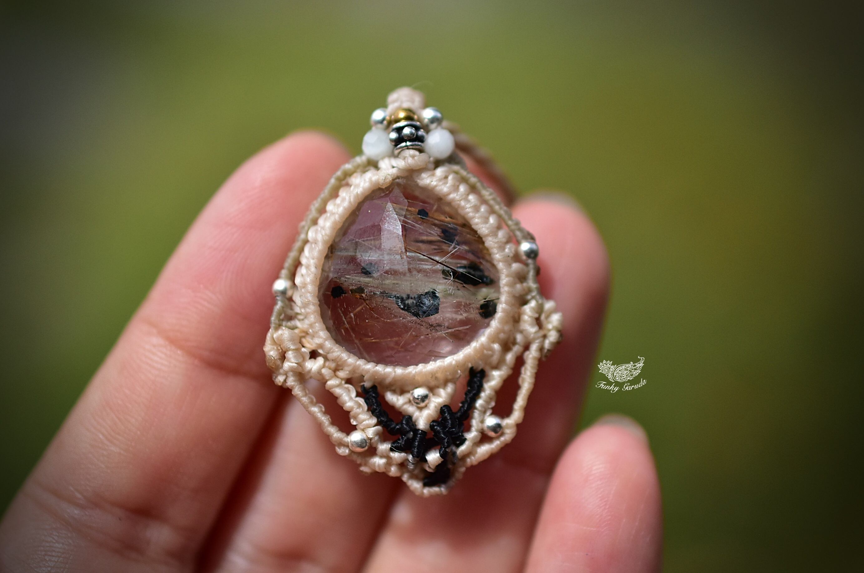 ◆このたびはナチュラルホワイト、キナリ、ブラック色の蝋引き糸を使用しマクラメ編み装飾を施しました。