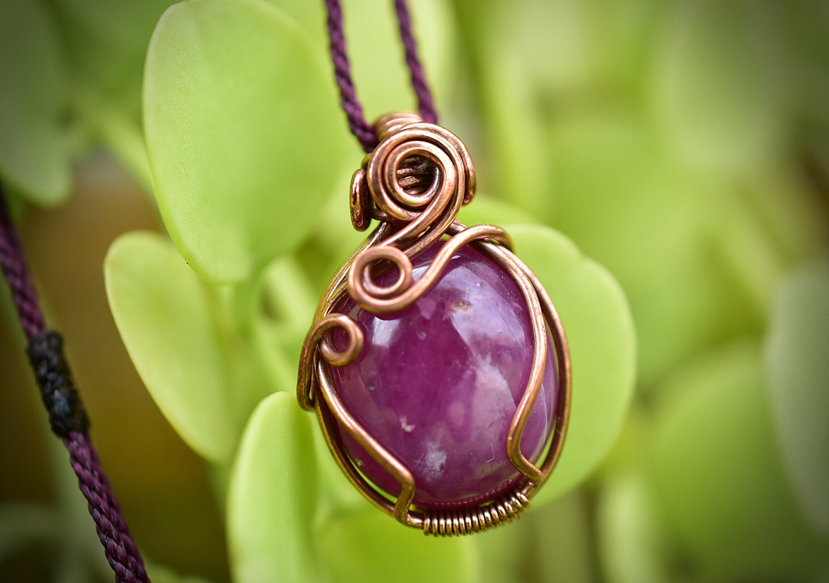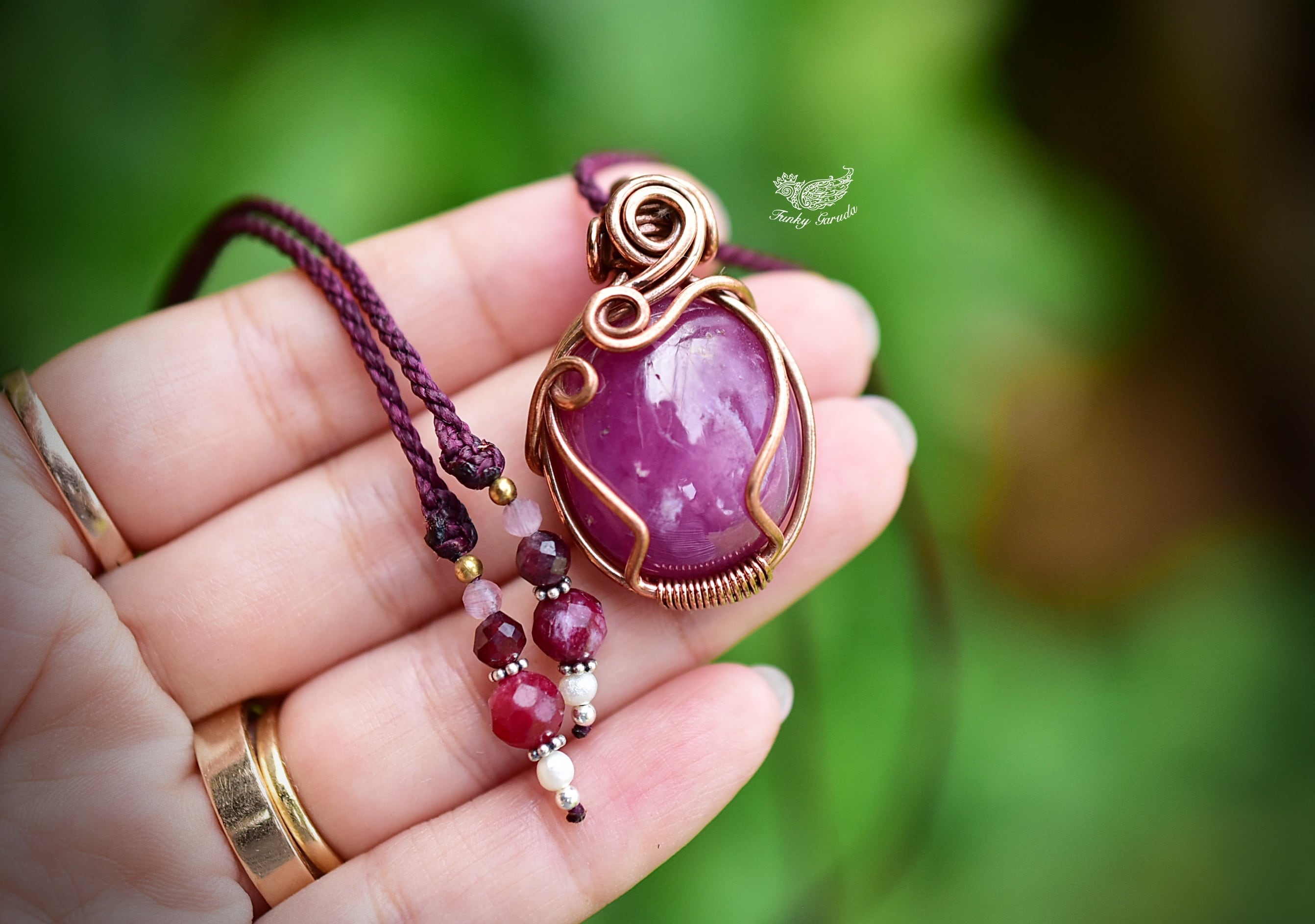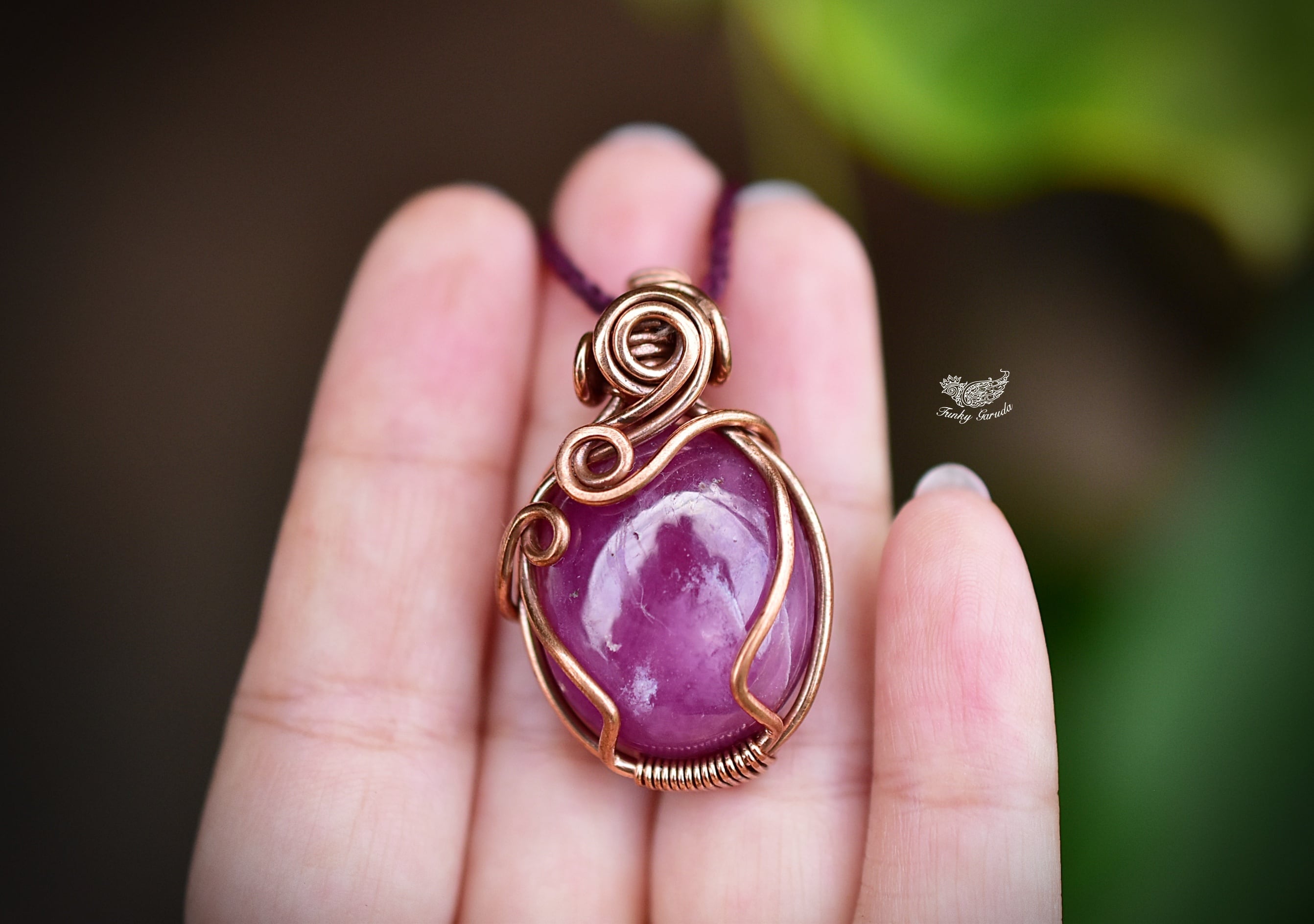 石の周りを割れないようにぐるりと真鍮ワイヤーを巻き付け、ファンタジーな世界観を大切にアーティスティックに仕上げています。