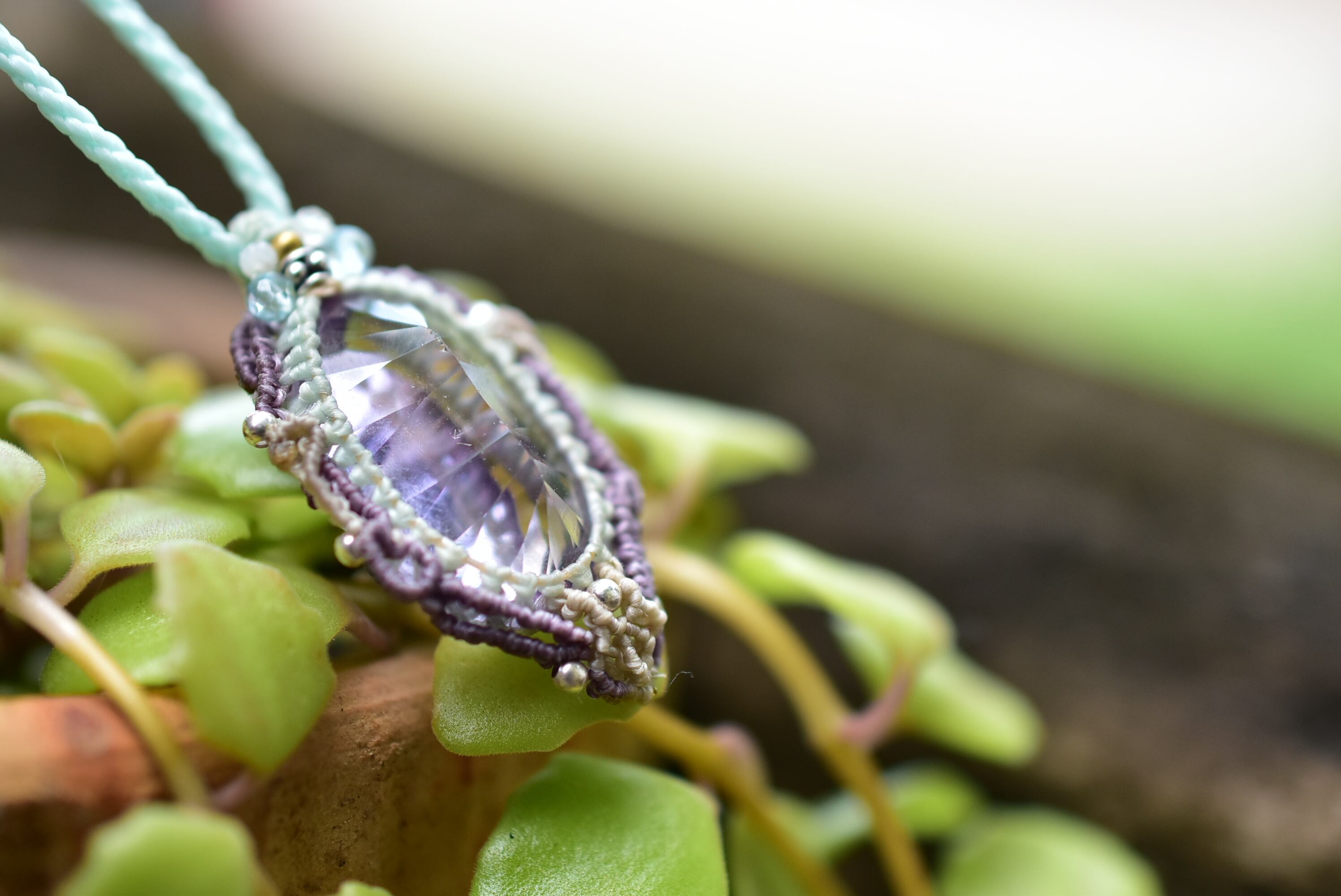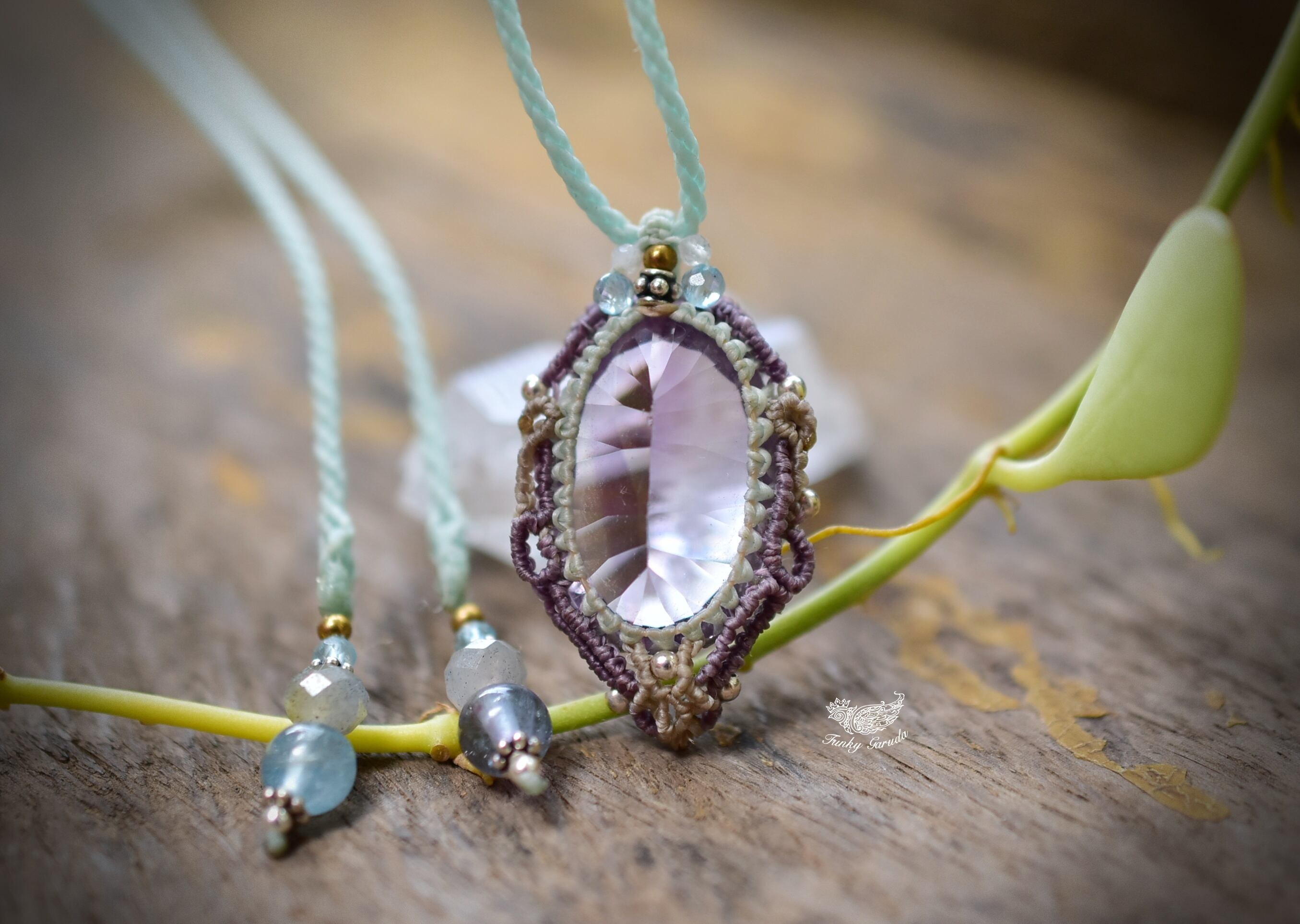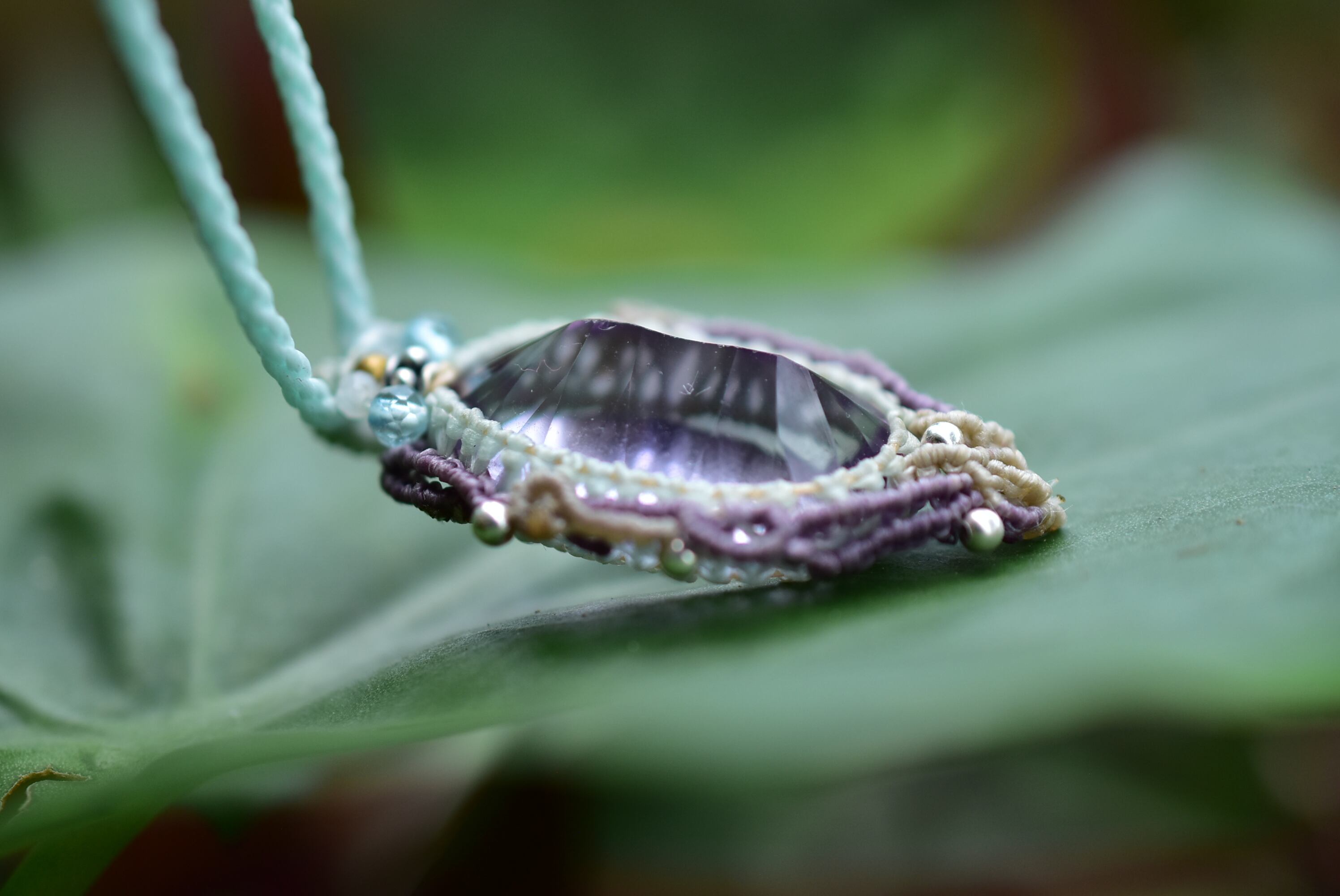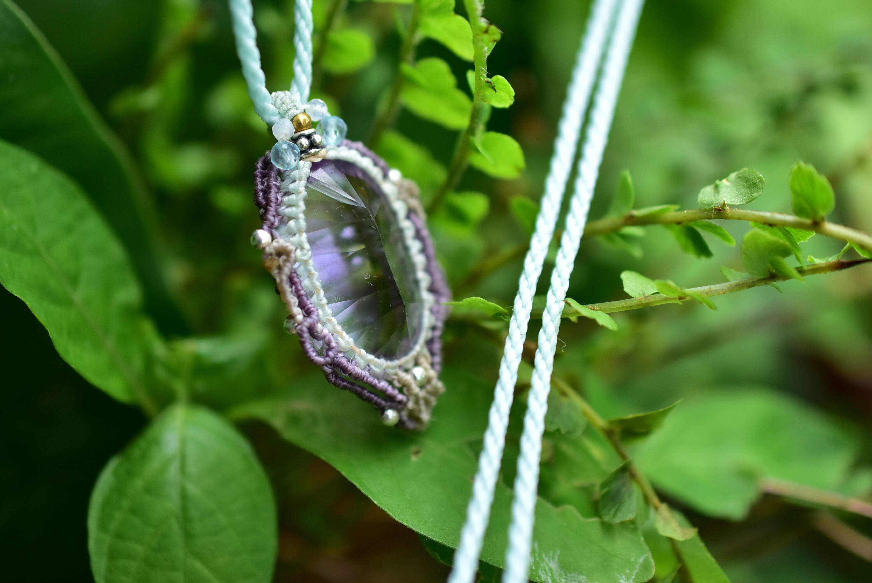 ◆このたびはパープル、ミント、ナチュラルホワイト、キナリ色の蝋引き糸を使用しマクラメ編み装飾を施しました。