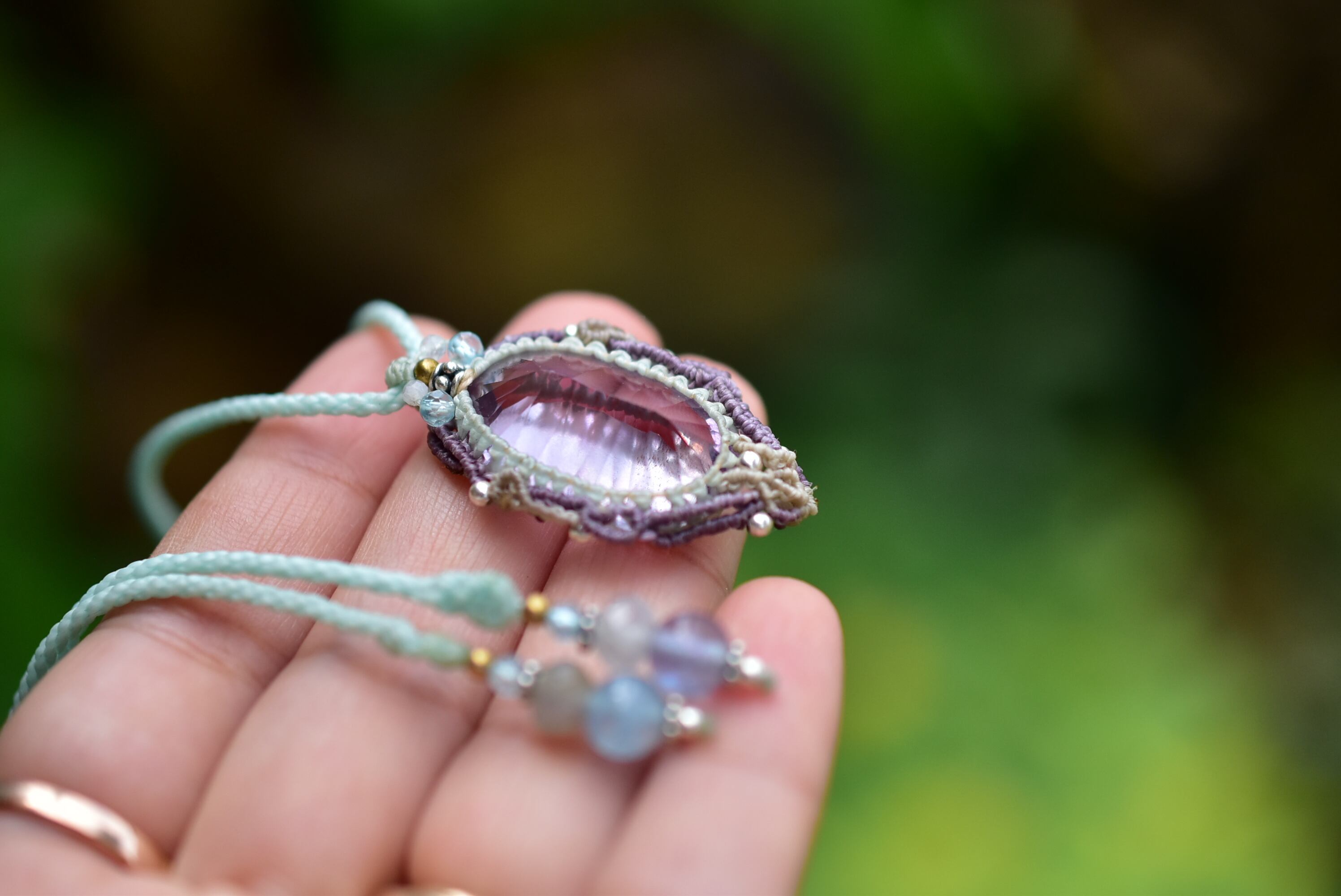 シンプルでいて、特徴あるマクラメ編みペンダントに仕上げました