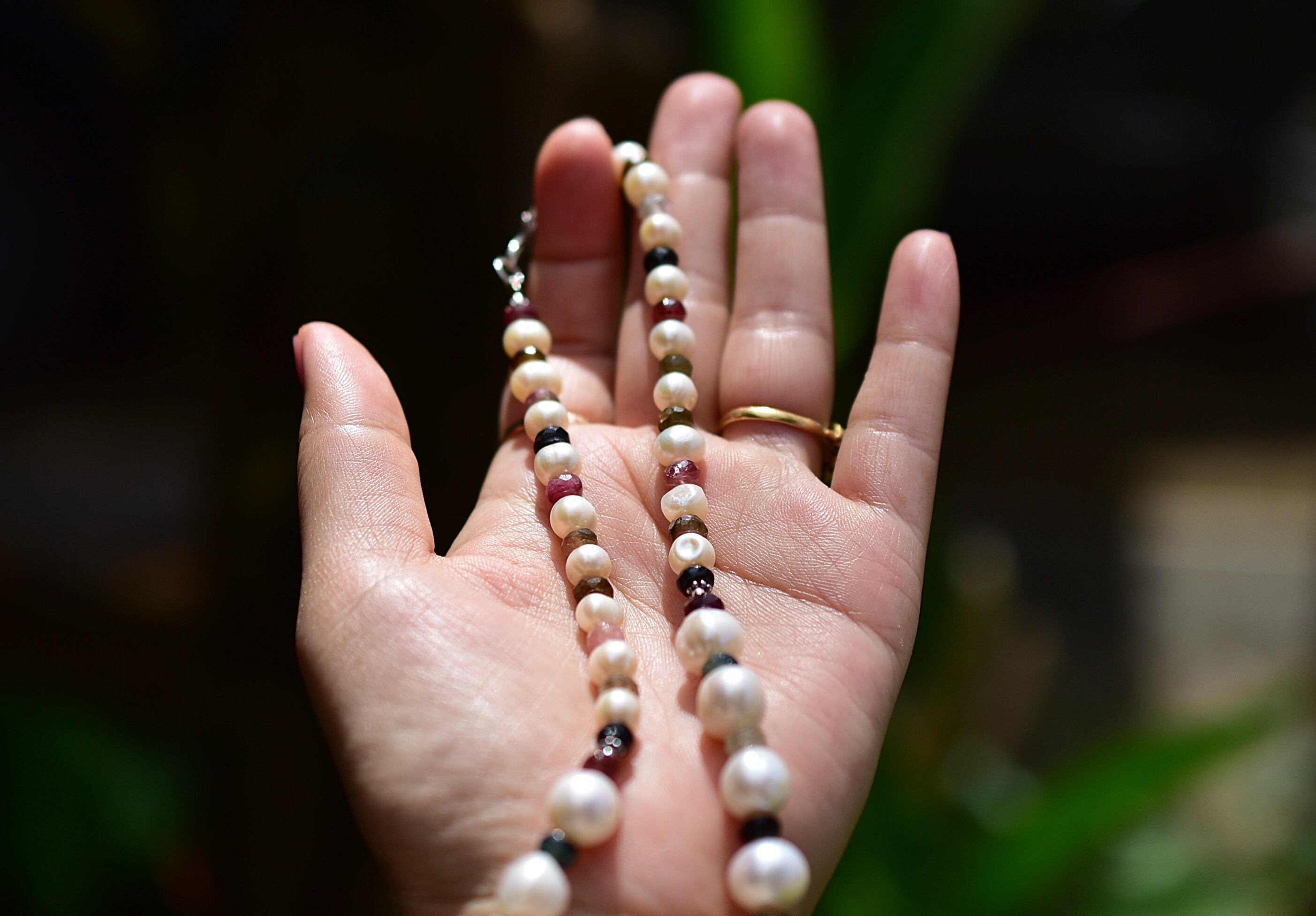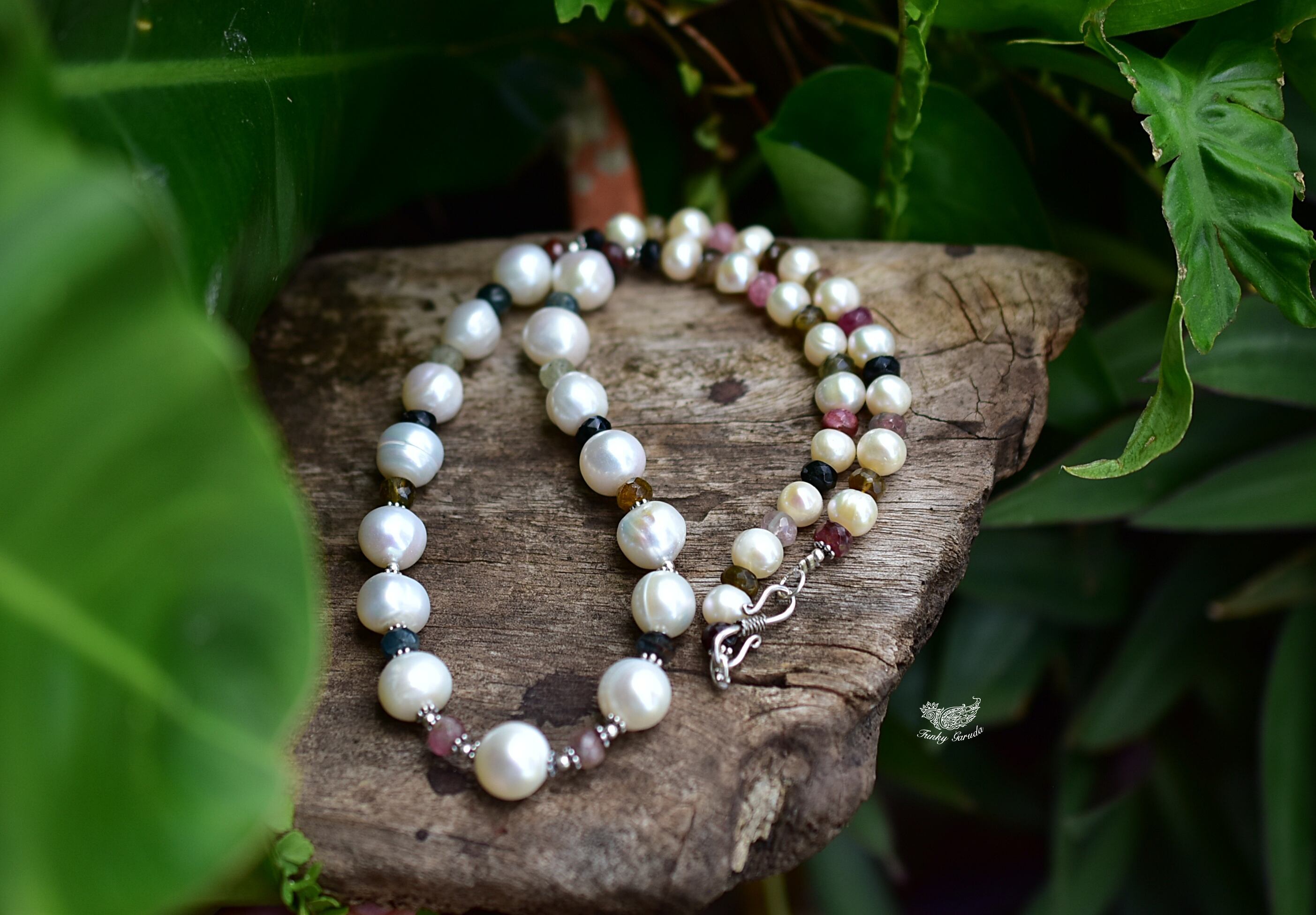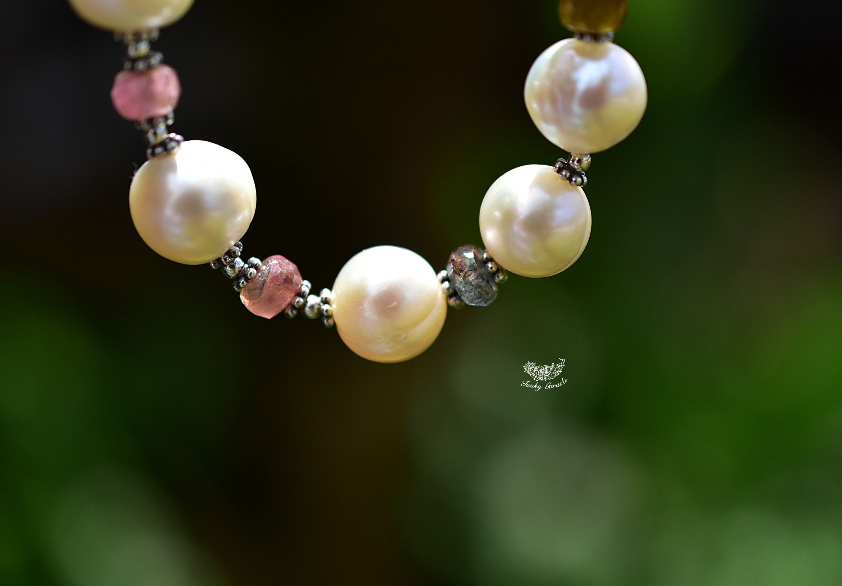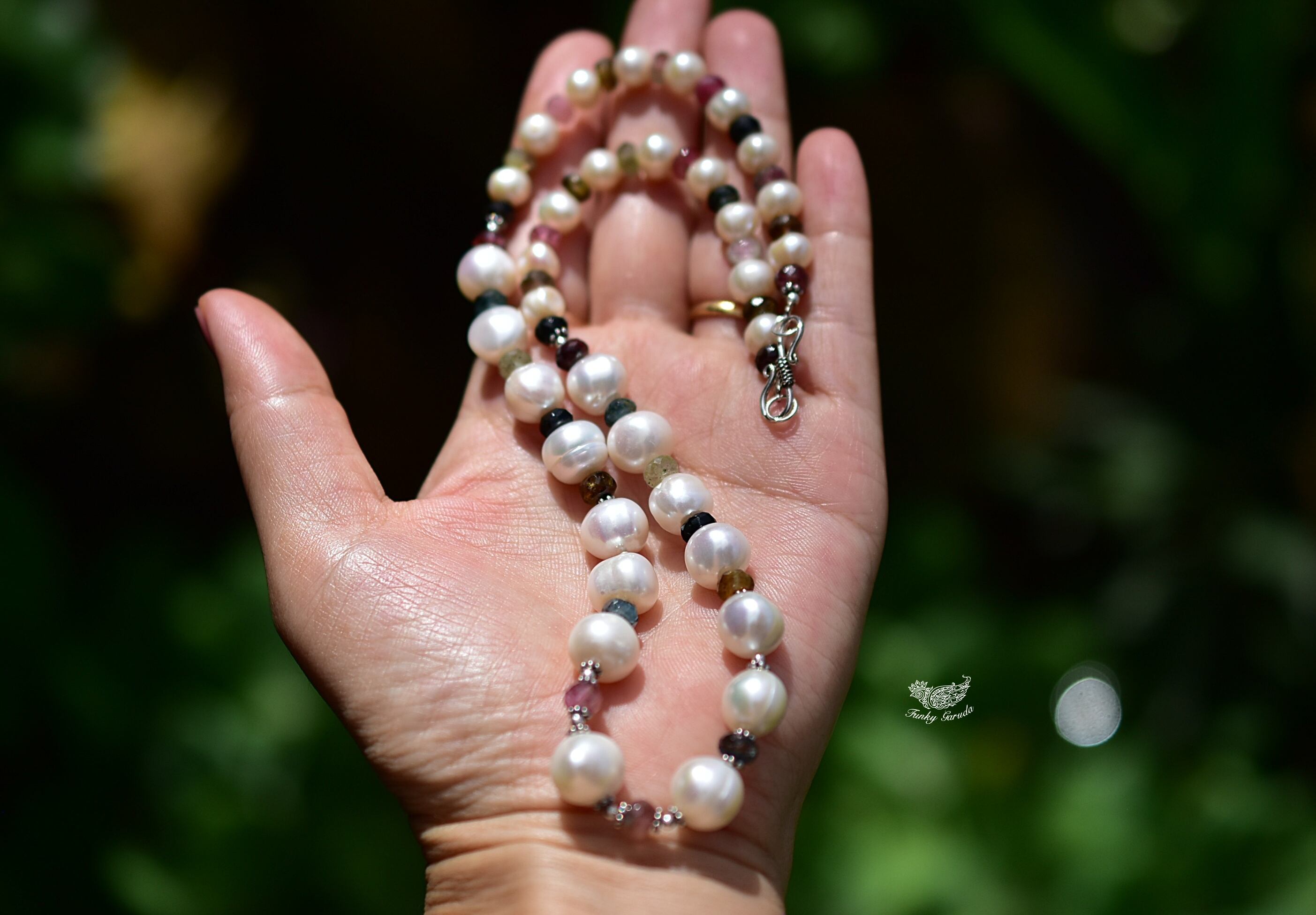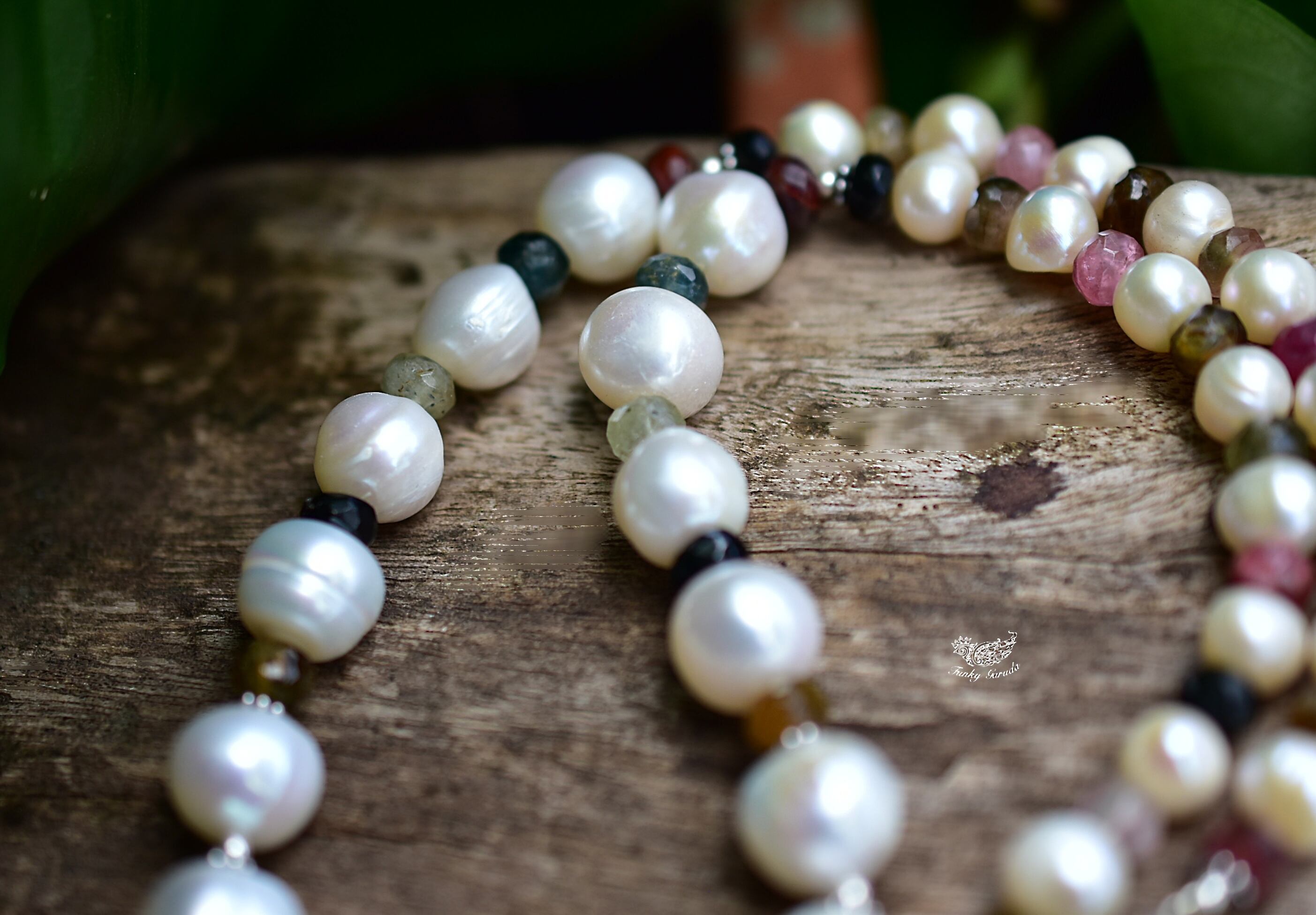 ひと粒ひと粒パールとトルマリンビーズを見立てて