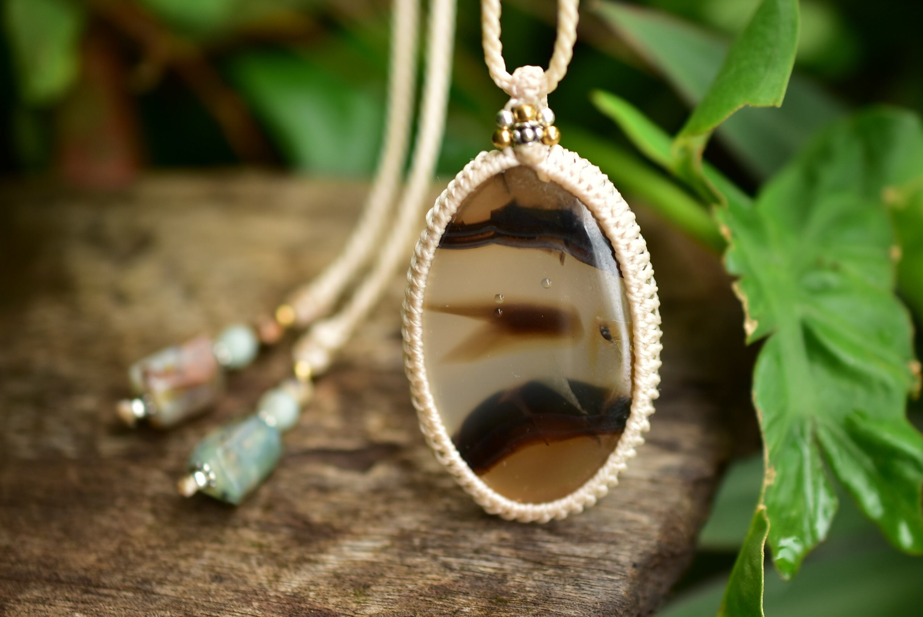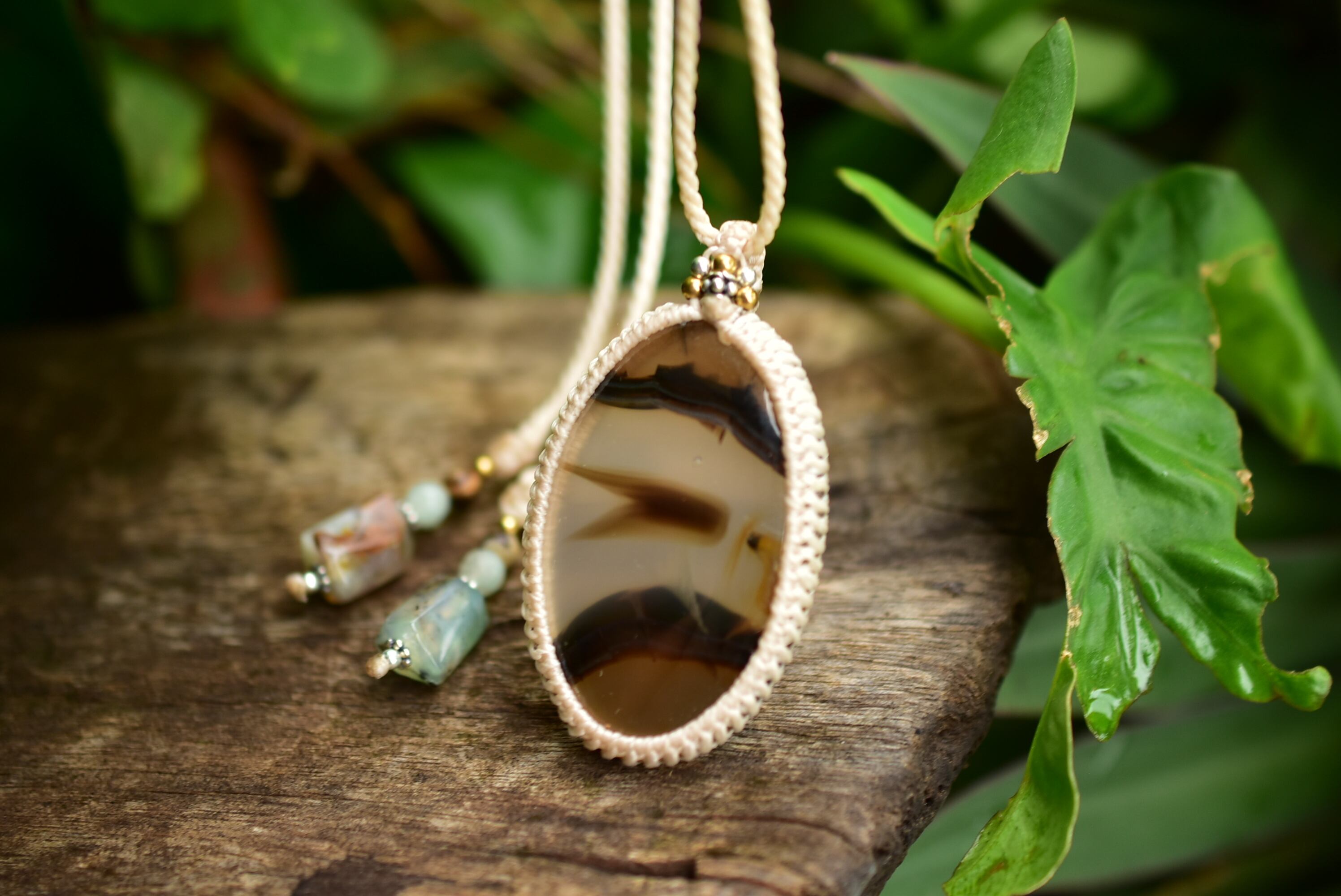◆このたびはナチュラルホワイト色の蝋引き糸を使用しマクラメ編み装飾を施しました。
