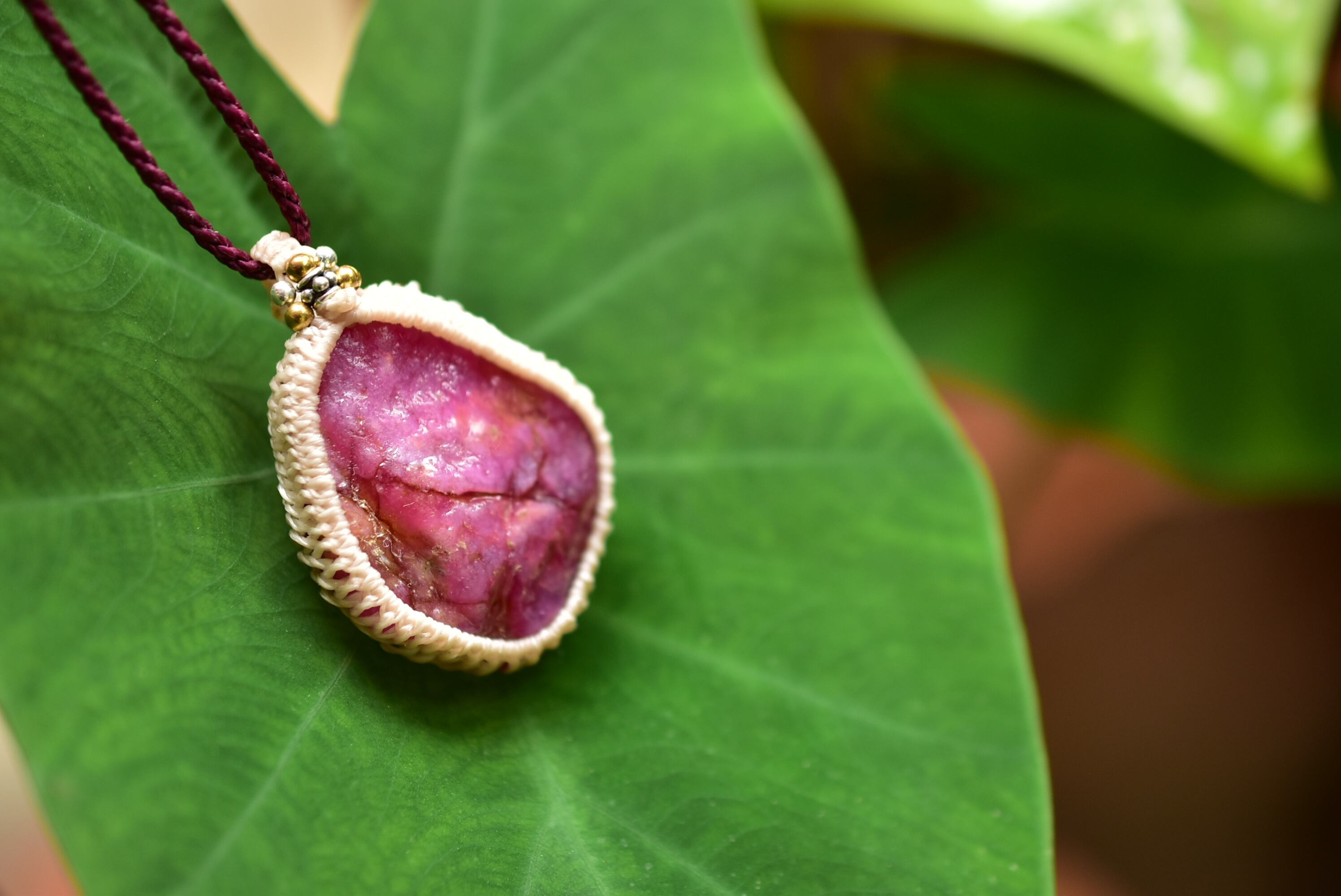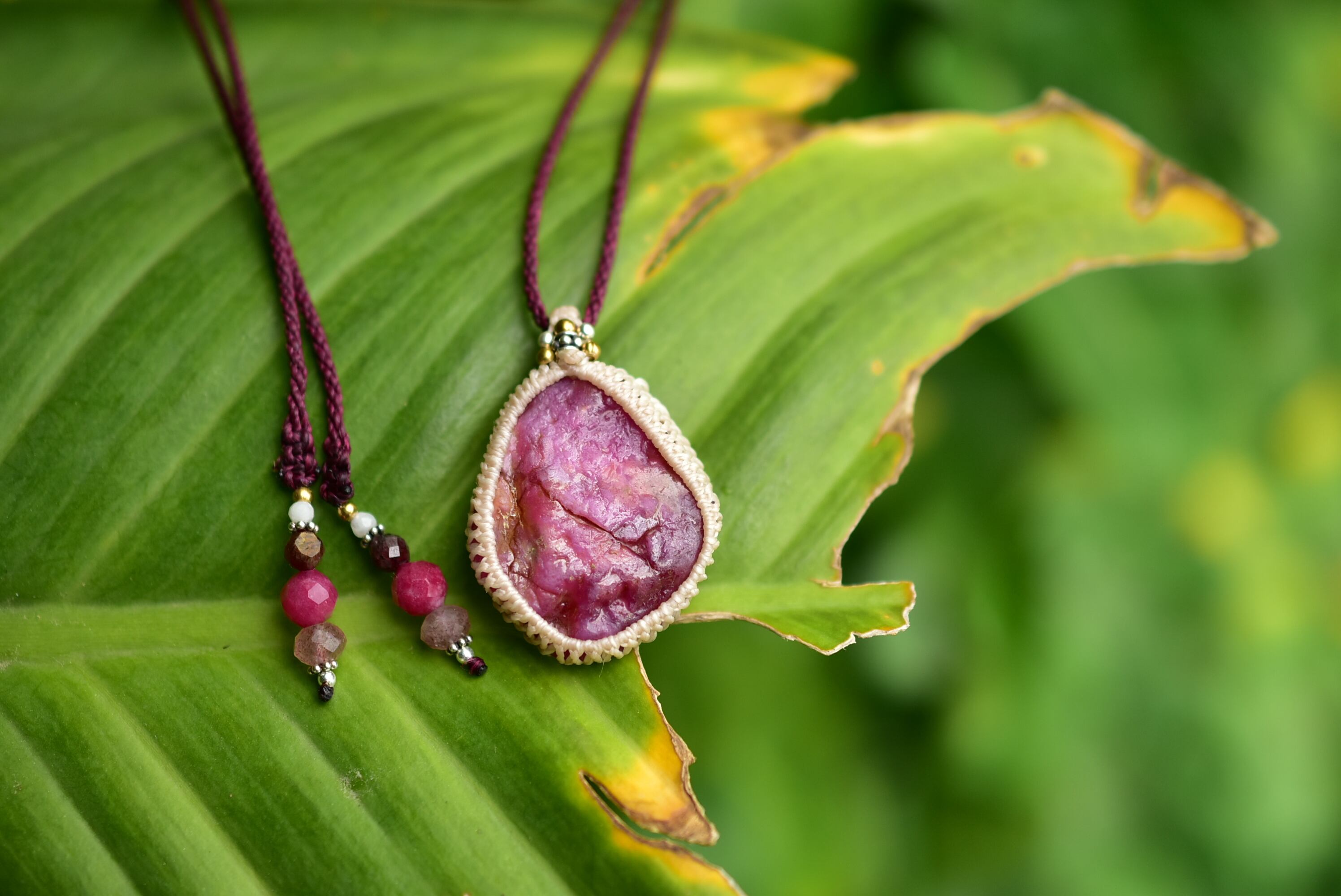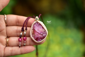 ◆このたびはナチュラルホワイト、ボルドー色の蝋引き糸を使用しマクラメ編み装飾を施しました。