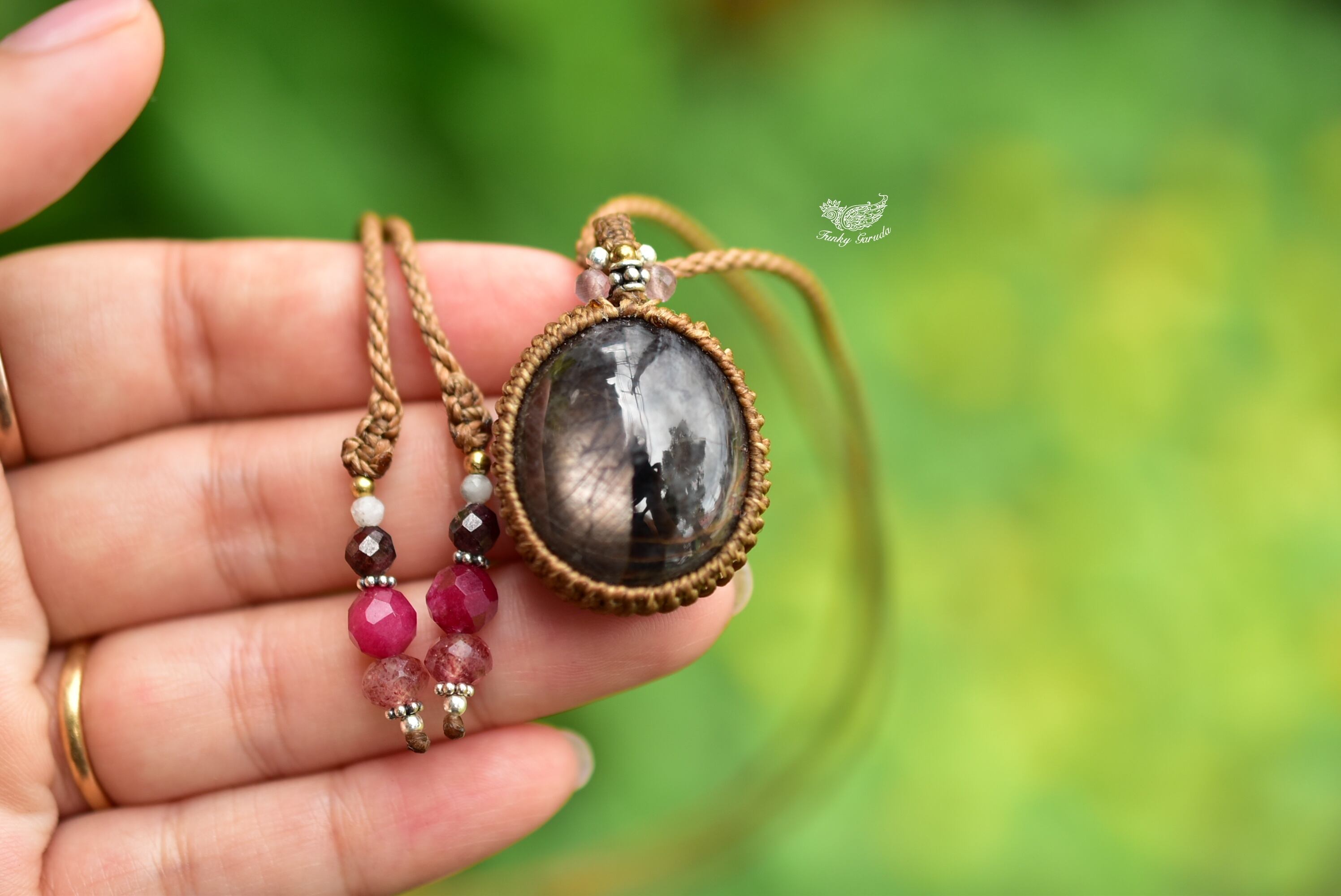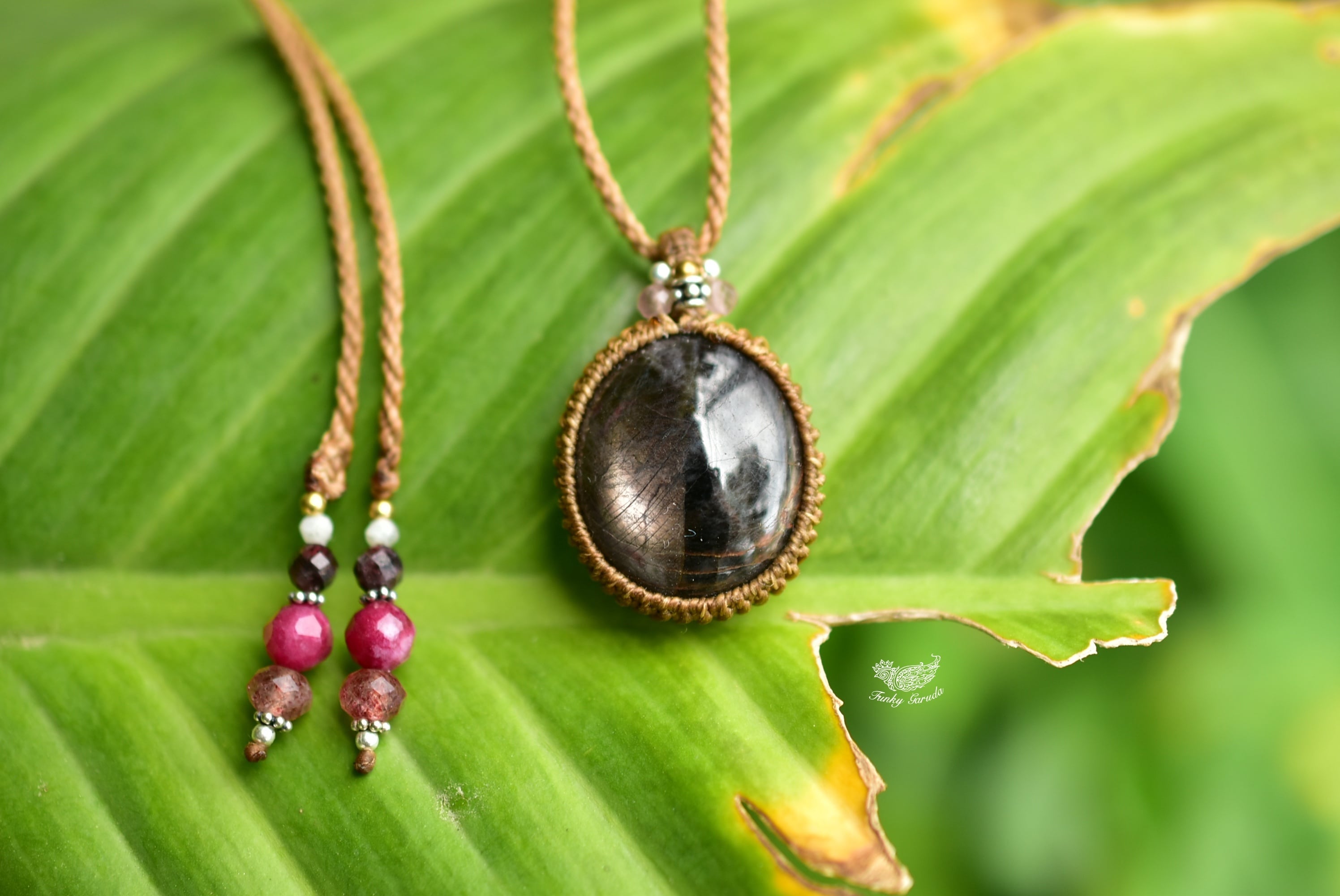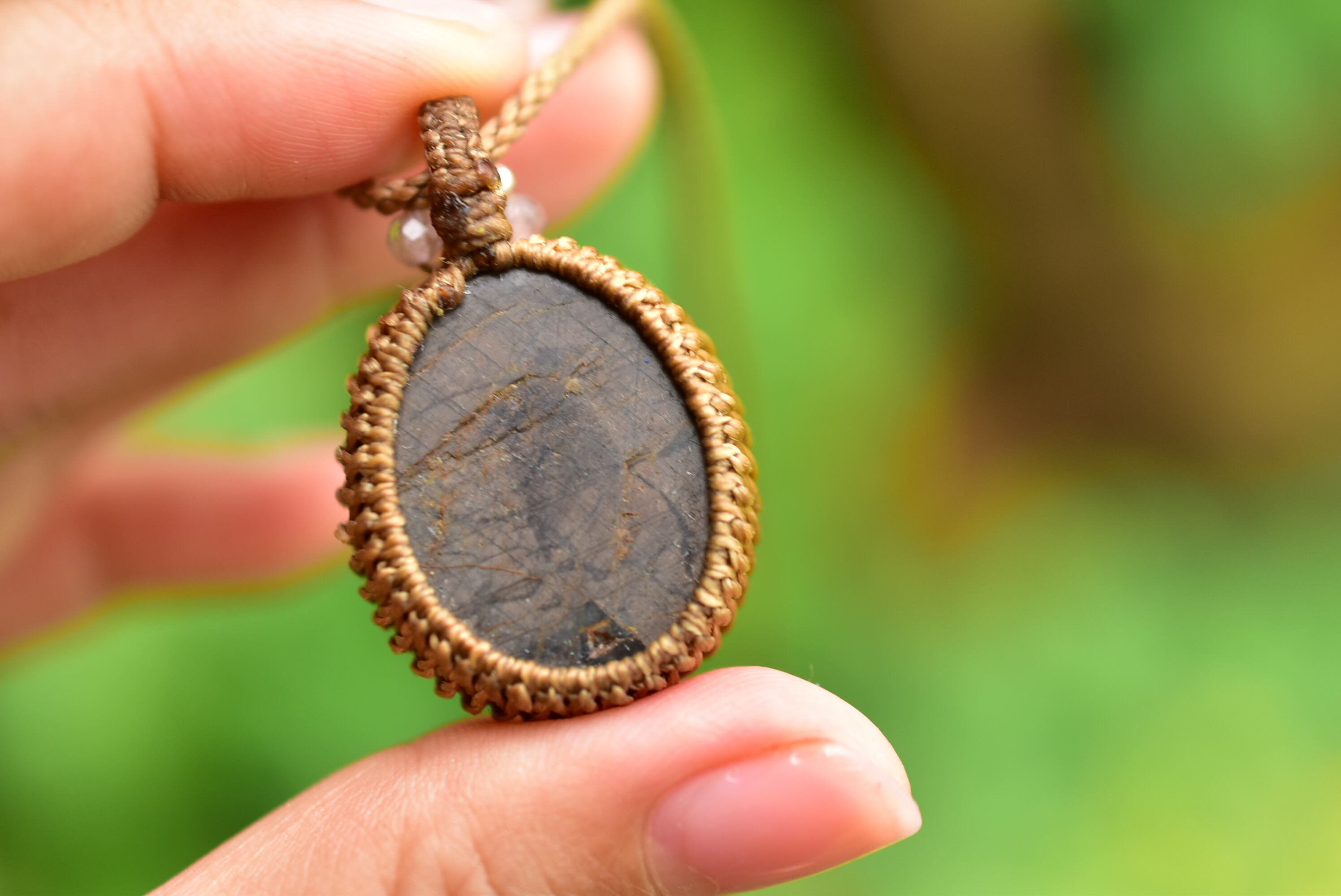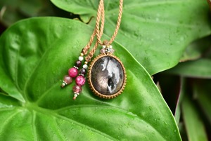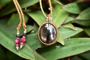 ◆このたびはゴールドブラウン色の蝋引き糸を使用しマクラメ編み装飾を施しました。