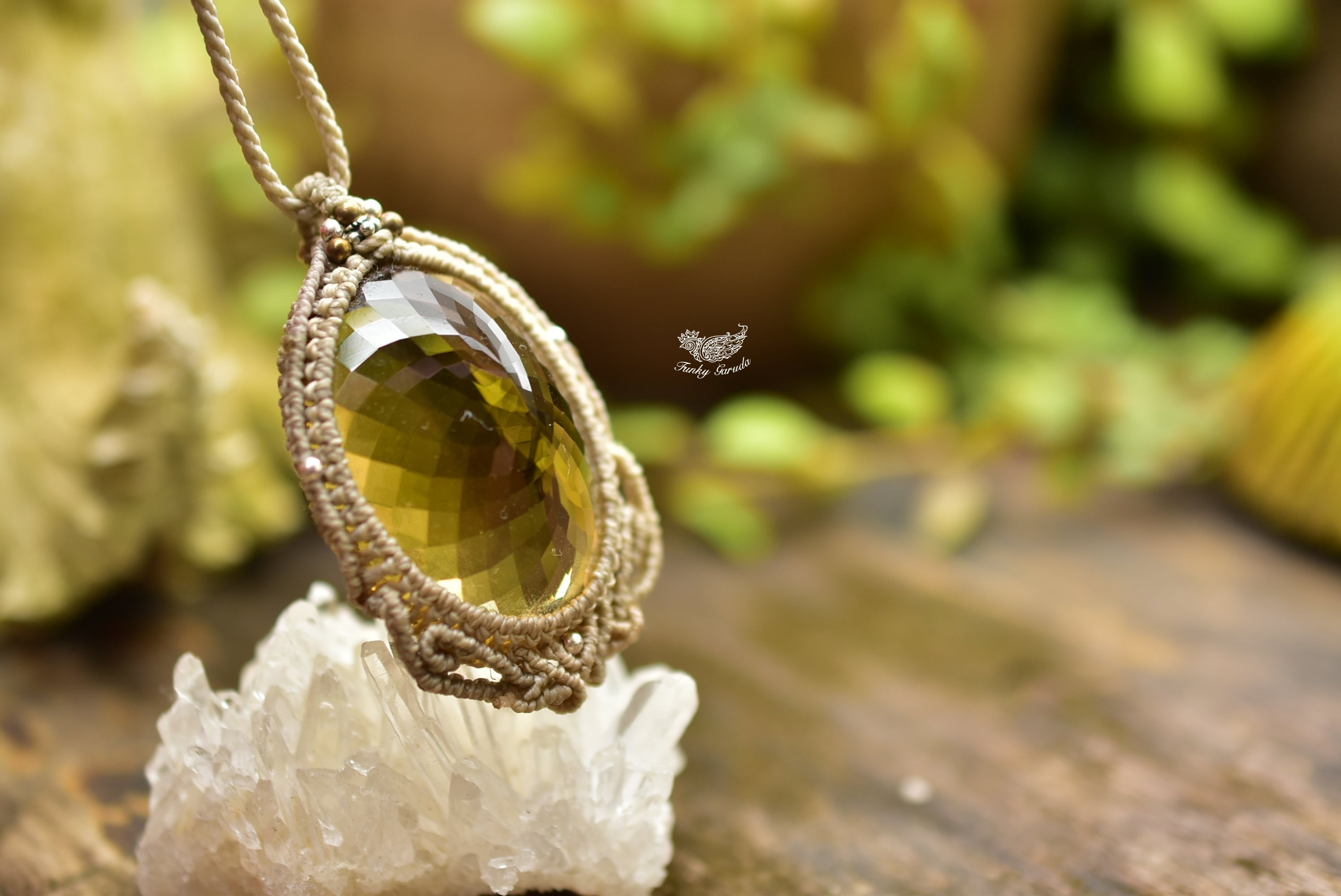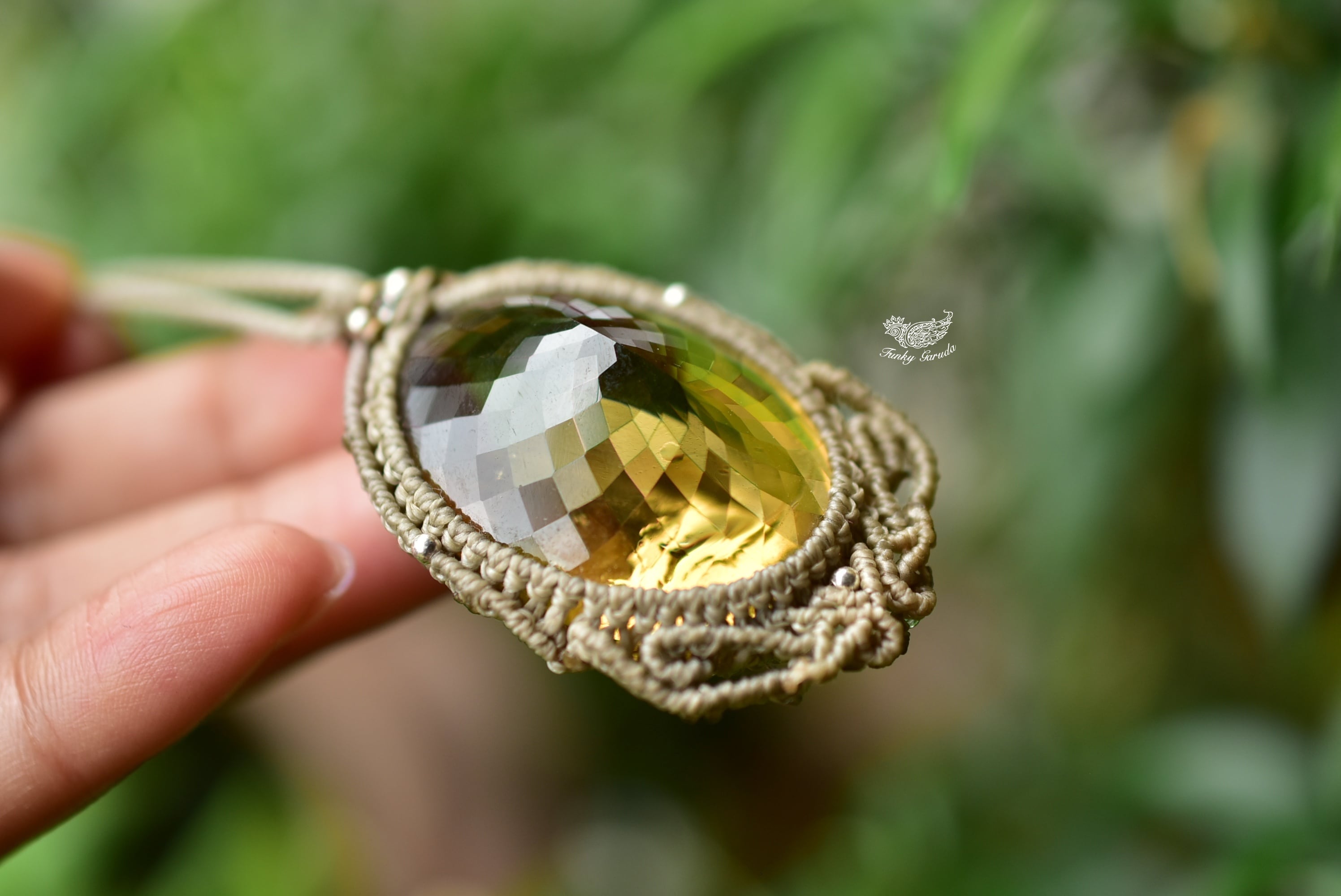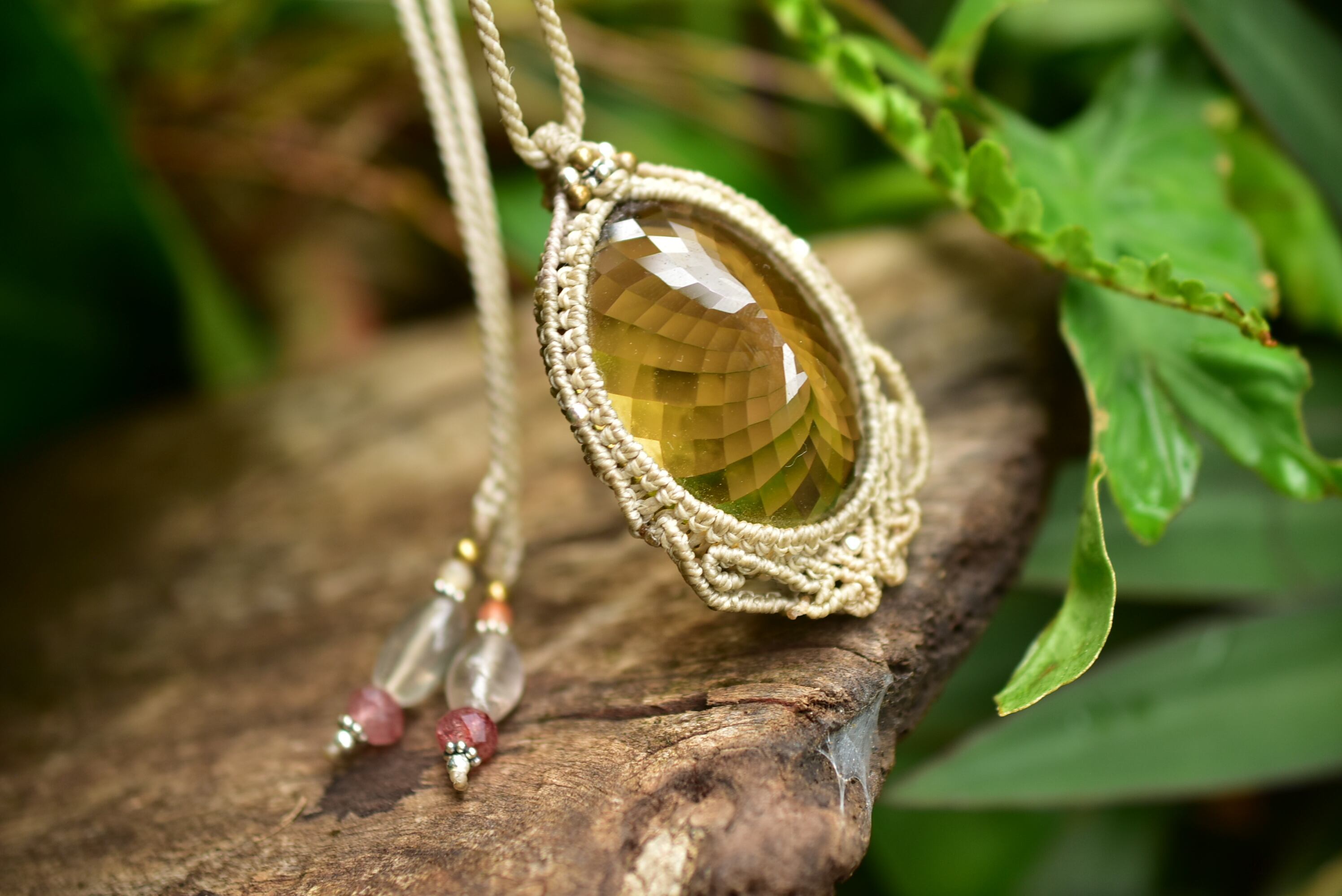 レモンクォーツ宝石をマクラメ編み装飾して仕上げました。