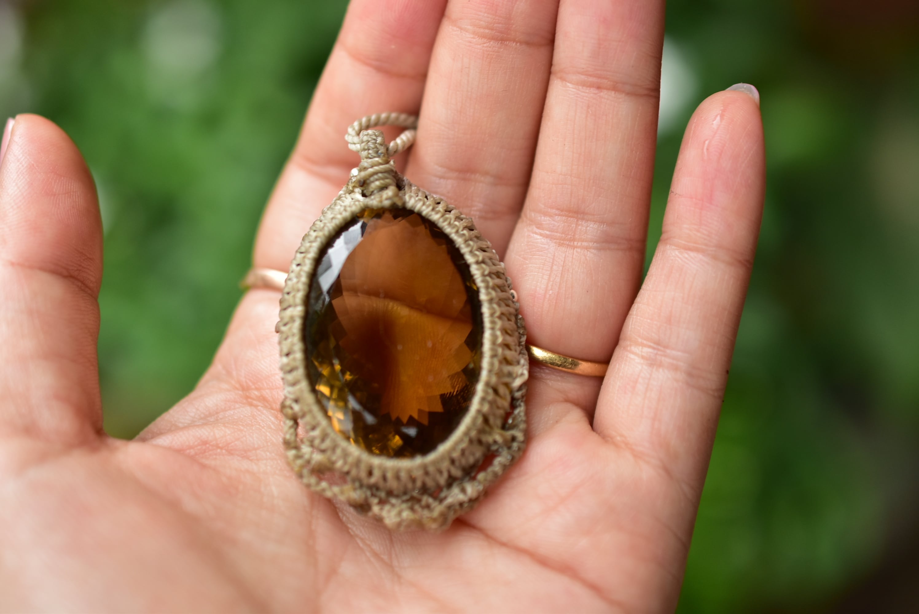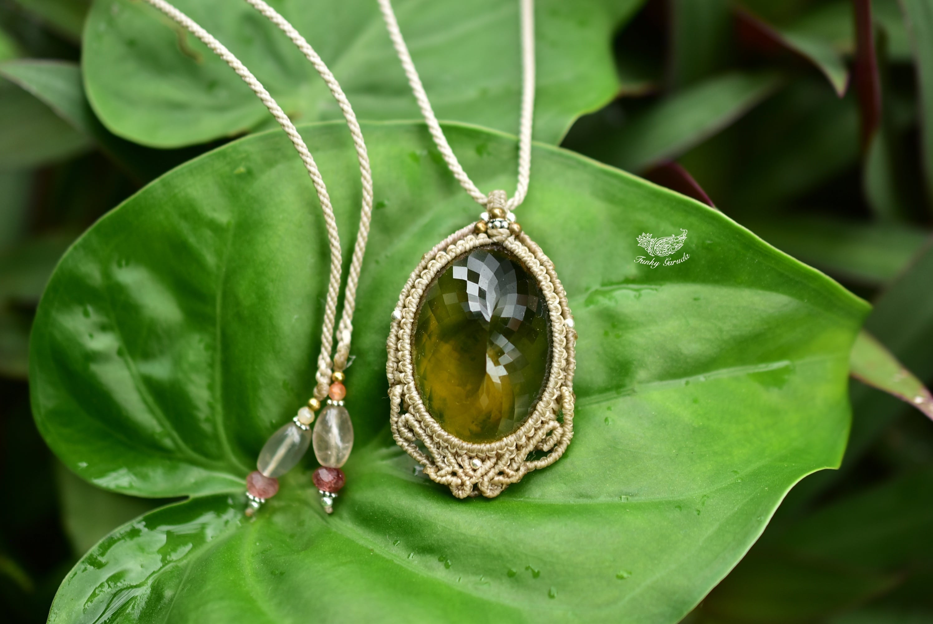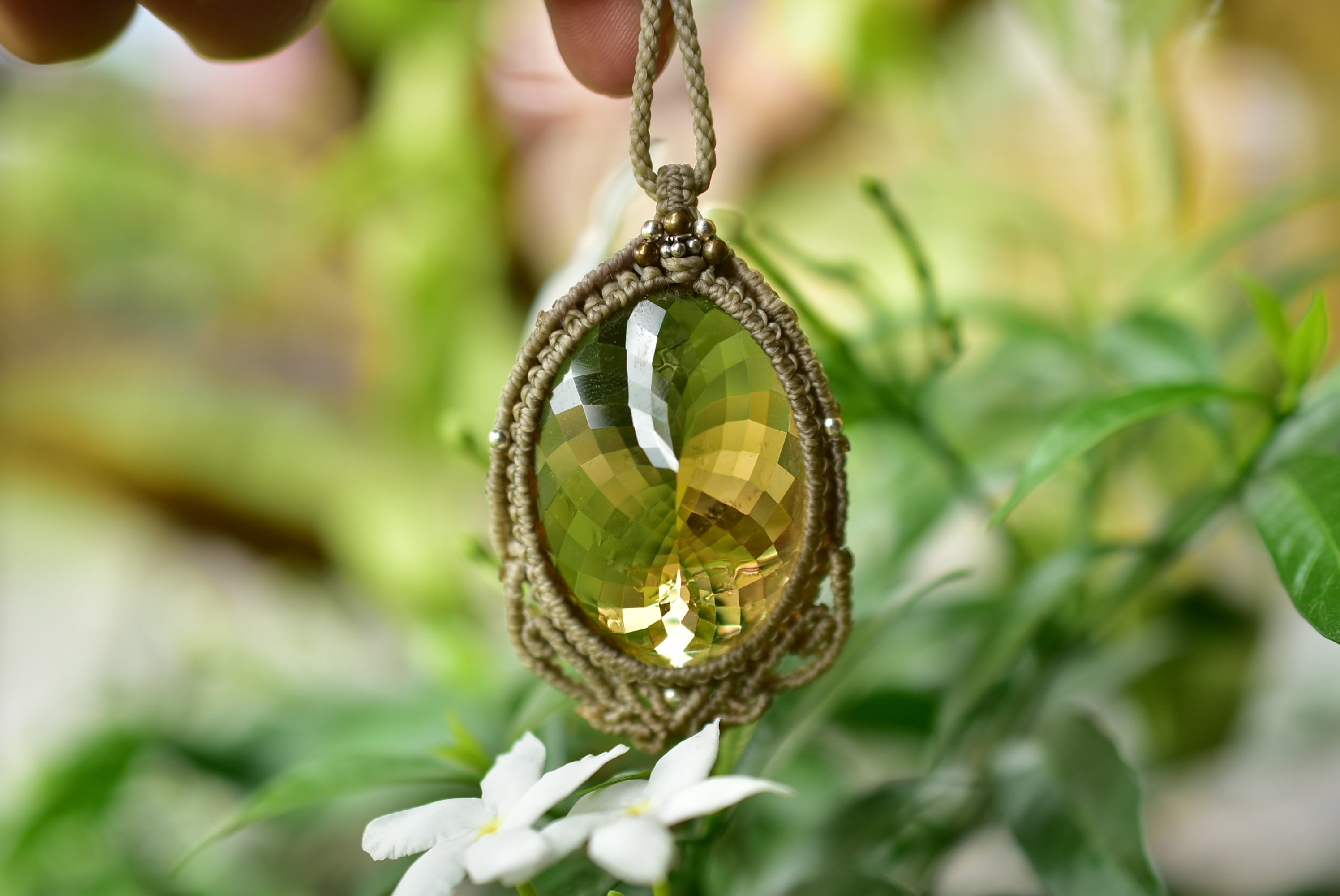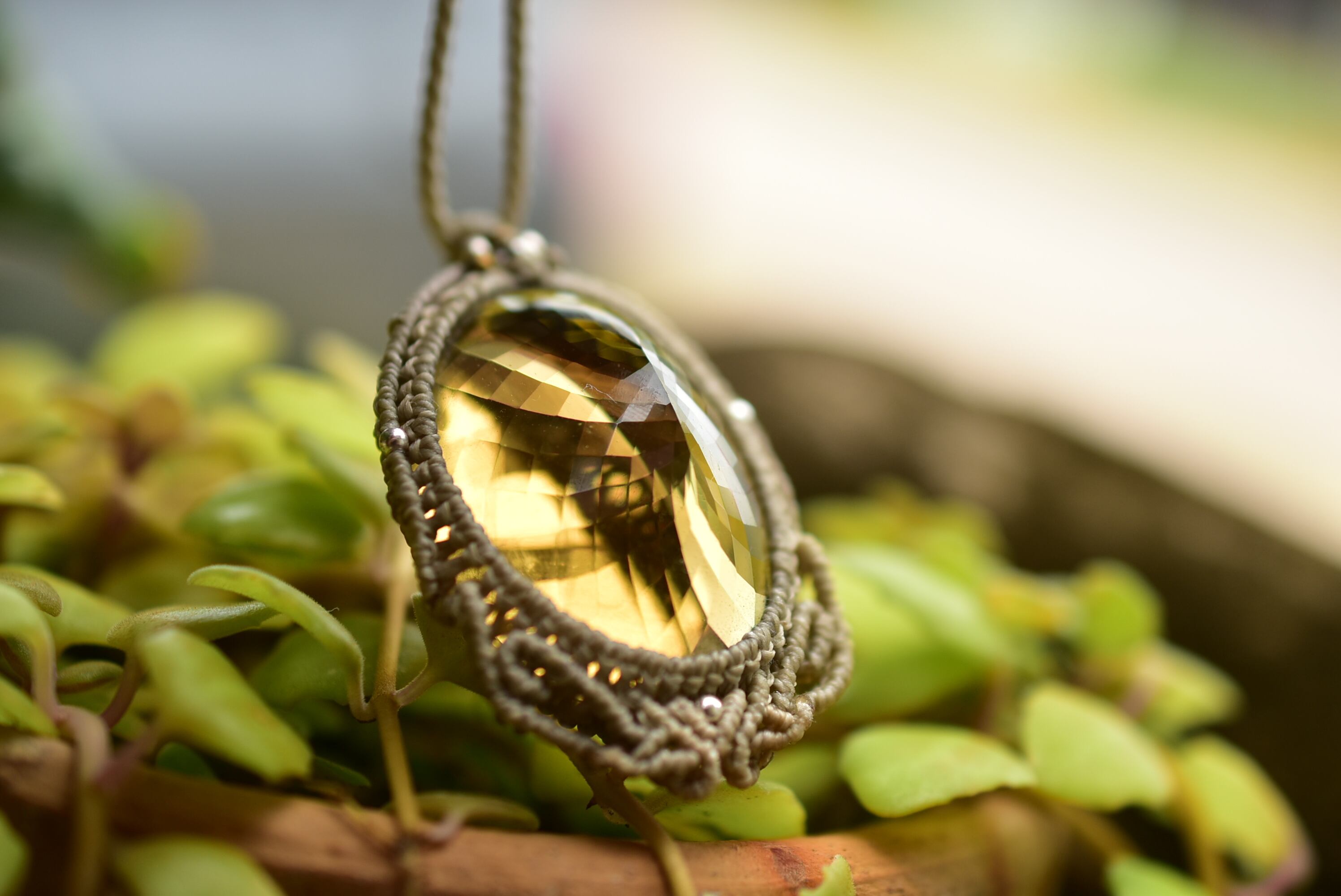 レモンクォーツ宝石をマクラメ編み装飾して仕上げました。