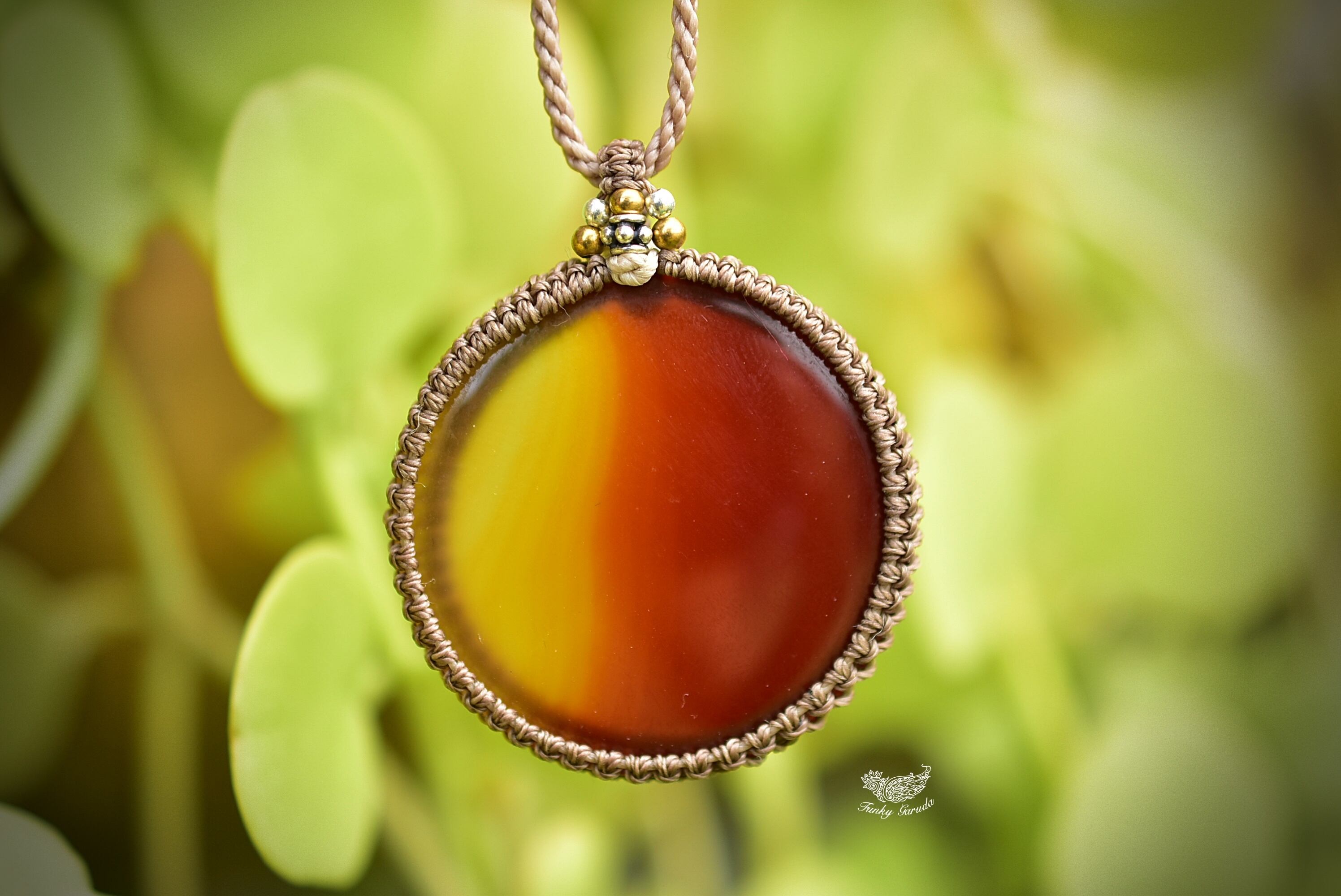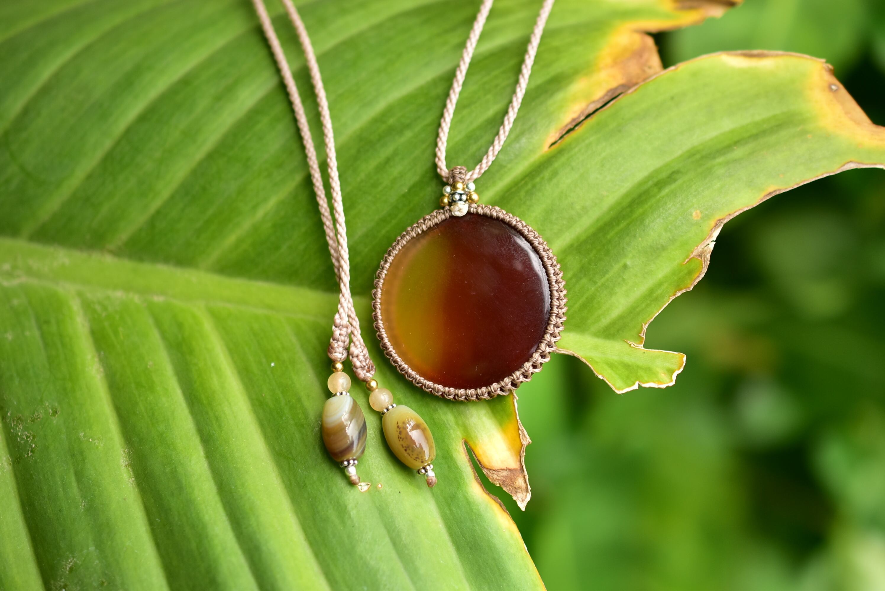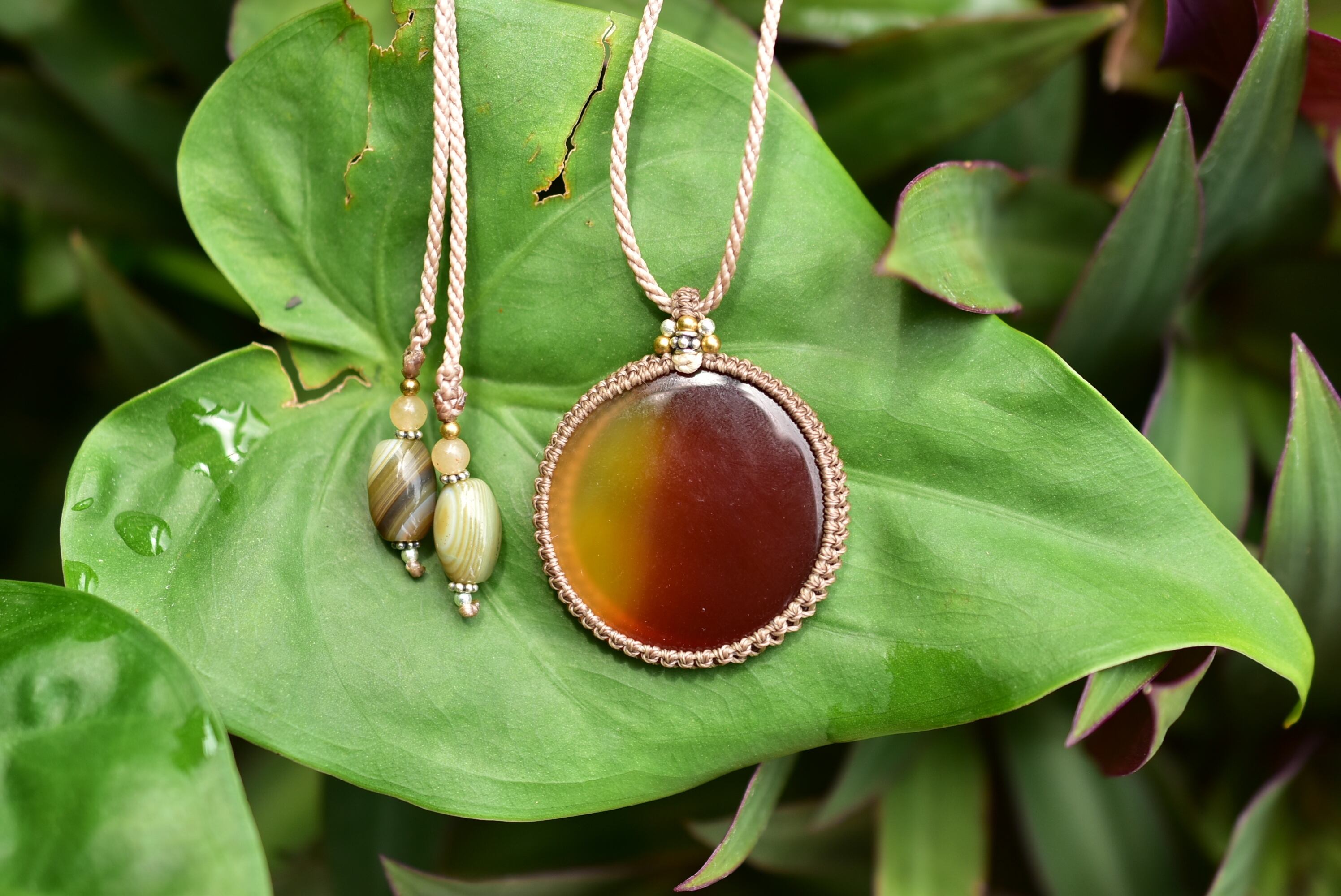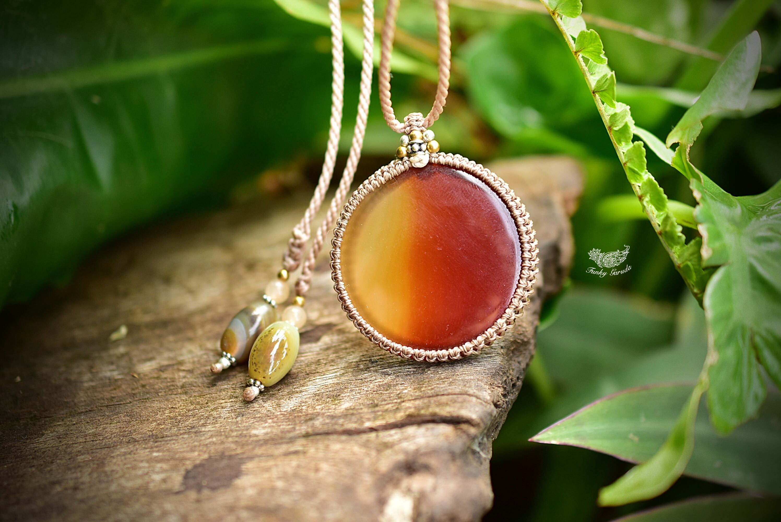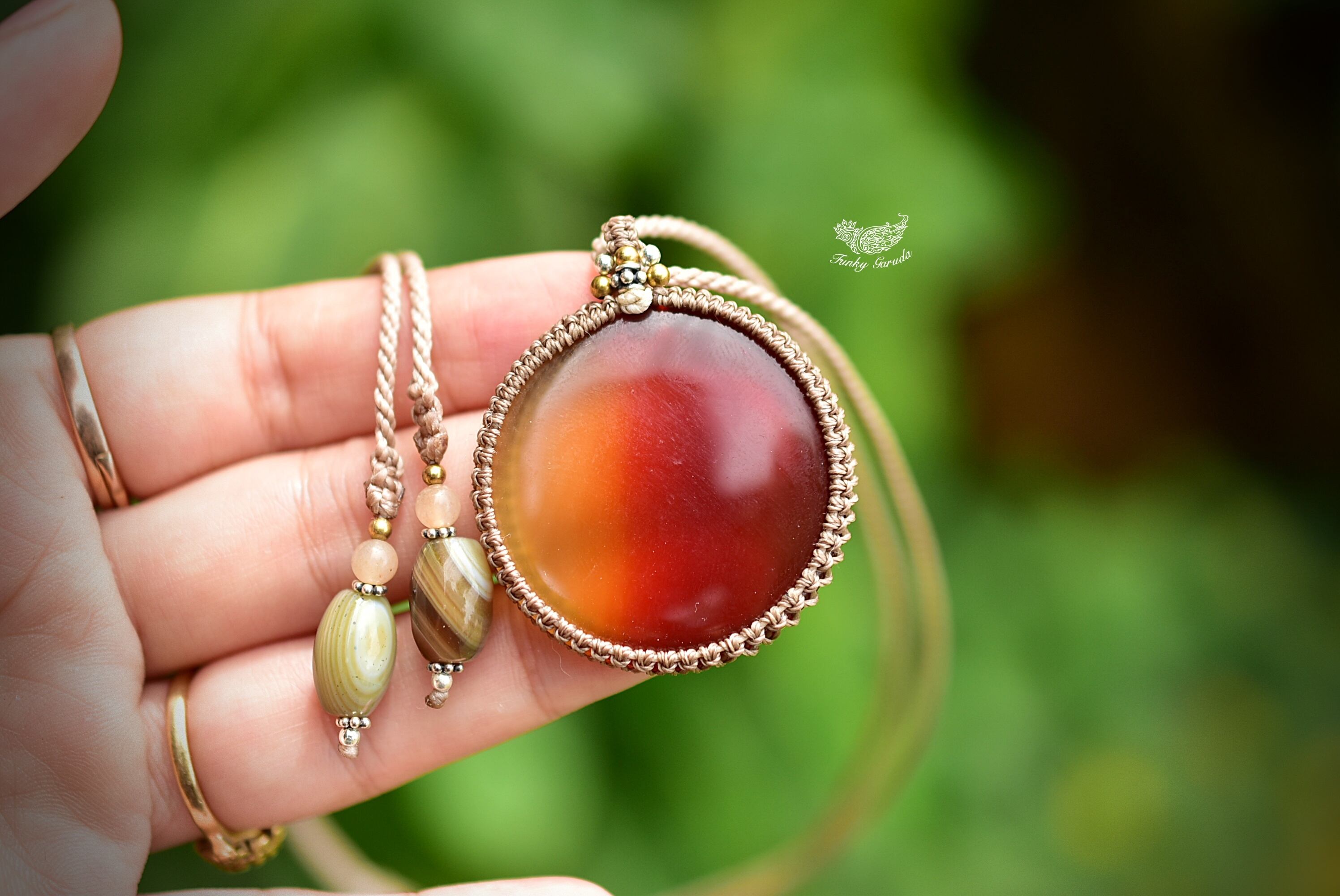 ◆このたびはミルクココア、ブラウン色の蝋引き糸を使用しマクラメ編み装飾を施しました。