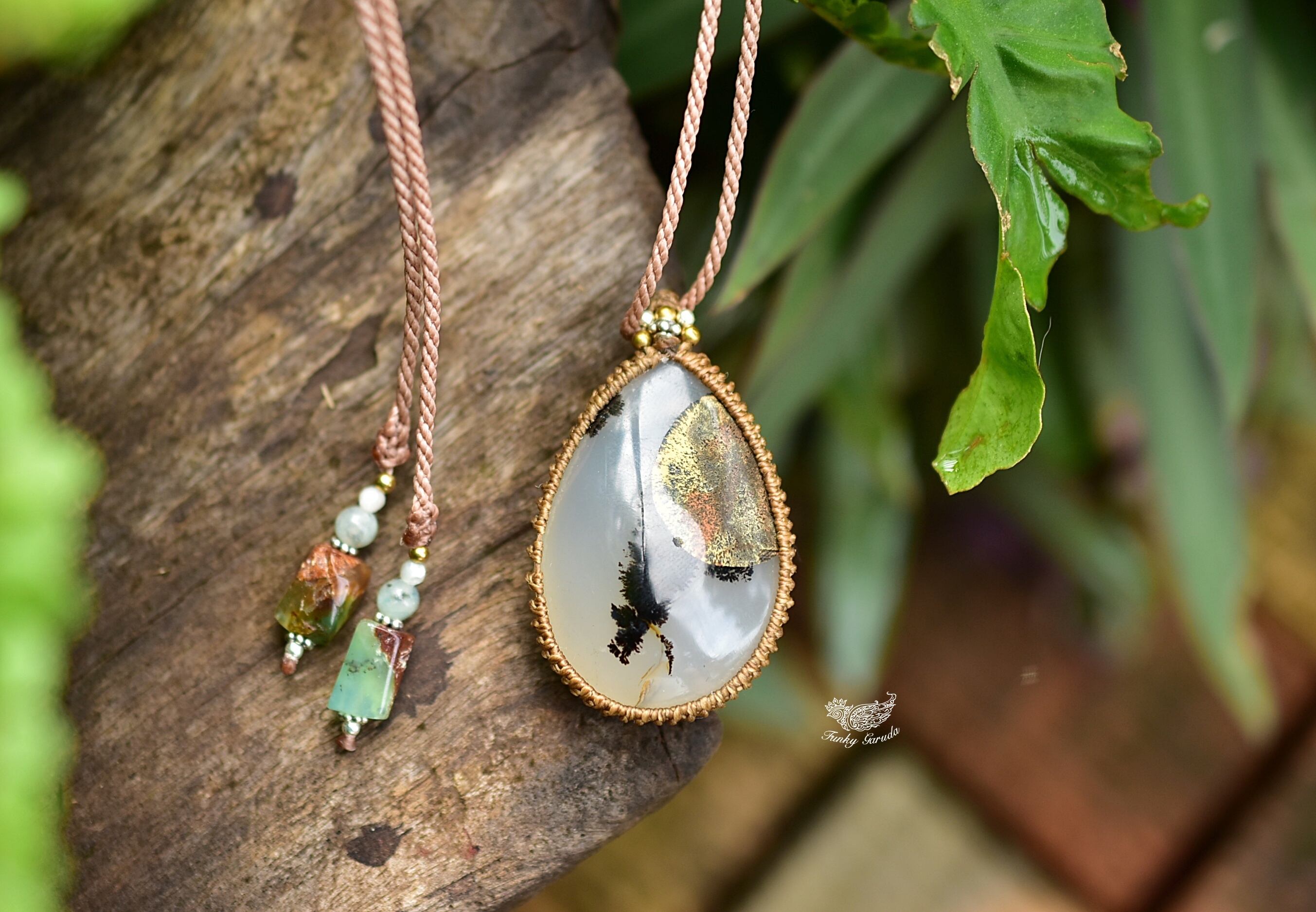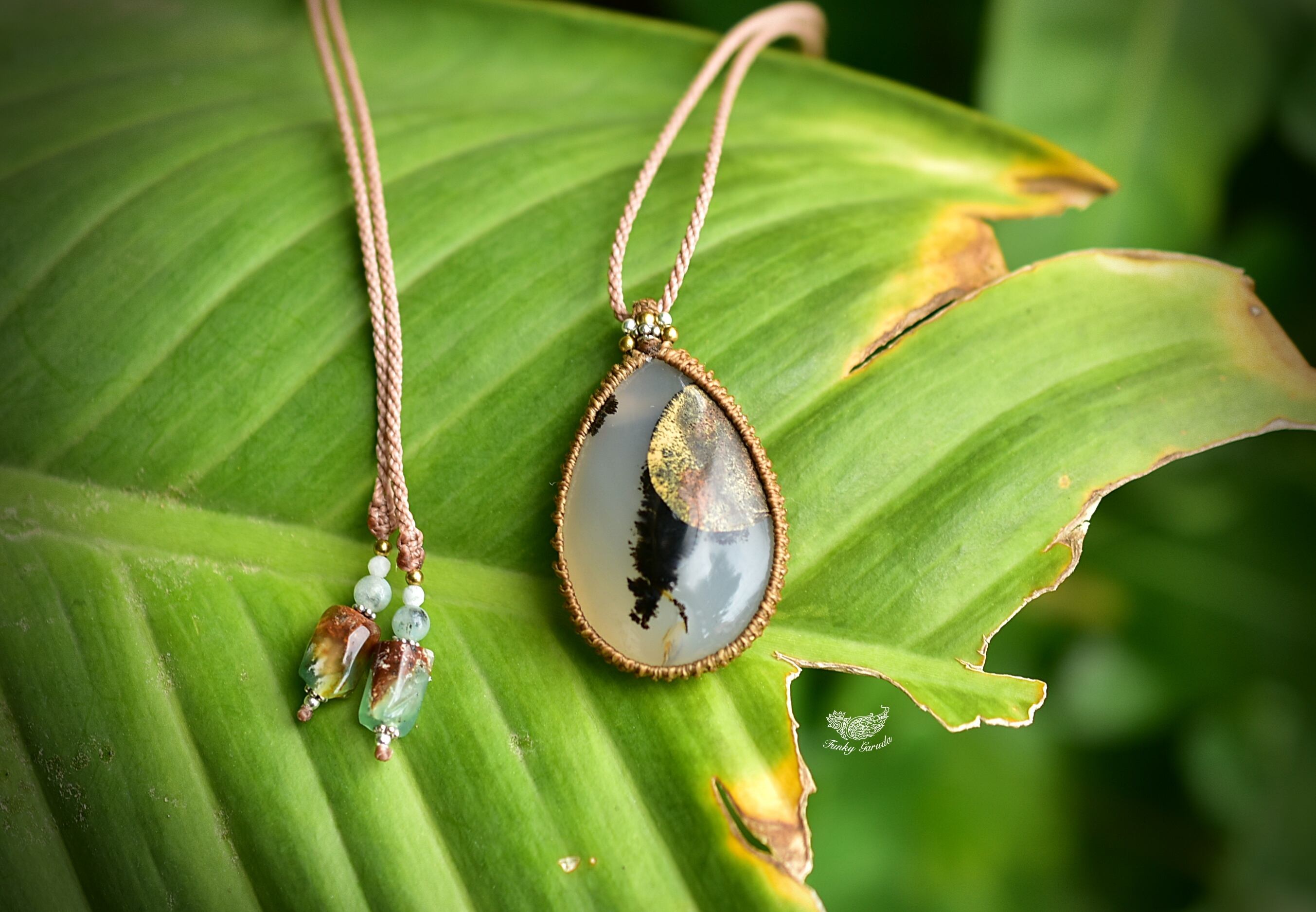 ◆このたびはミルクココア、ゴールドブラウン色の蝋引き糸を使用しマクラメ編み装飾を施しました。