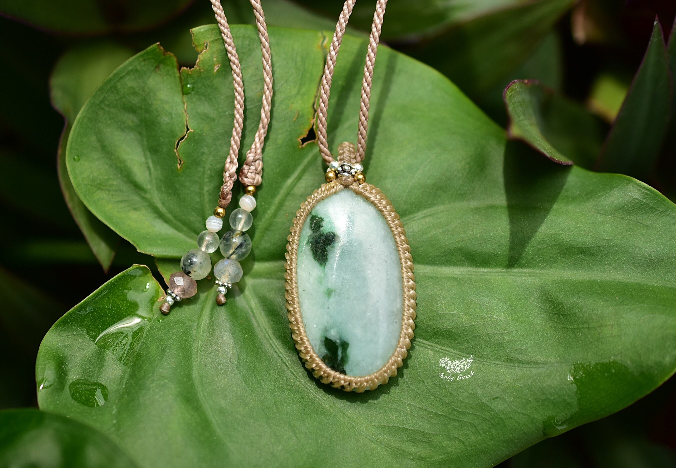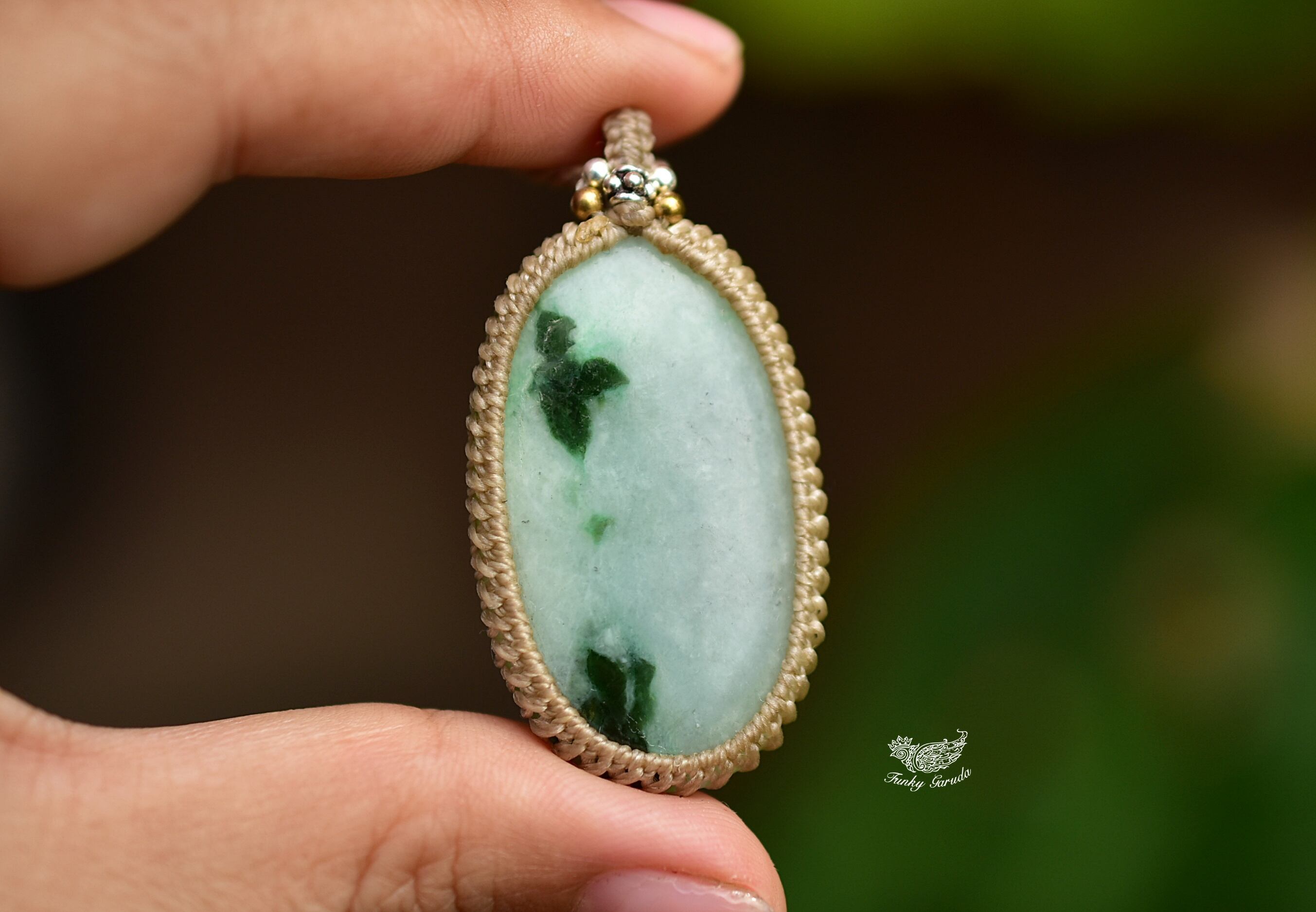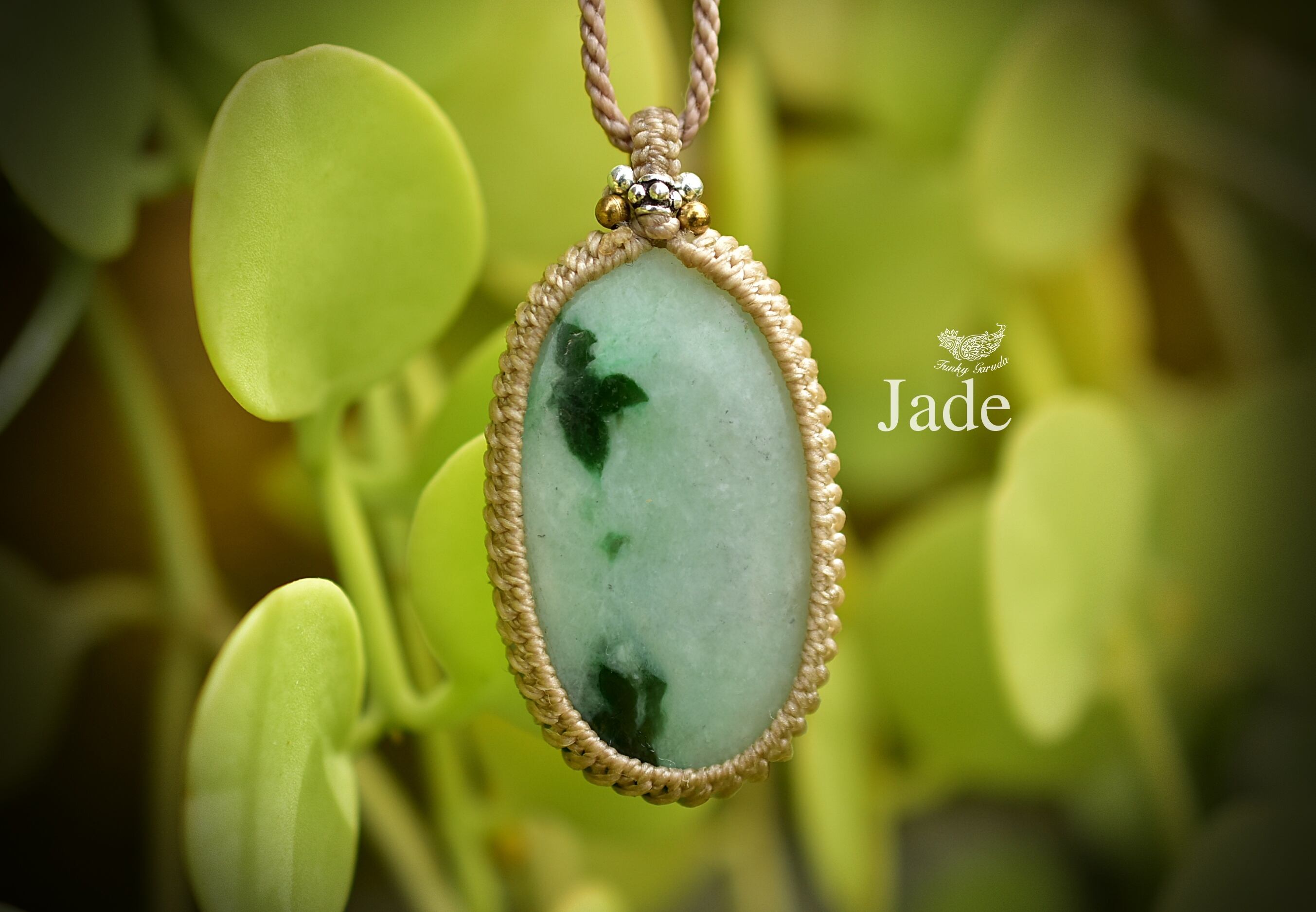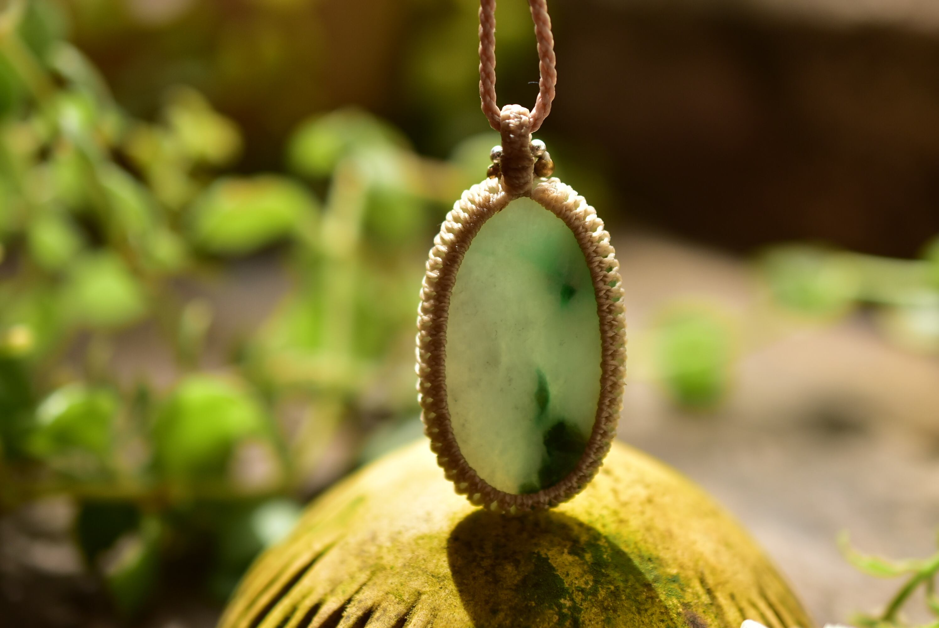 ミャンマー翡翠ルースをシンプルにマクラメネックレスに仕上げました。