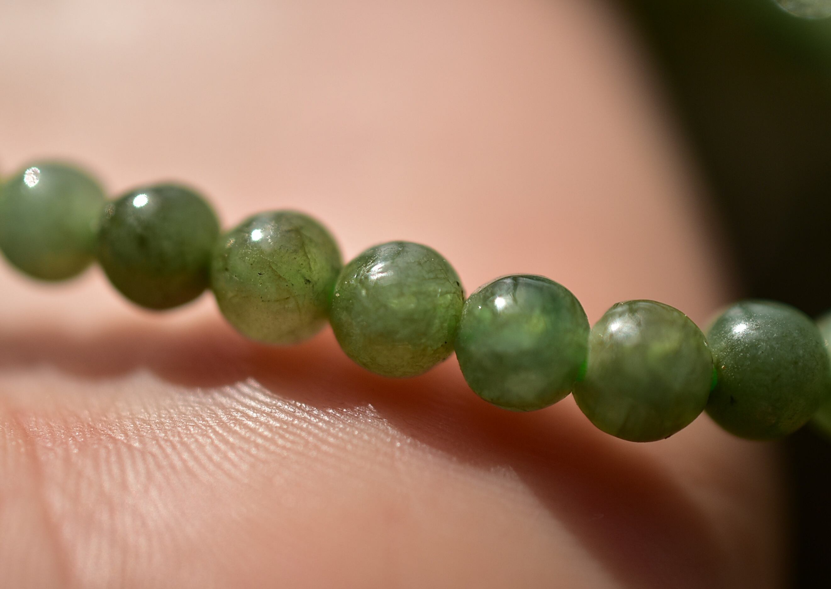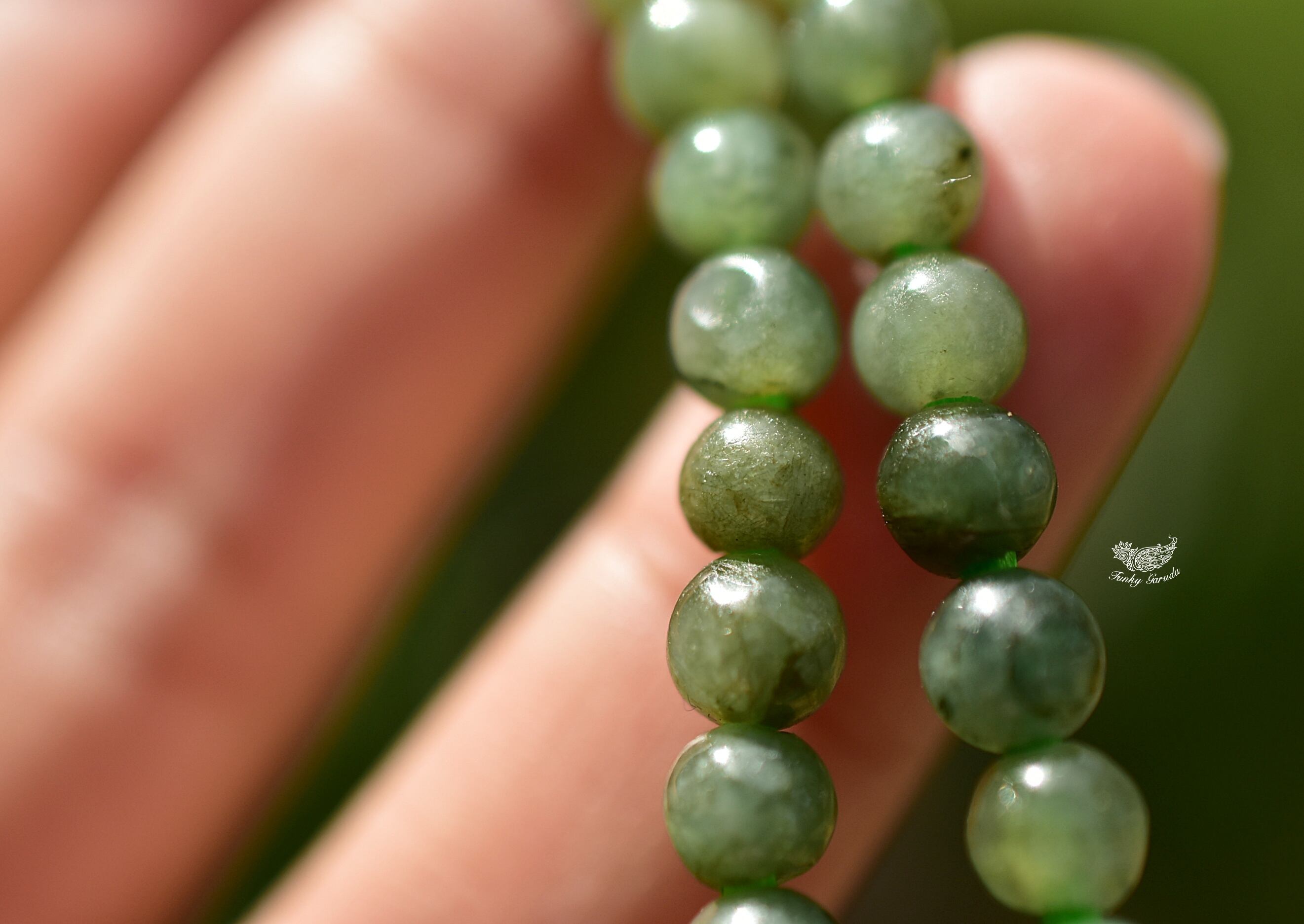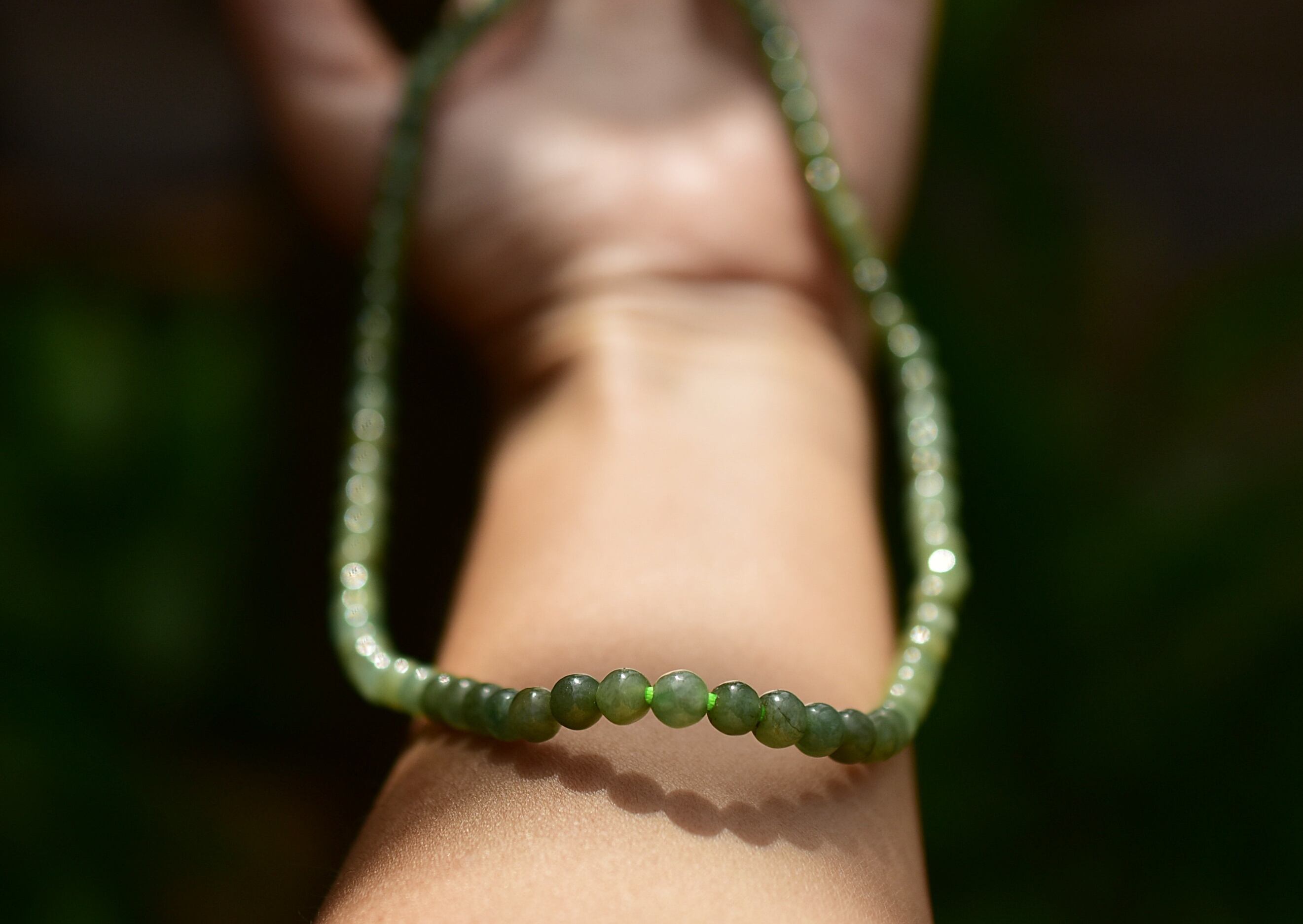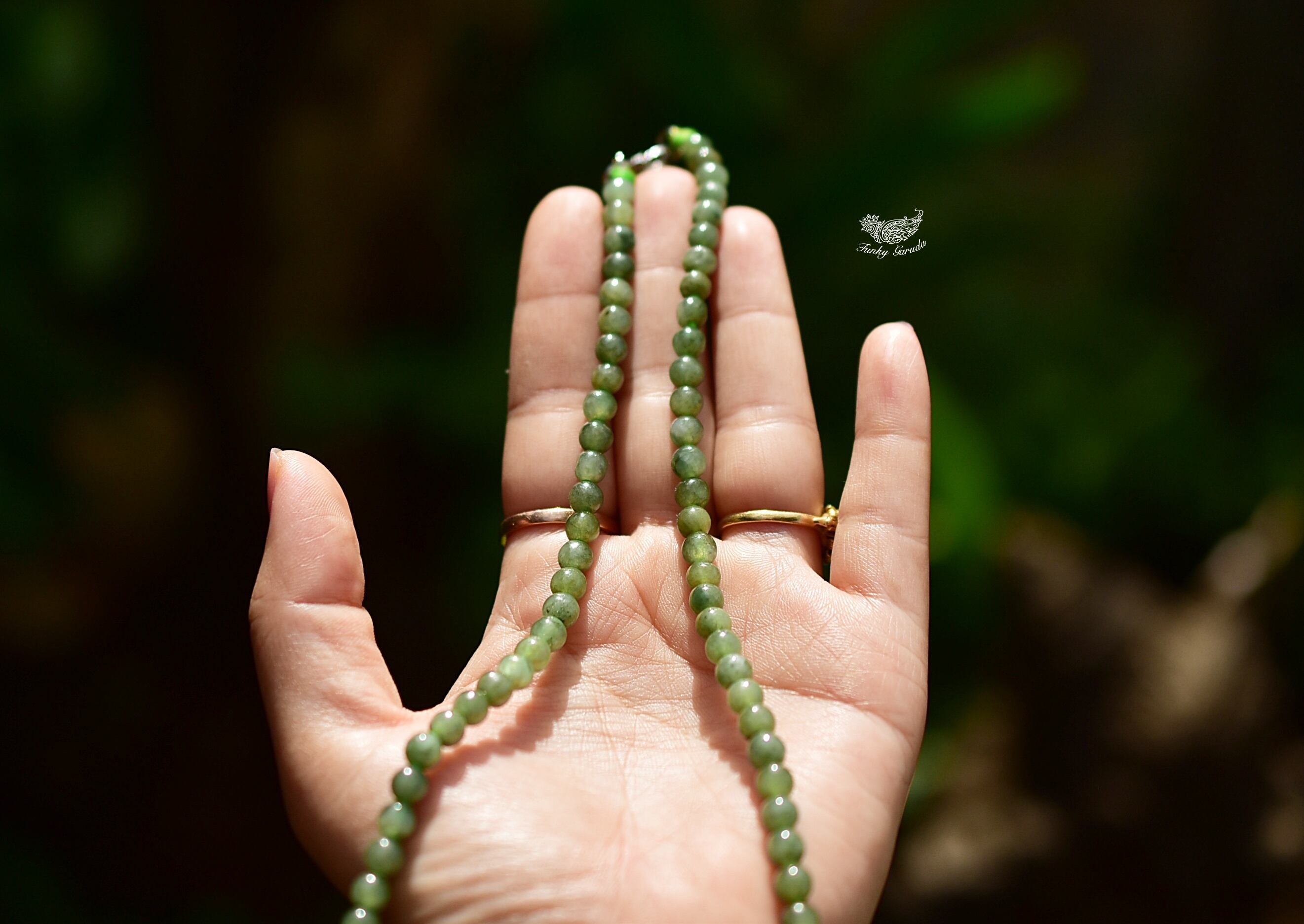 オリエンタルなイメージのミャンマー翡翠は身に付けるとぐっと引き締まる色合いです。