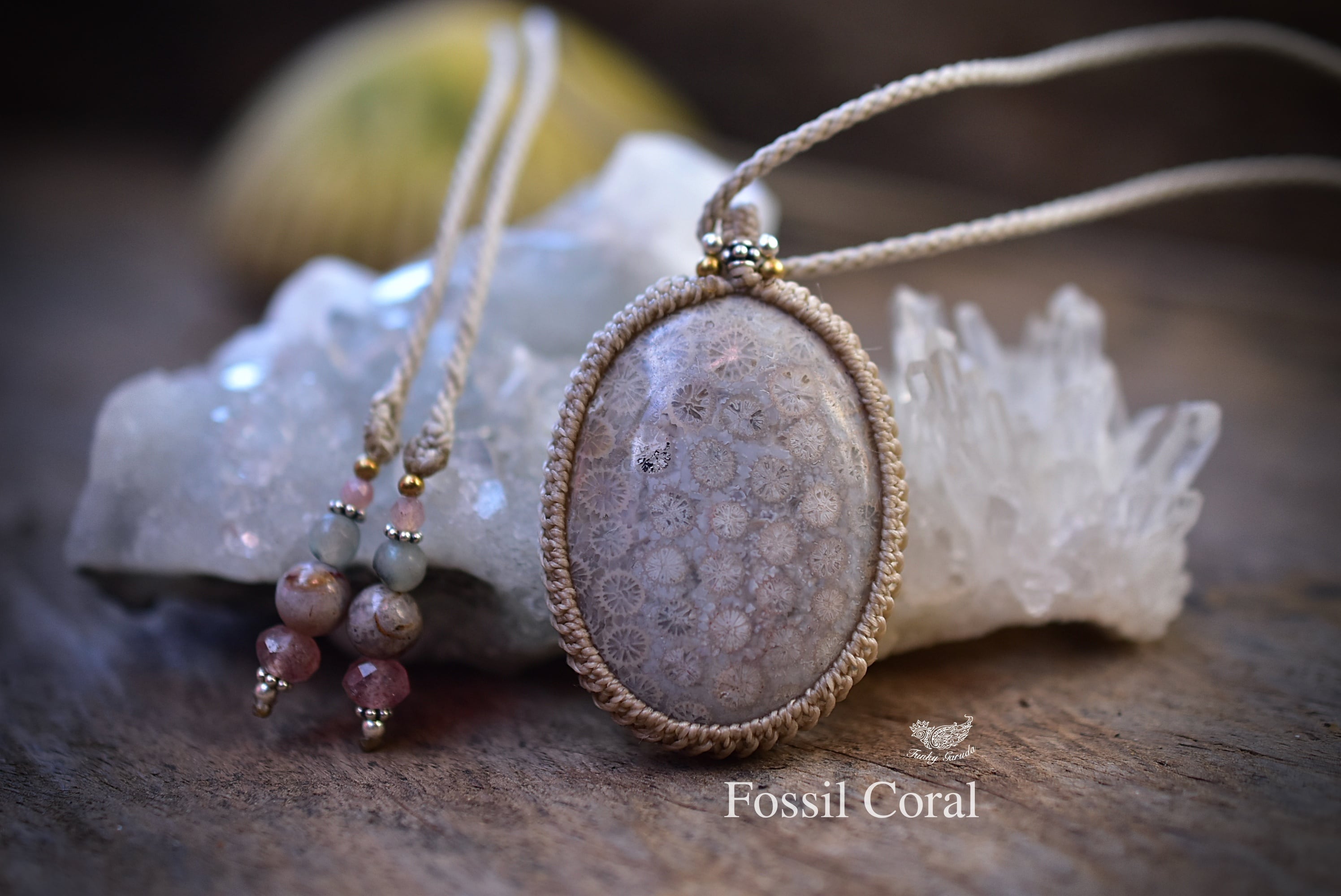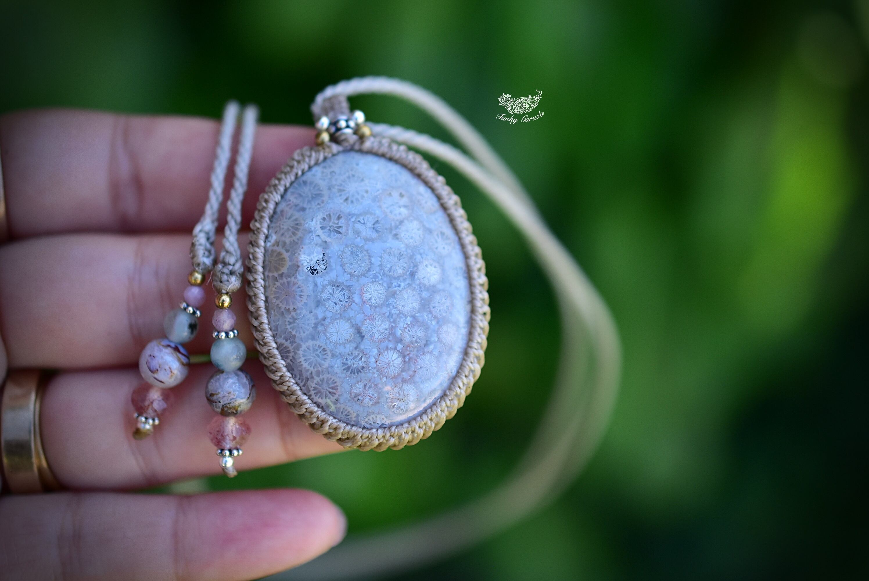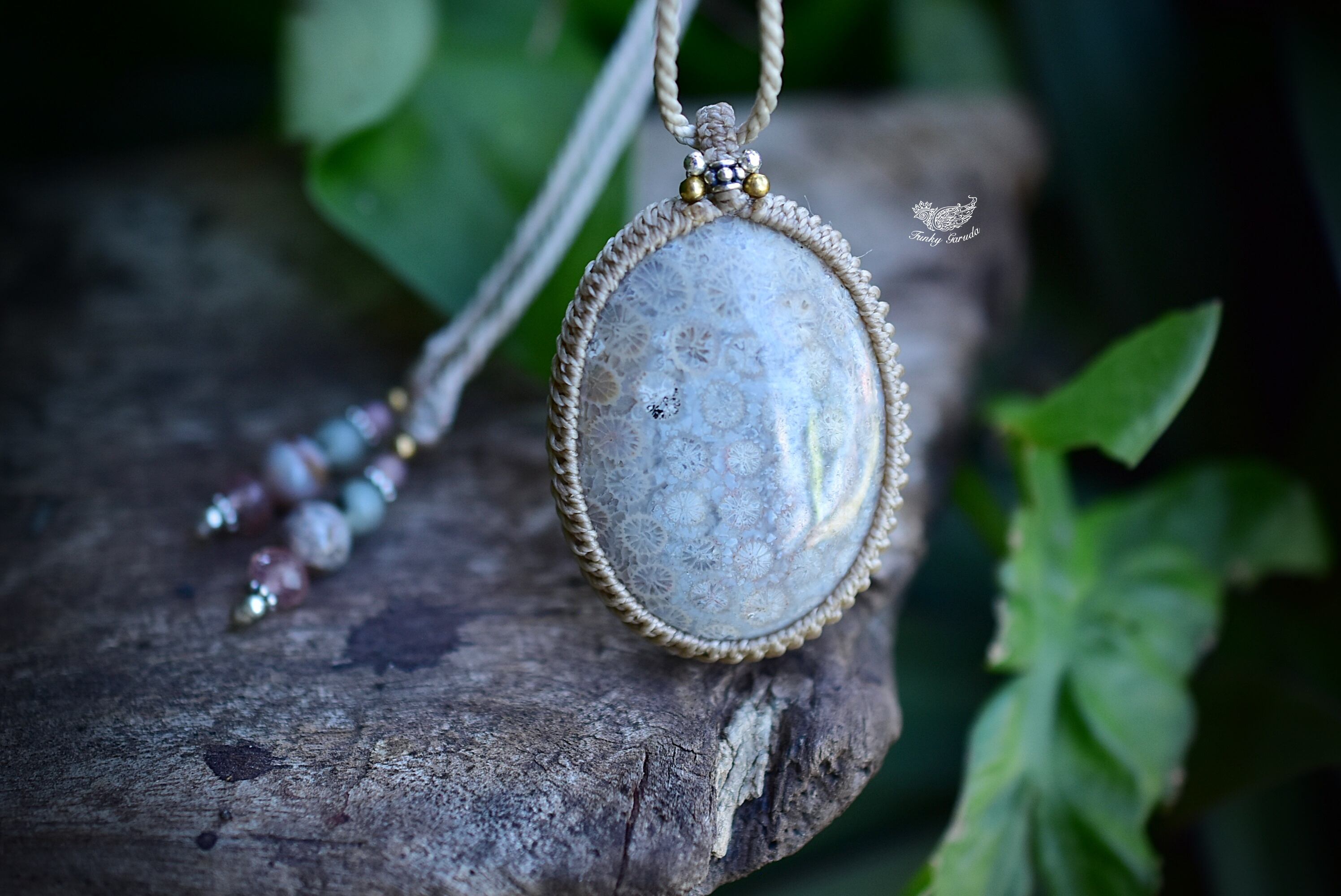 古代の菊花★フォッシルコーラル マクラメペンダント818