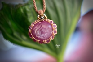 ◆このたびはミルクココア、キャラメル色の蝋引き糸を使用しマクラメ編み装飾を施しました。