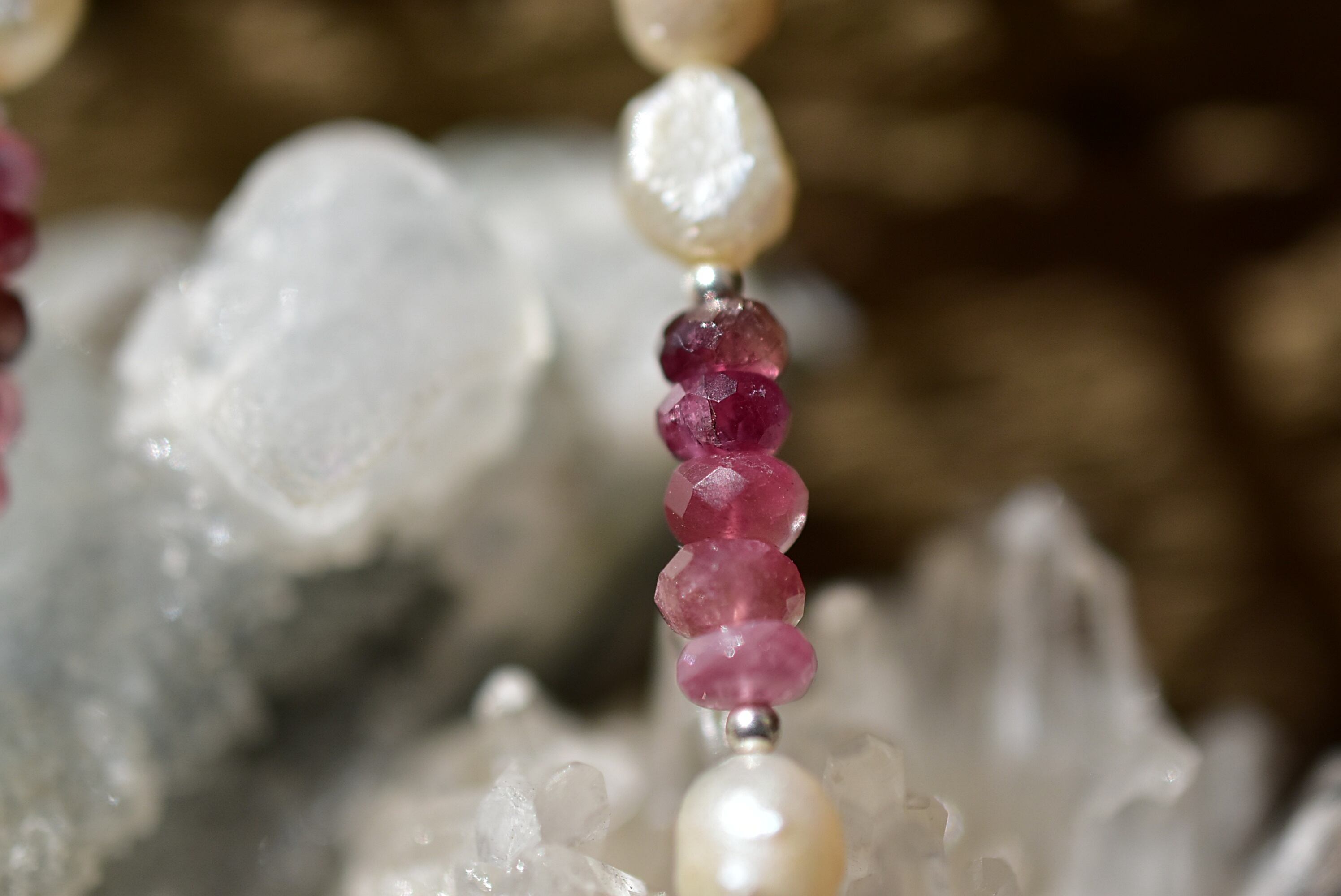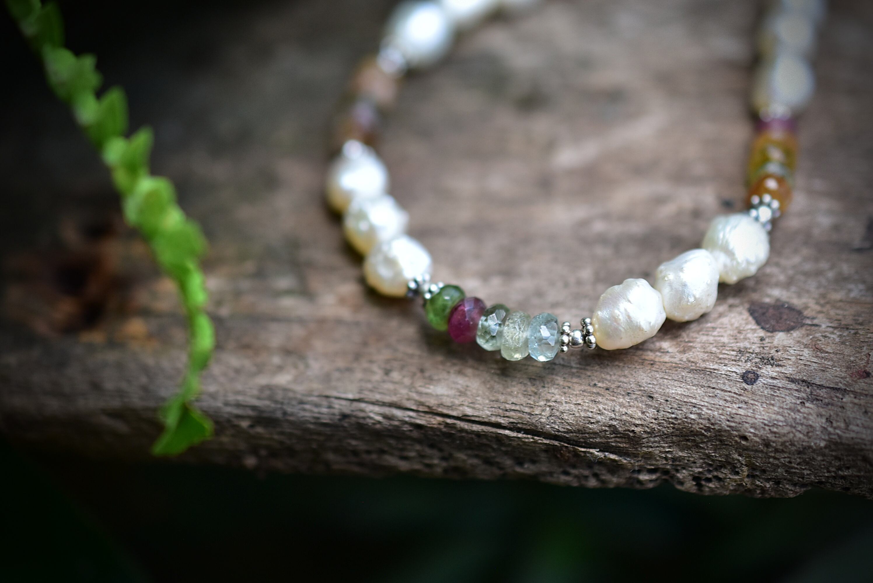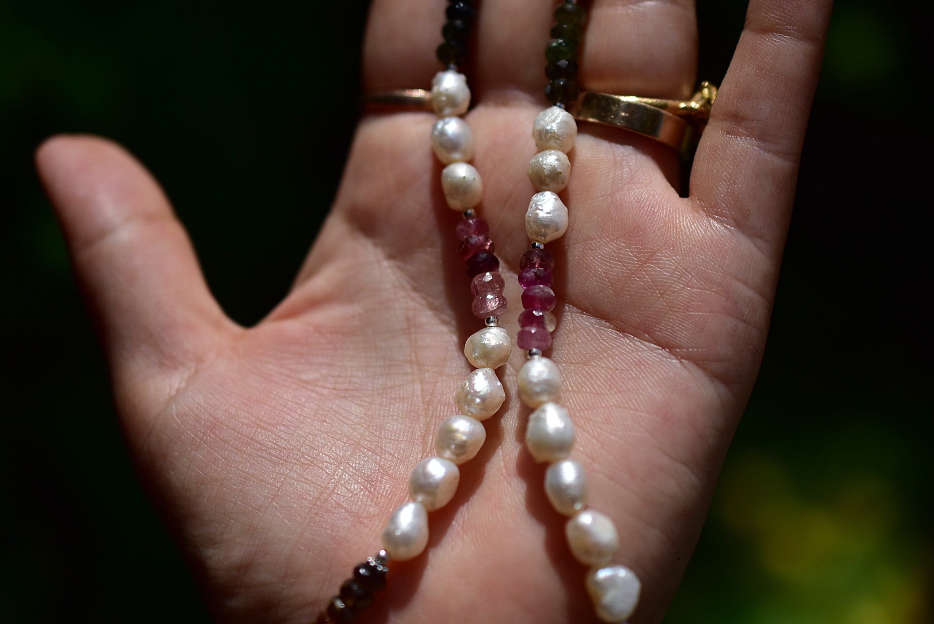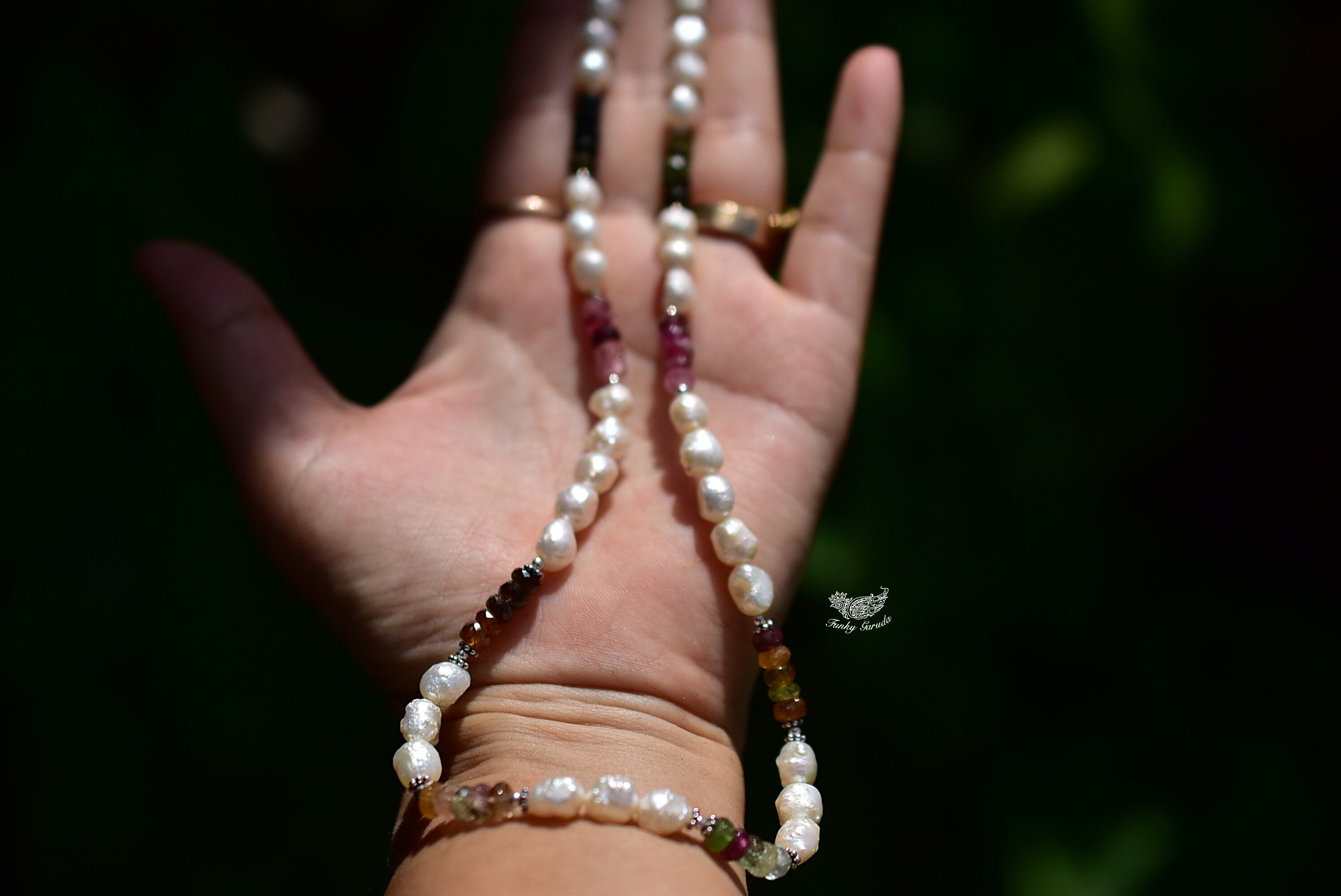 ひと粒ひと粒パールとトルマリンビーズを見立てて