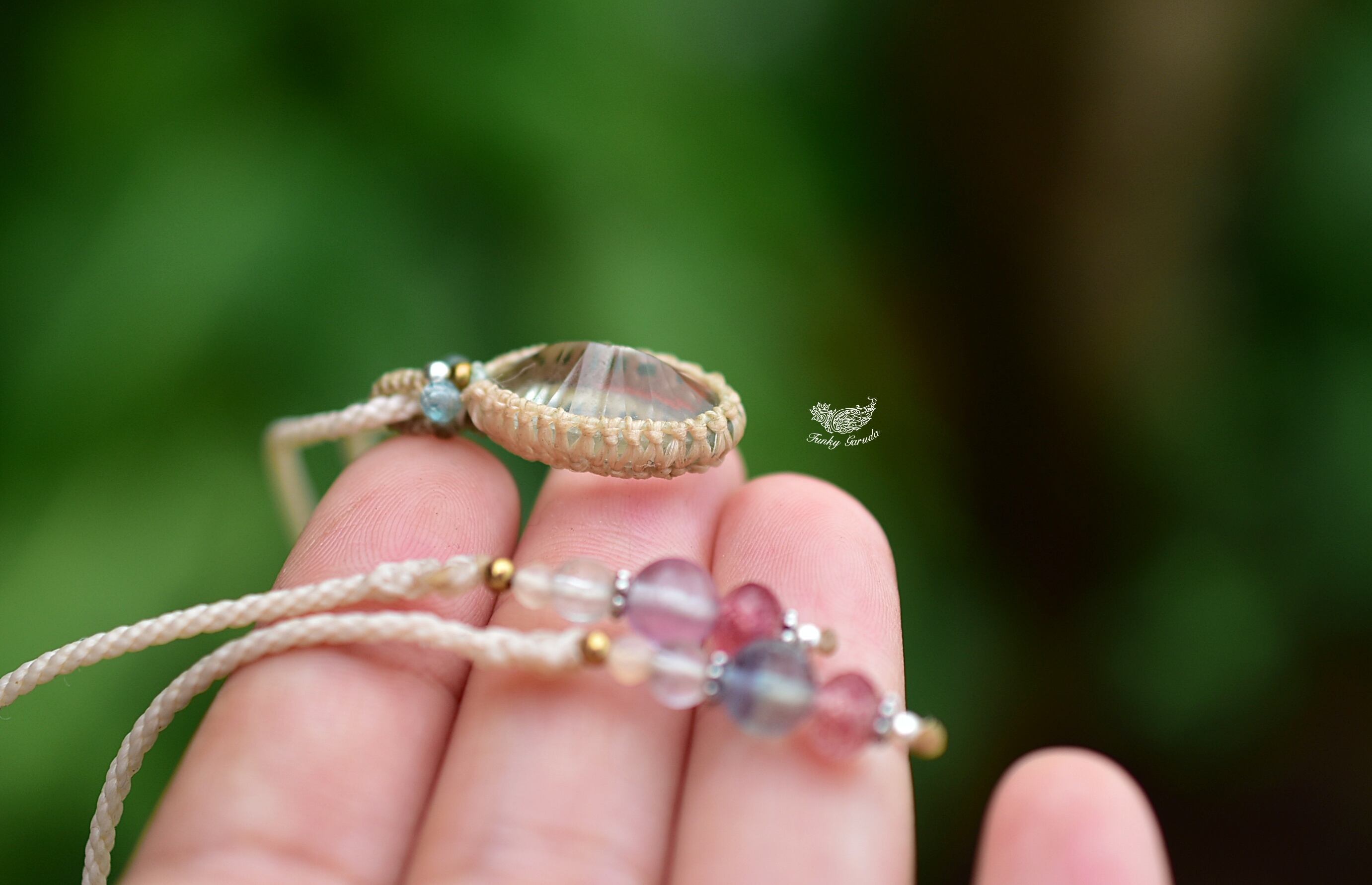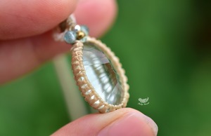 ◆このたびはキャラメル、ナチュラルホワイト色の蝋引き糸を使用しマクラメ編み装飾を施しました。