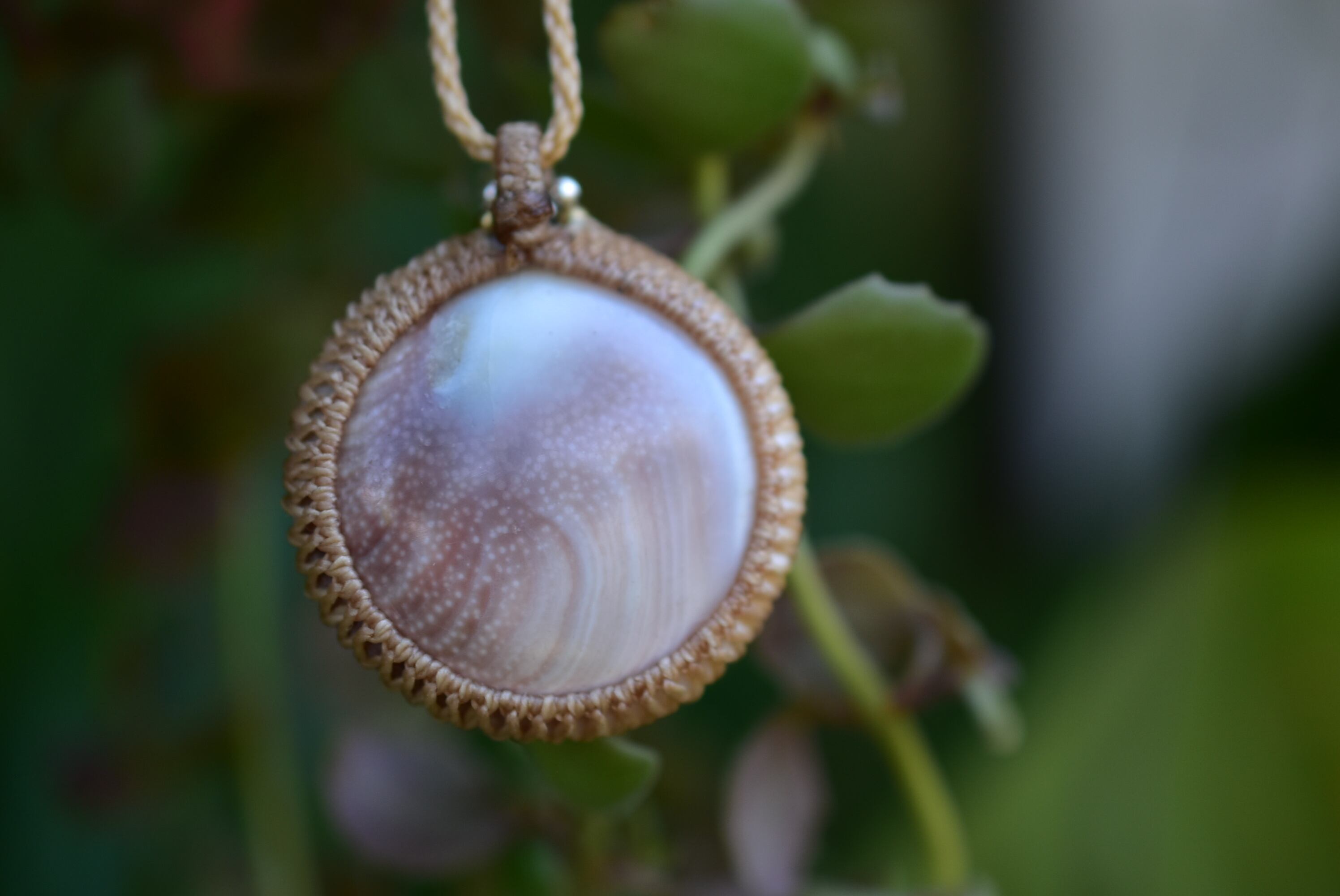 ◆このたびは ナチュラルキナリ色の蝋引き糸を使用しマクラメ編み装飾を施しました。
