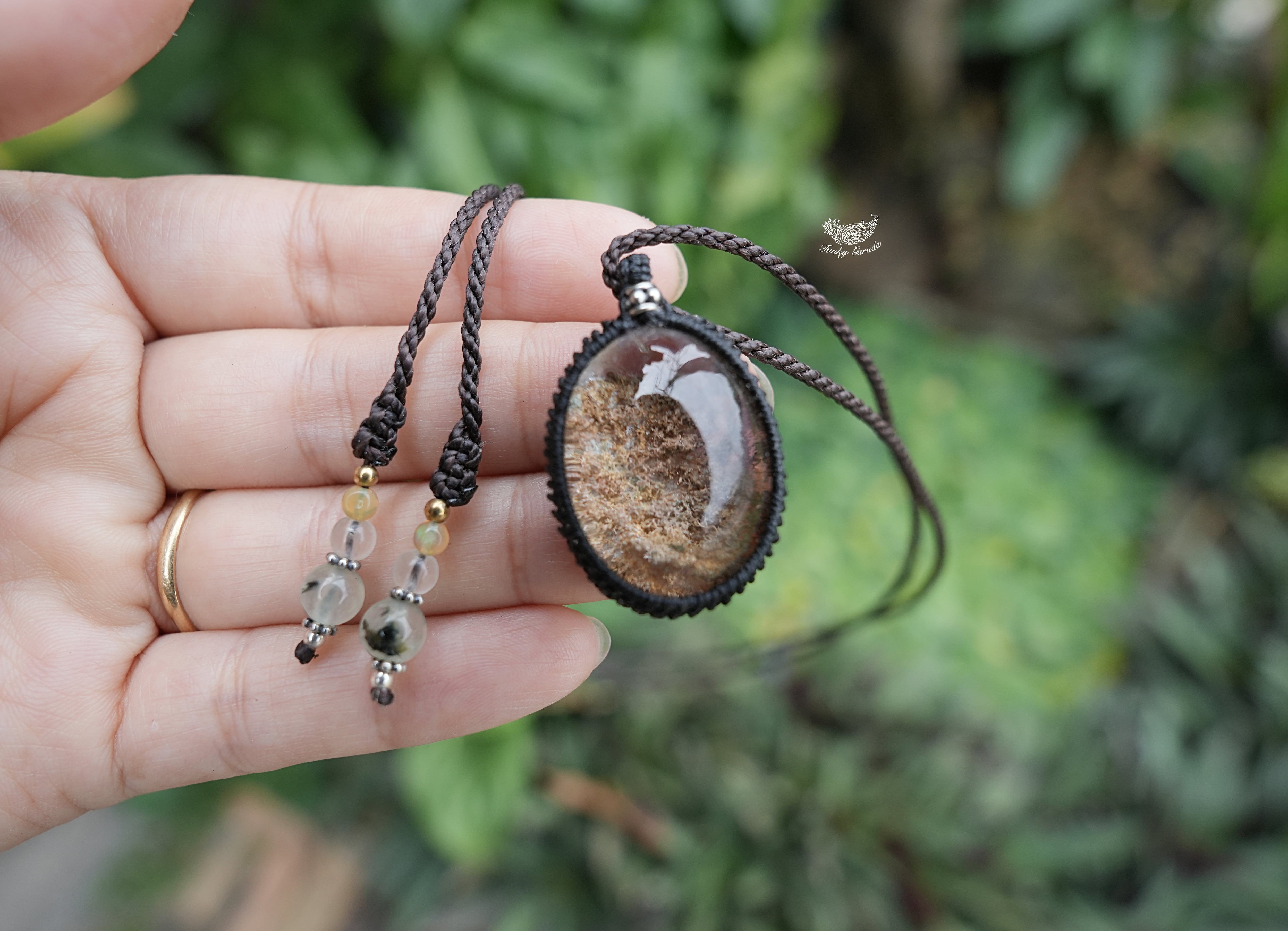 ◆このたびはブラック、ブラウン色のロウビキ糸を使用しマクラメ編み装飾を施しました。