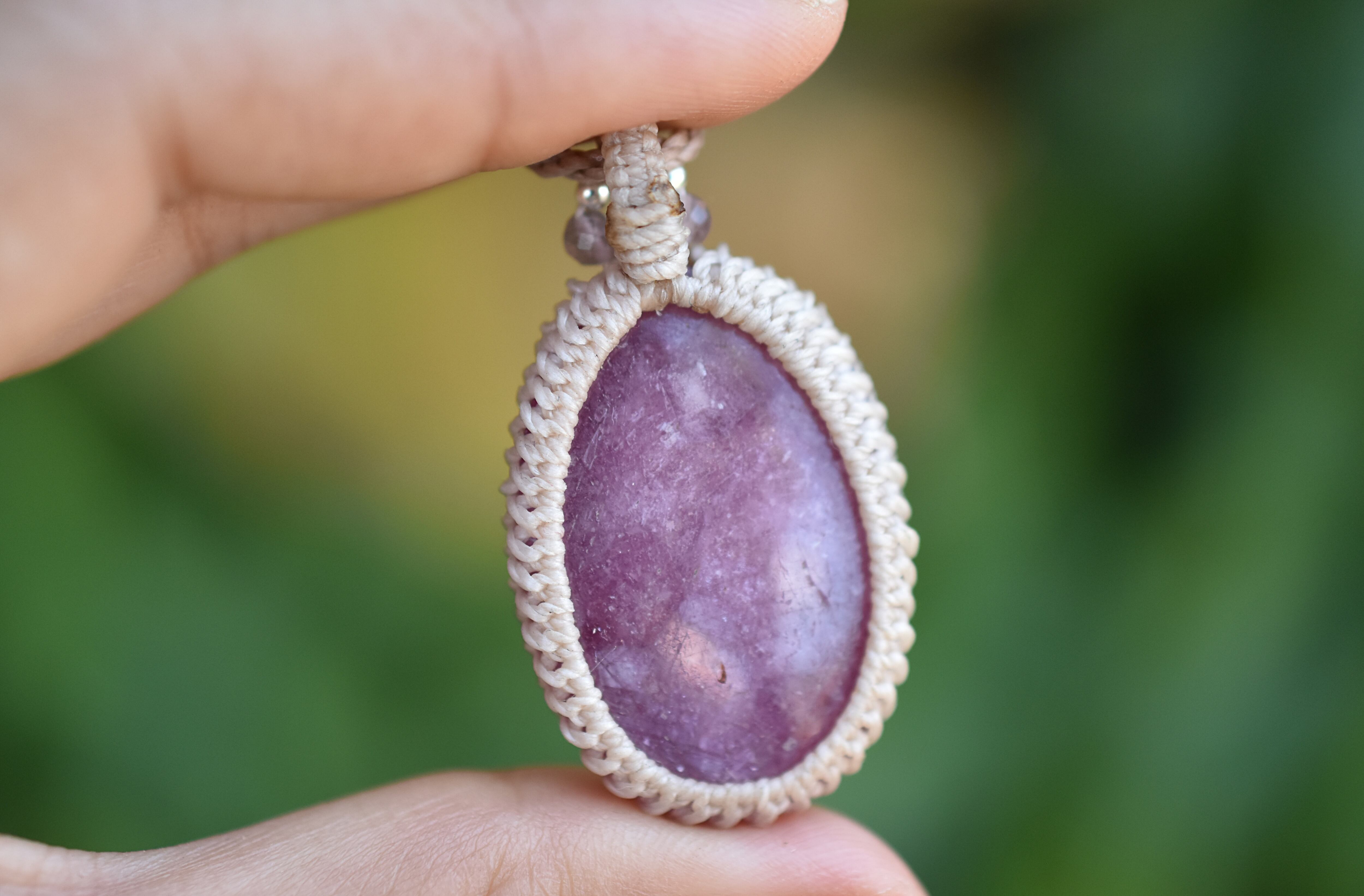 ◆このたびはカフェオレ色の蝋引き糸を使用しマクラメ編み装飾を施しました。