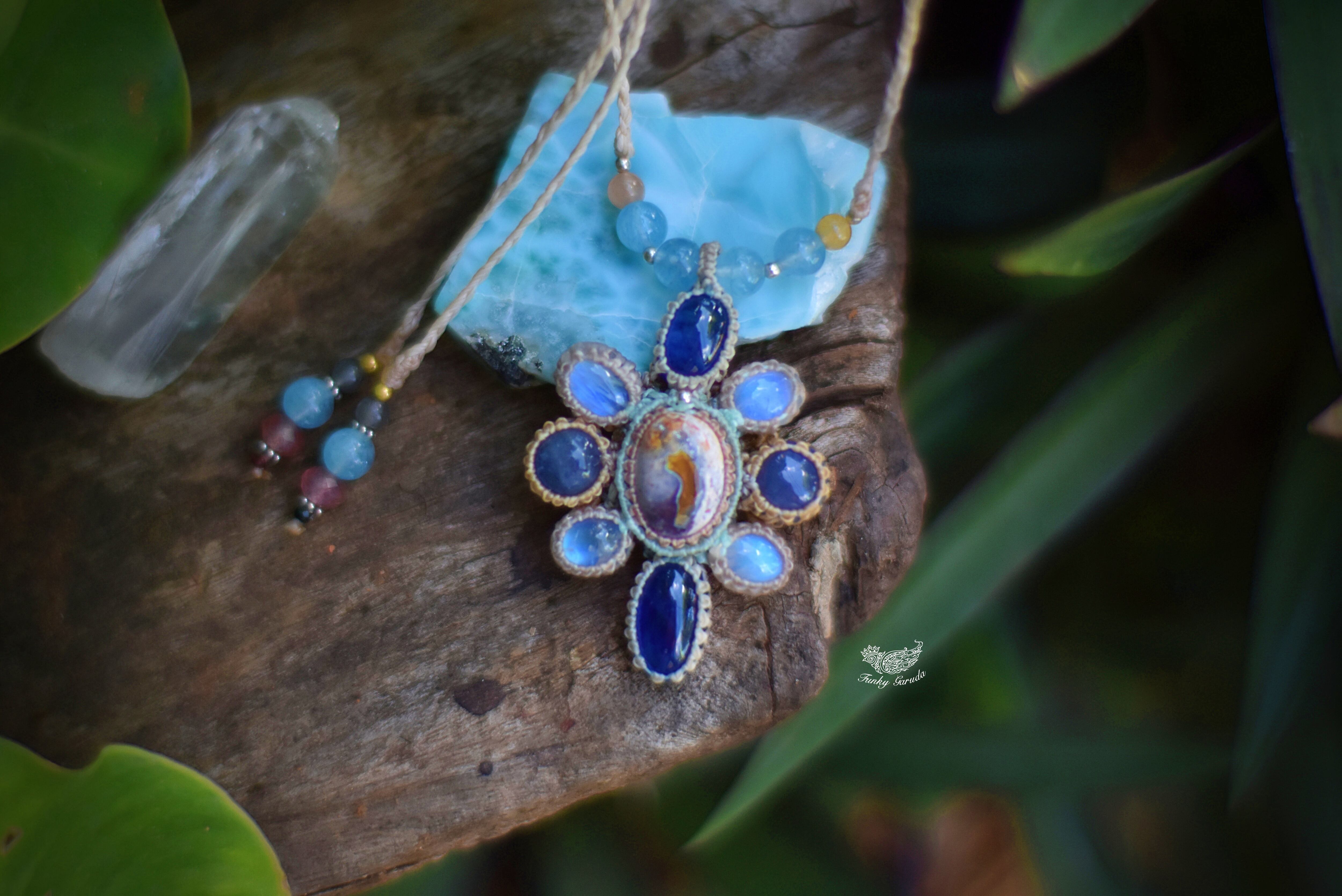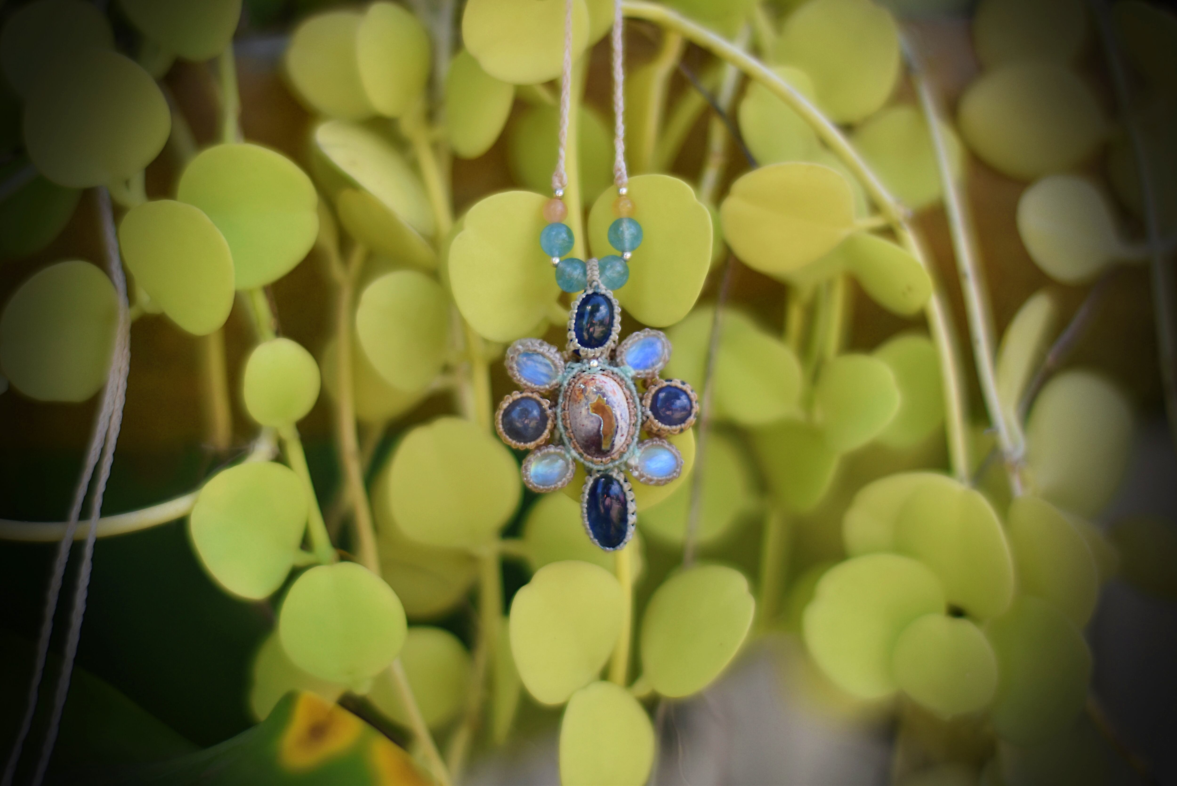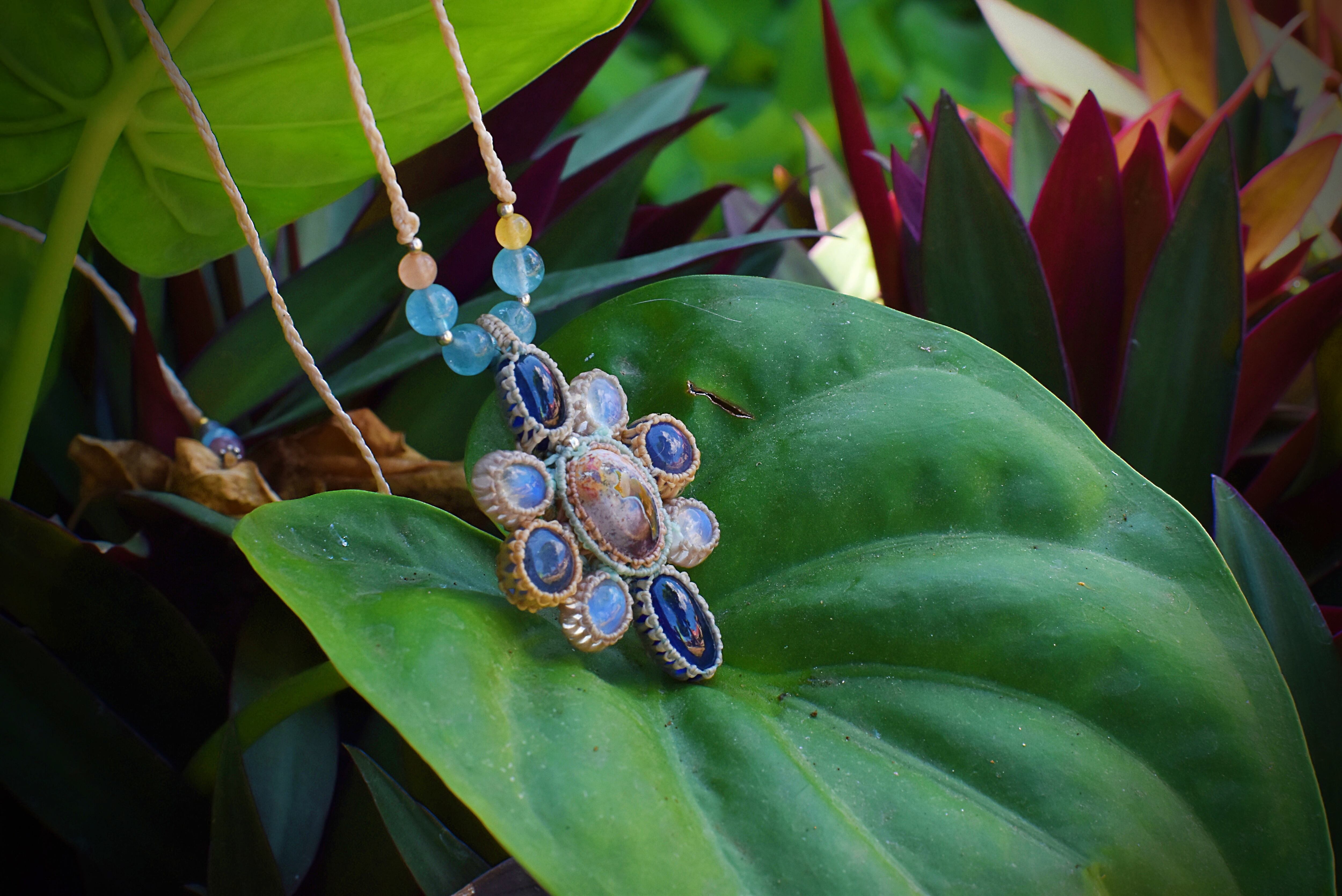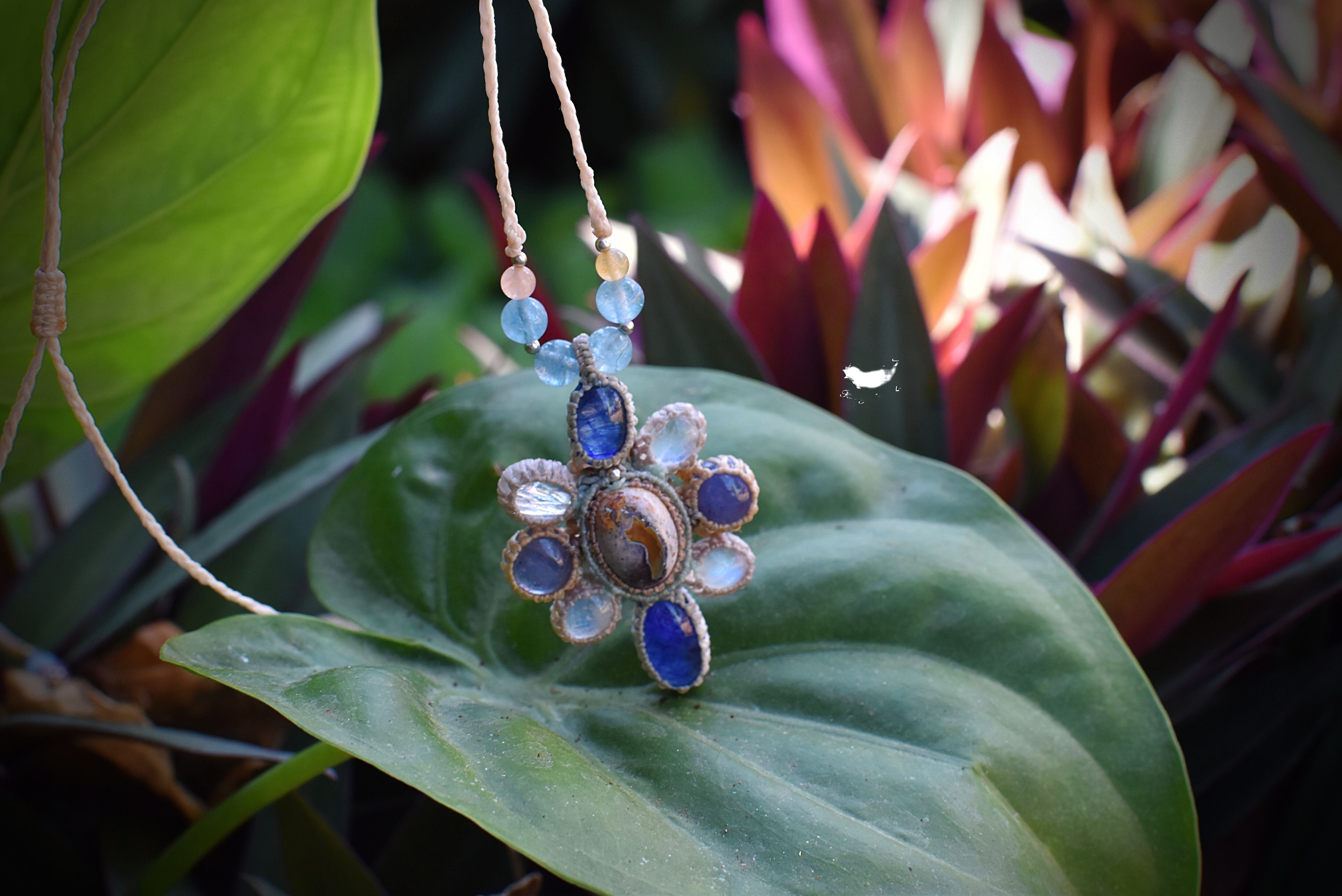 ◆このたびはミルクココア、キャラメル、ナチュラルホワイト、ミント色の蝋引き糸を使用しマクラメ編み装飾を施しました。
