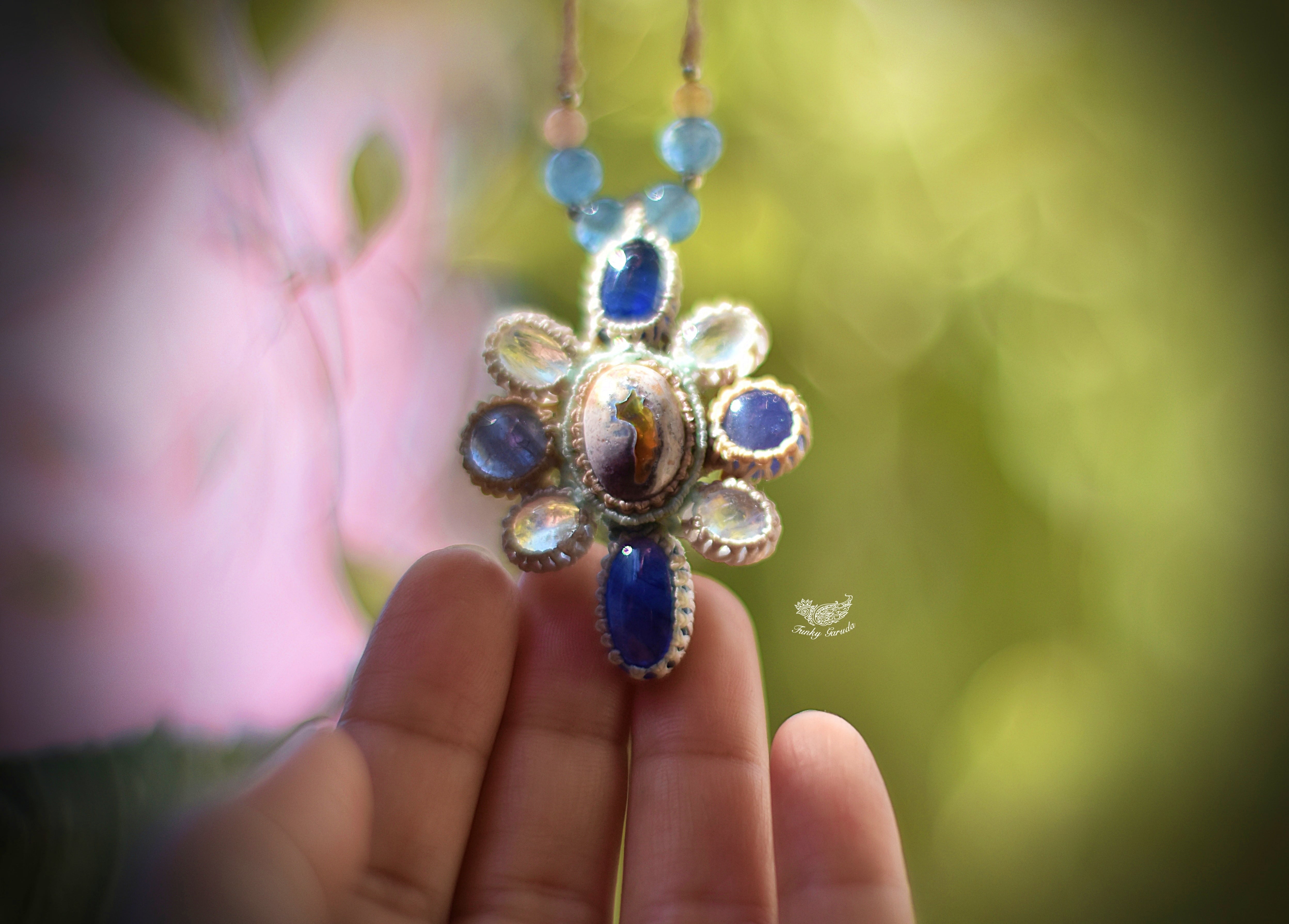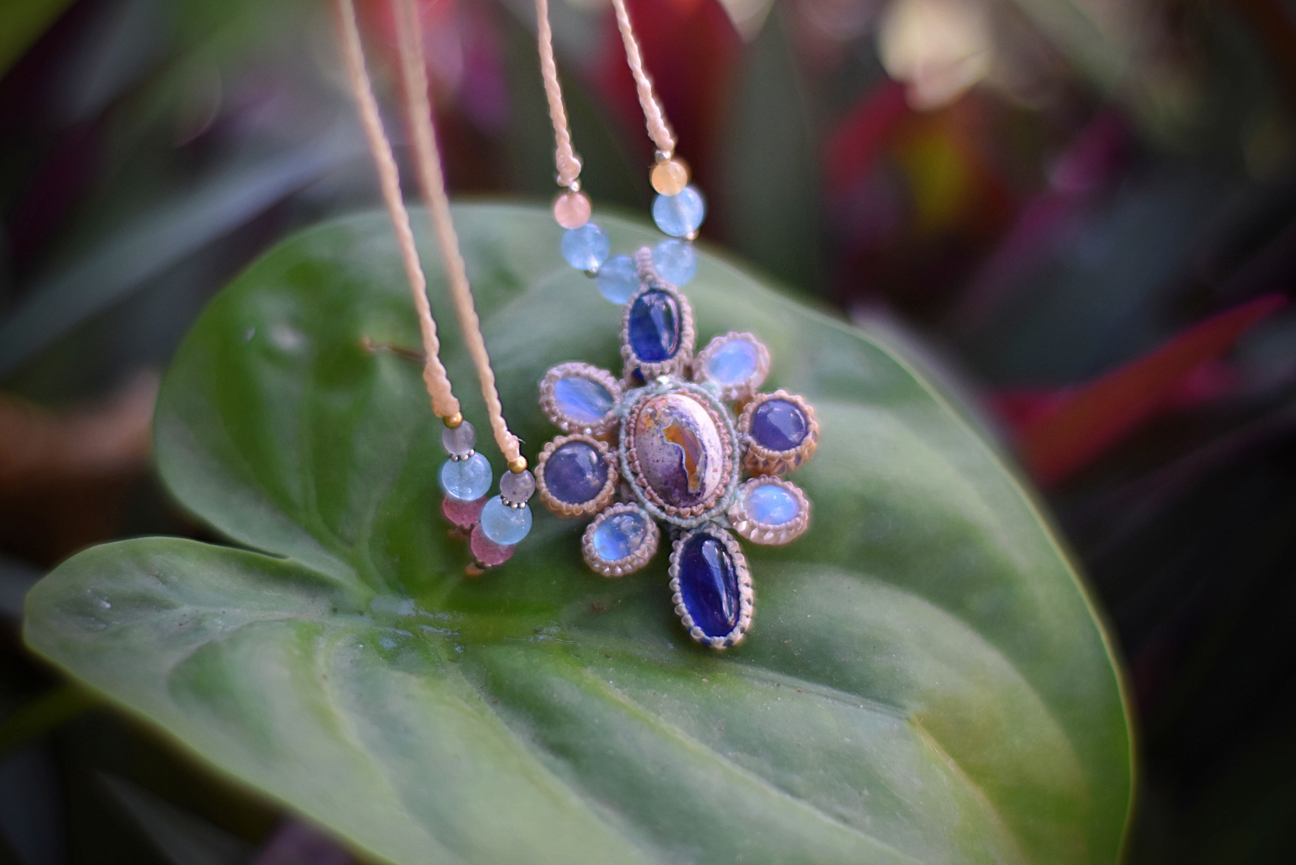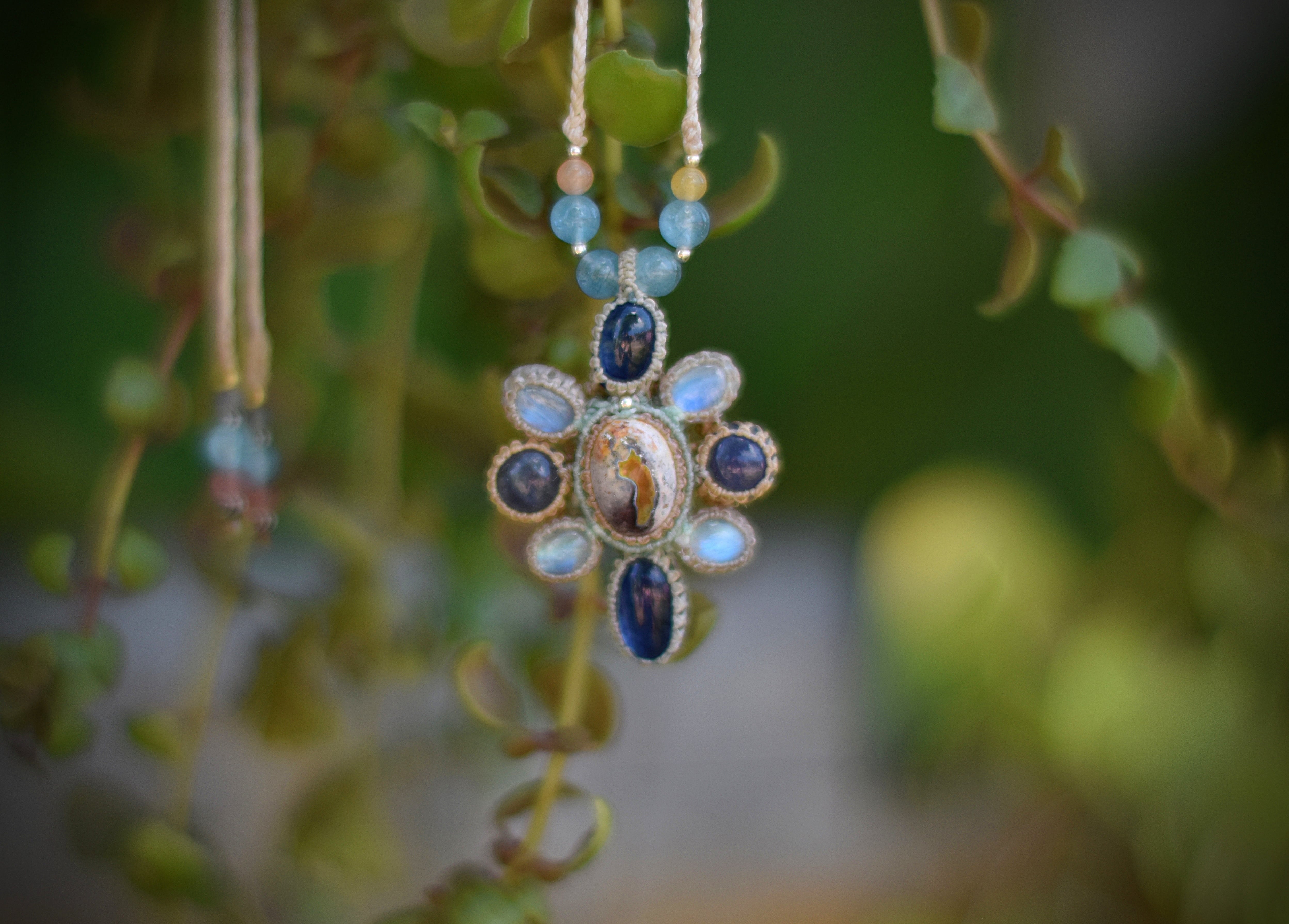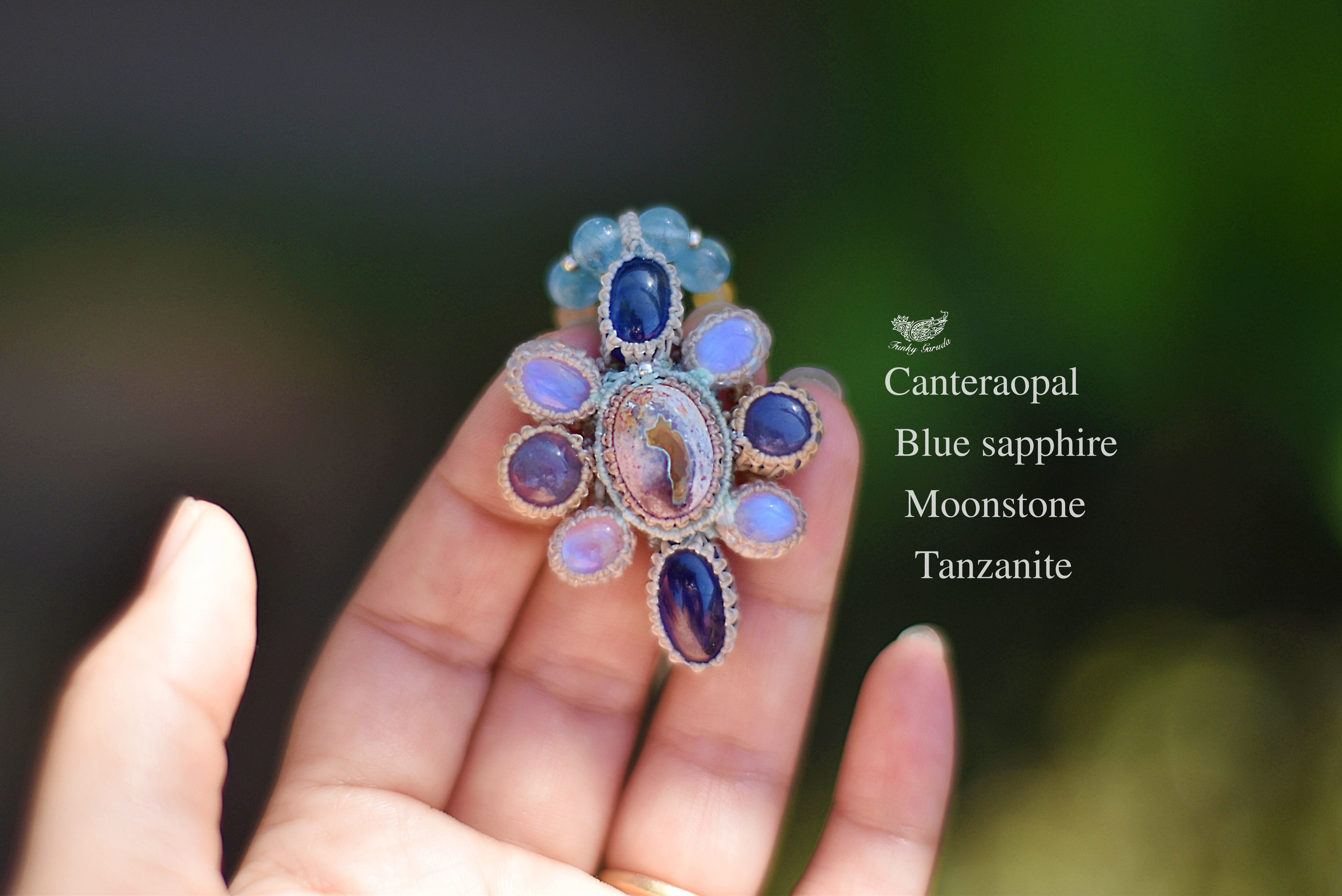 ◆このたびはミルクココア、キャラメル、ナチュラルホワイト、ミント色の蝋引き糸を使用しマクラメ編み装飾を施しました。