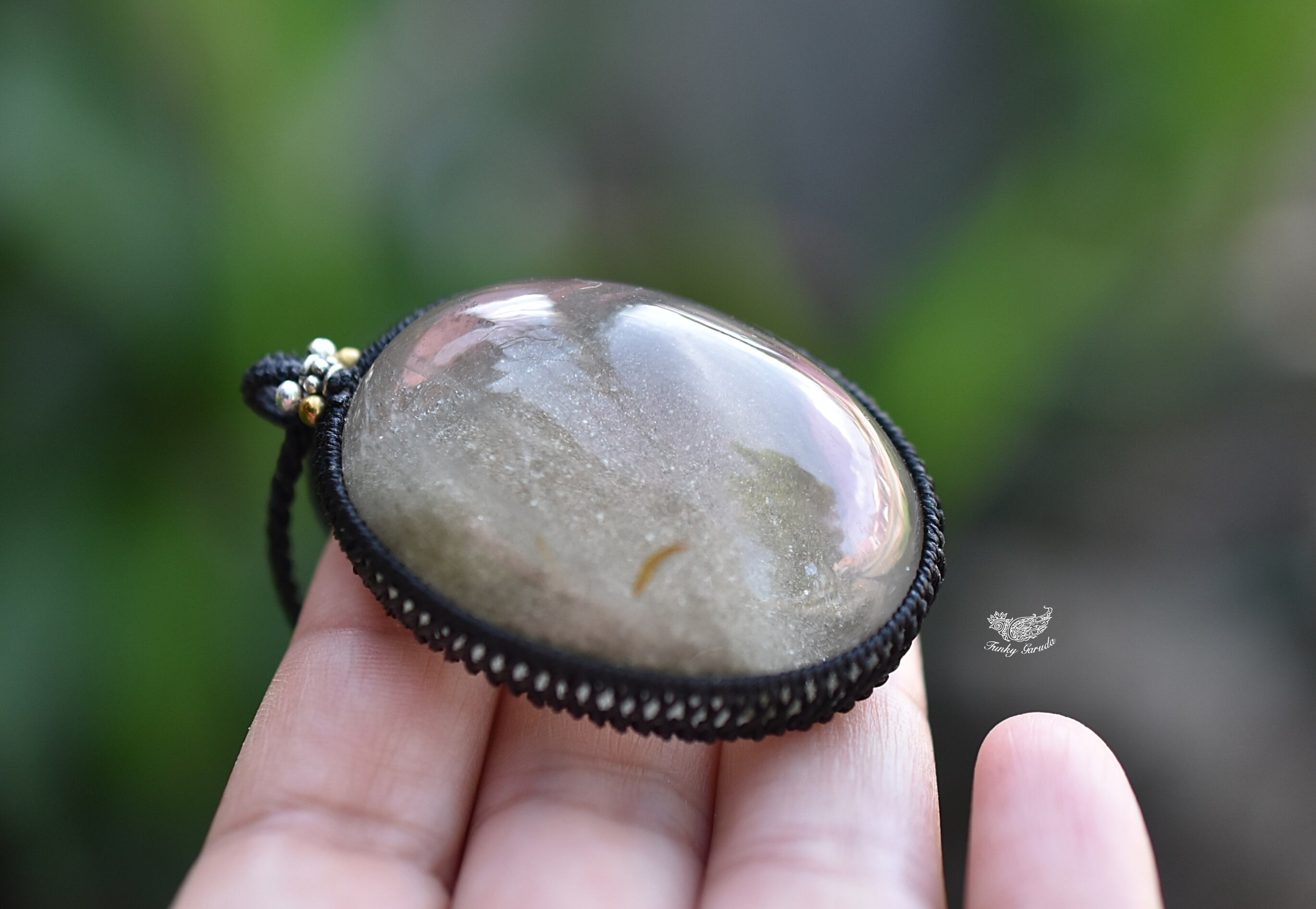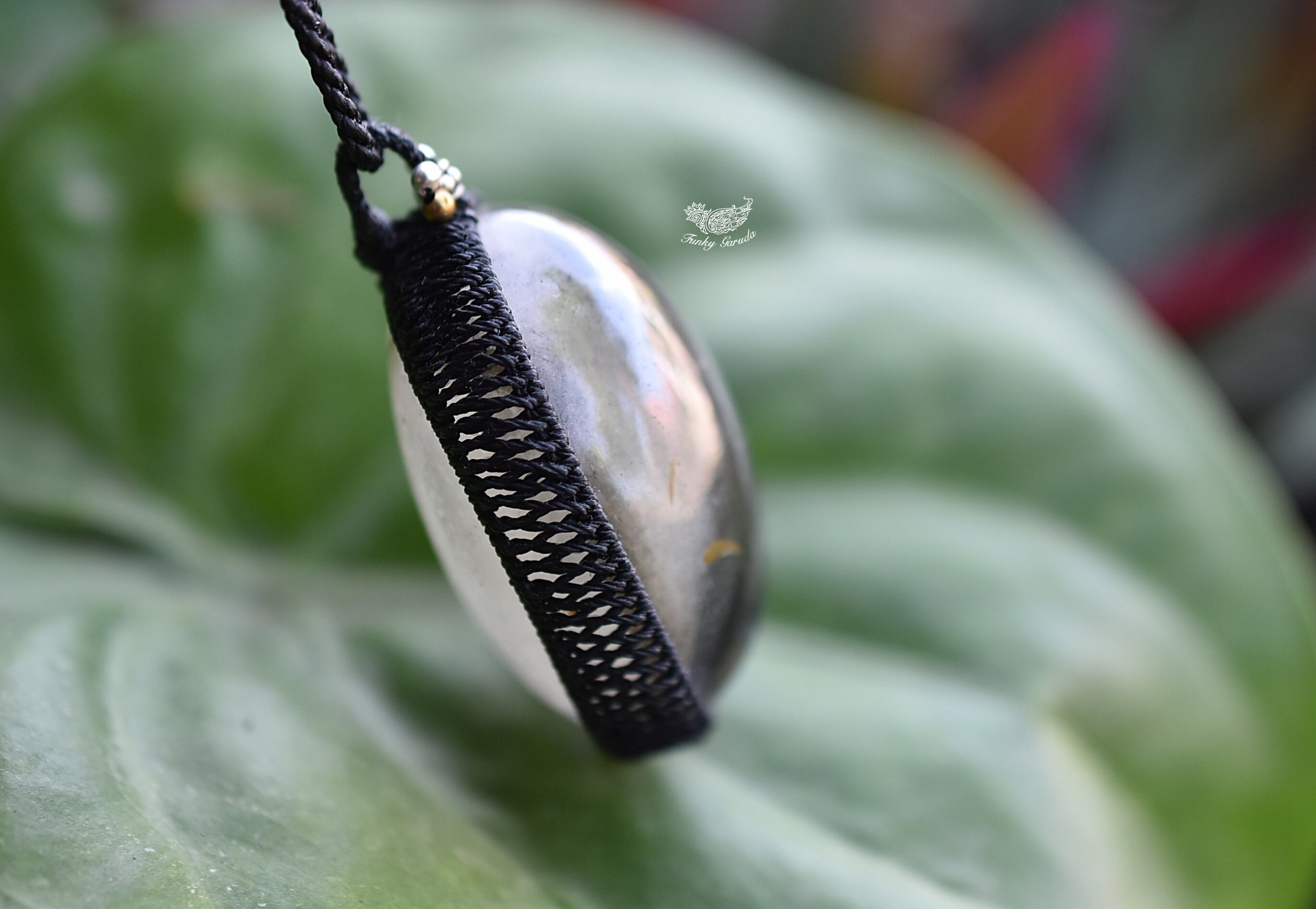 ◆このたびはブラック色の蝋引き糸を使用しマクラメ編み装飾を施しました。