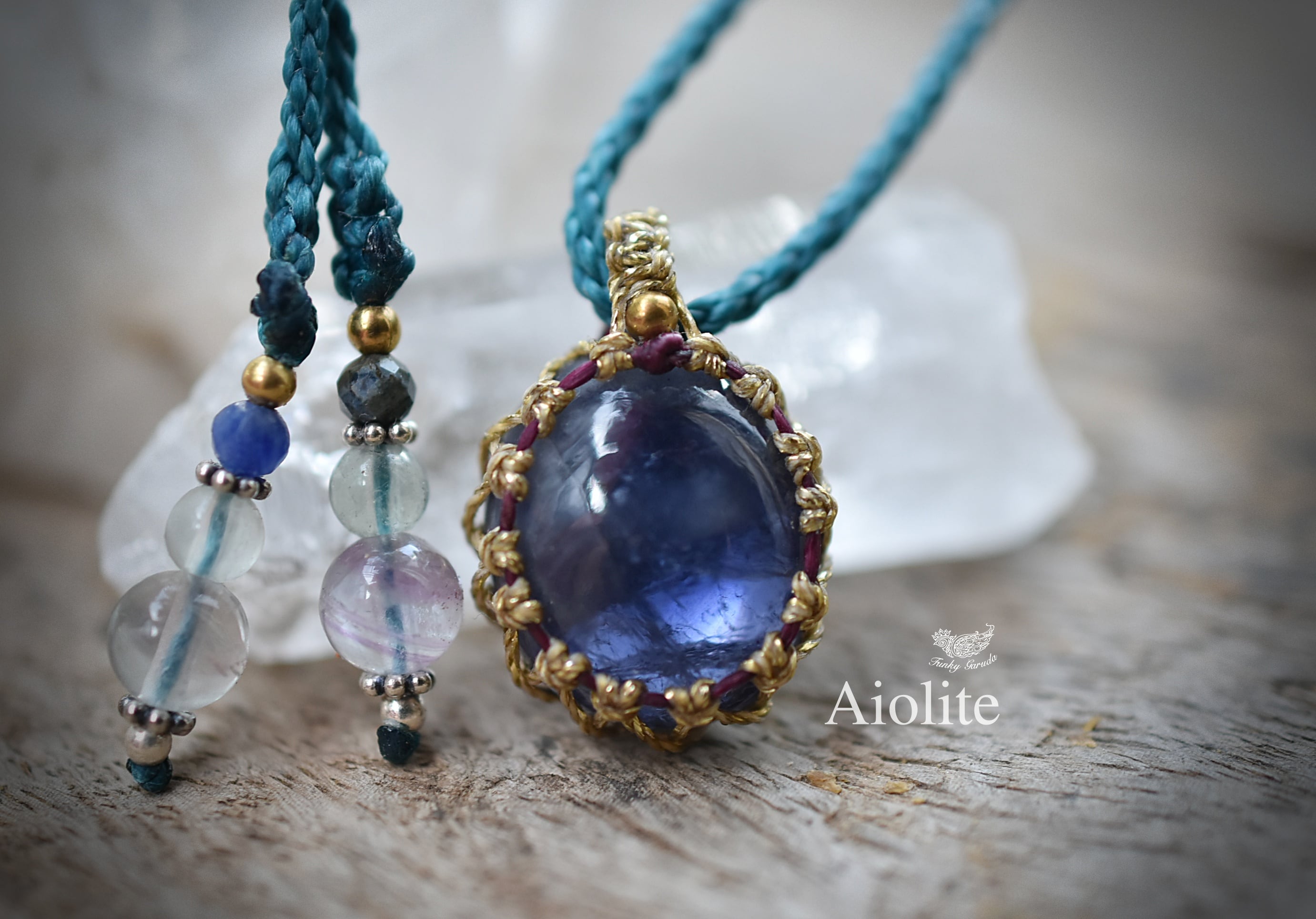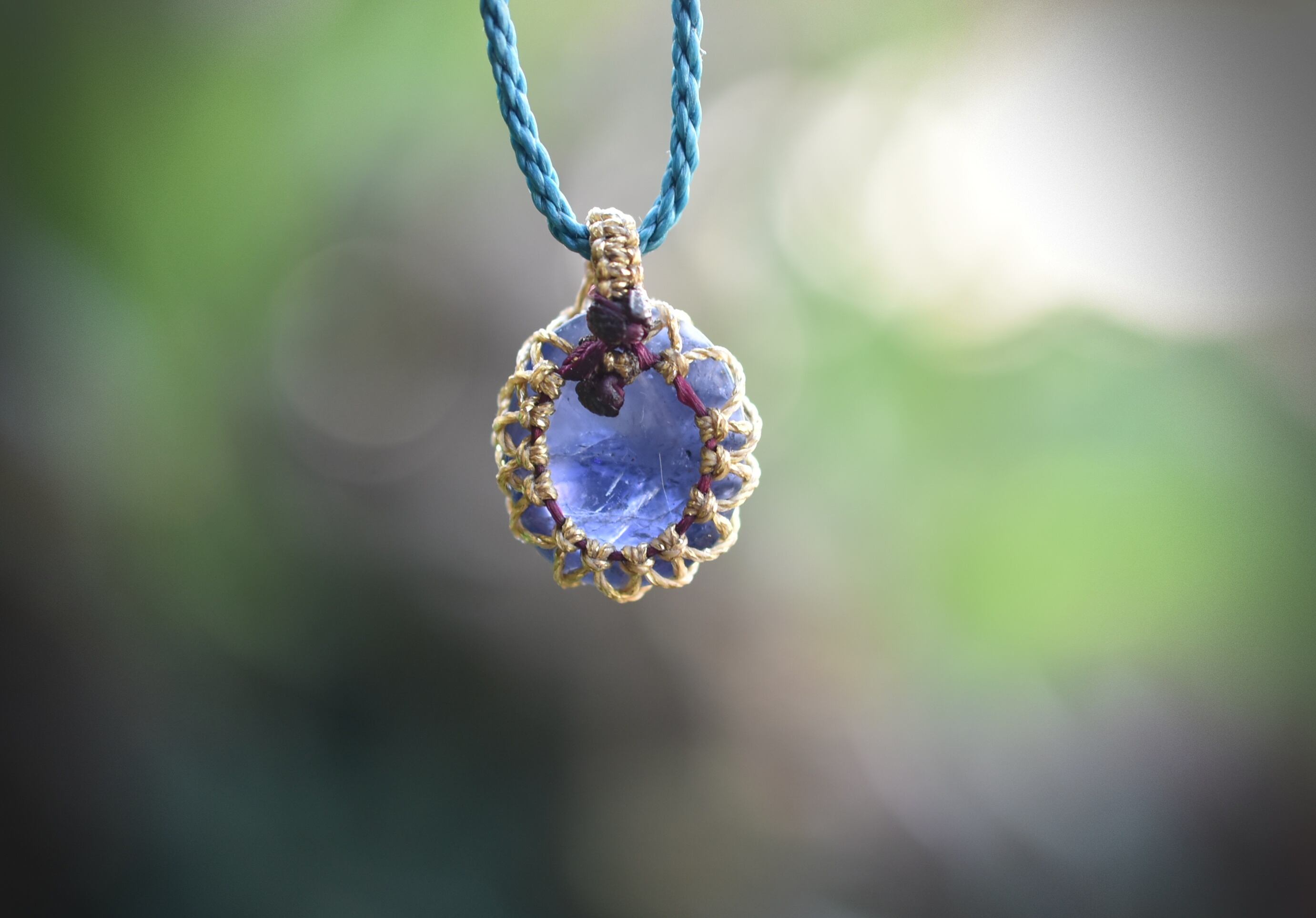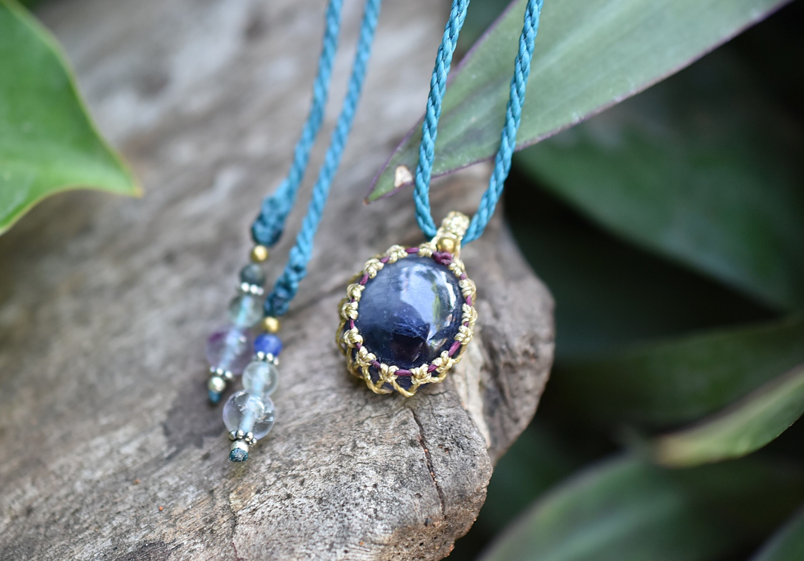 ◆このたびはゴールド、ボルドー、ブルー色の蝋引き糸を使用しマクラメ編み装飾を施しました。