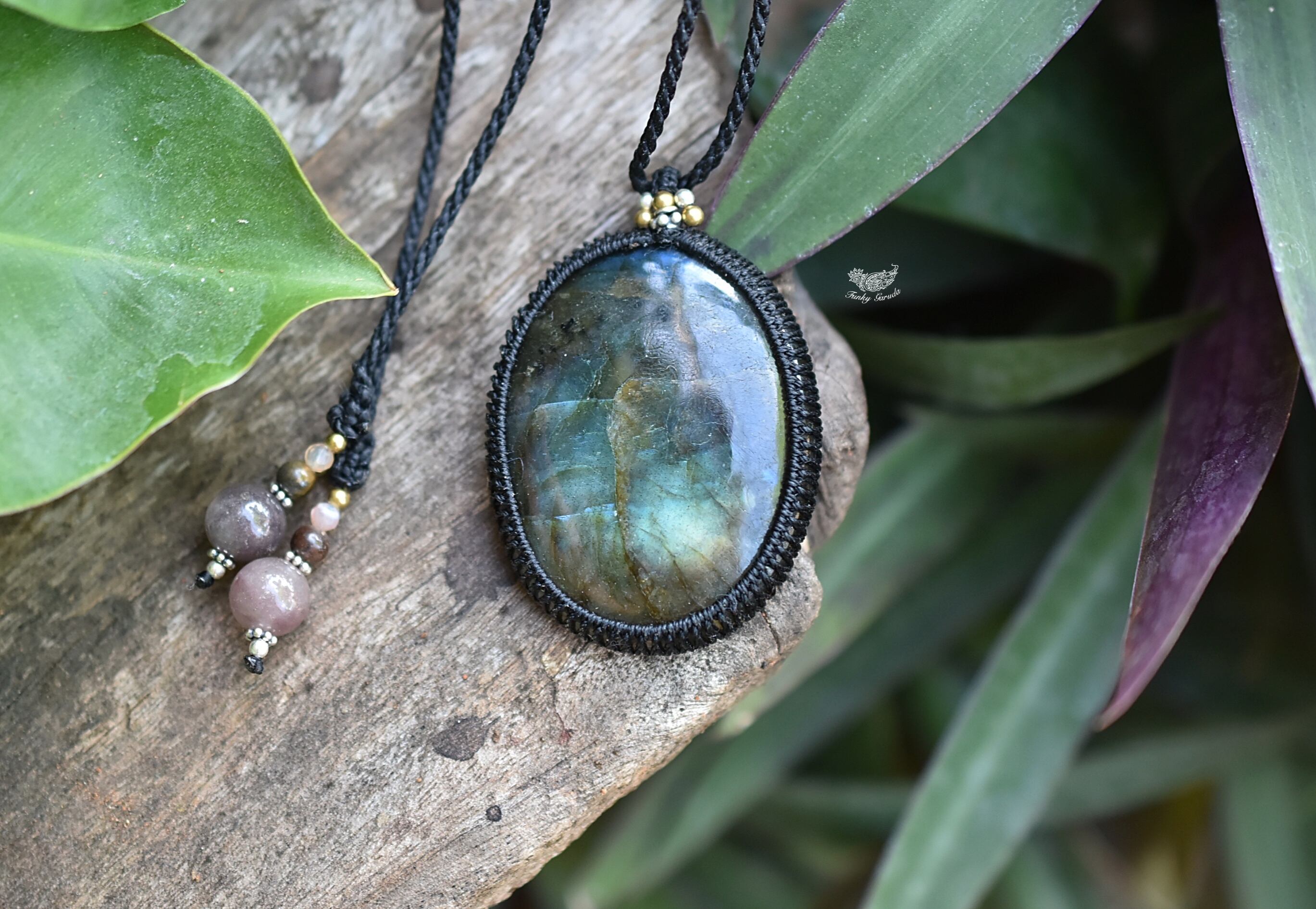 ◆このたびはブラック色の蝋引き糸を使用しマクラメ編み装飾を施しました。