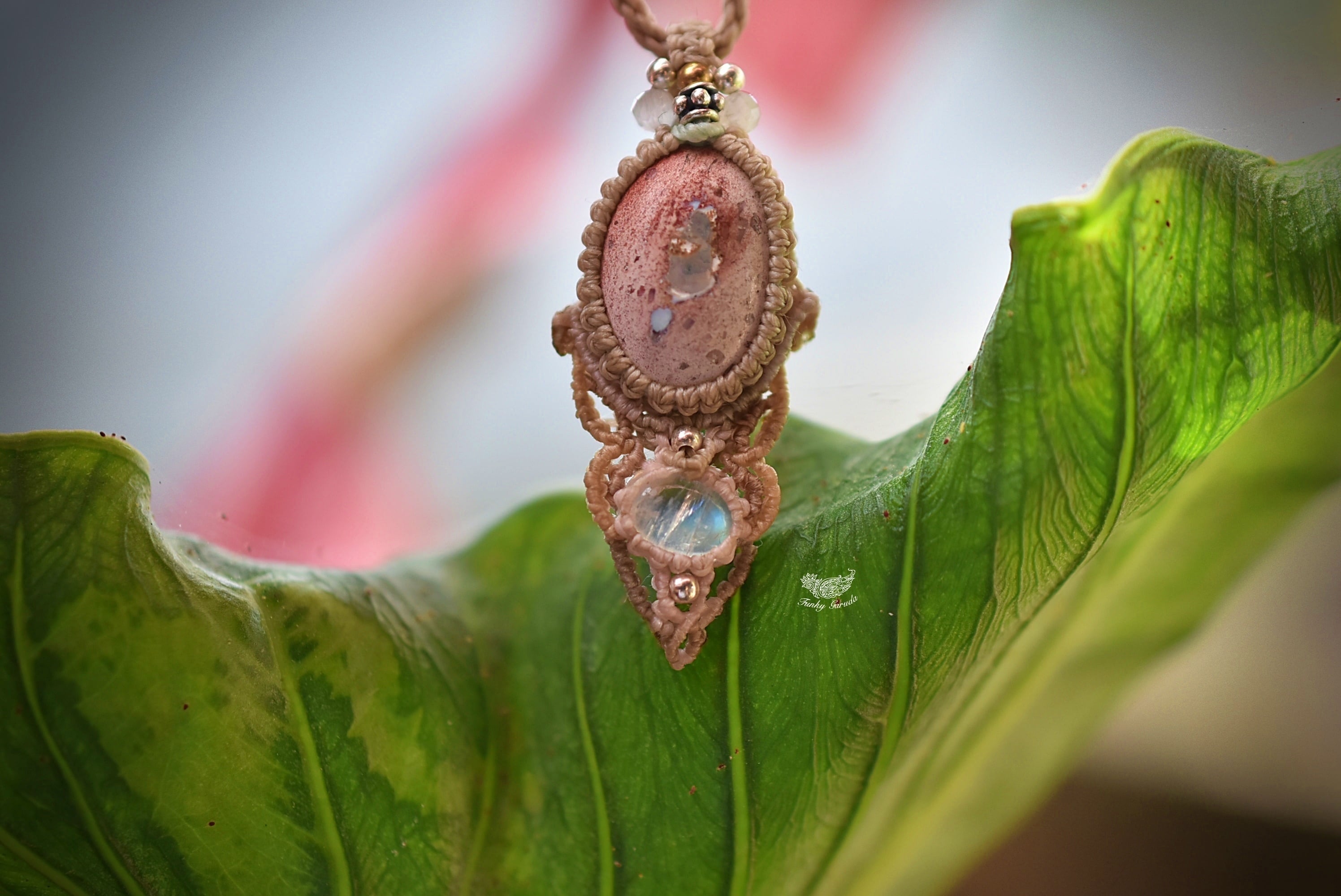 ◆このたびはカフェオレ、ナチュラルホワイト、ピンク色の蝋引き糸を使用しマクラメ編み装飾を施しました。