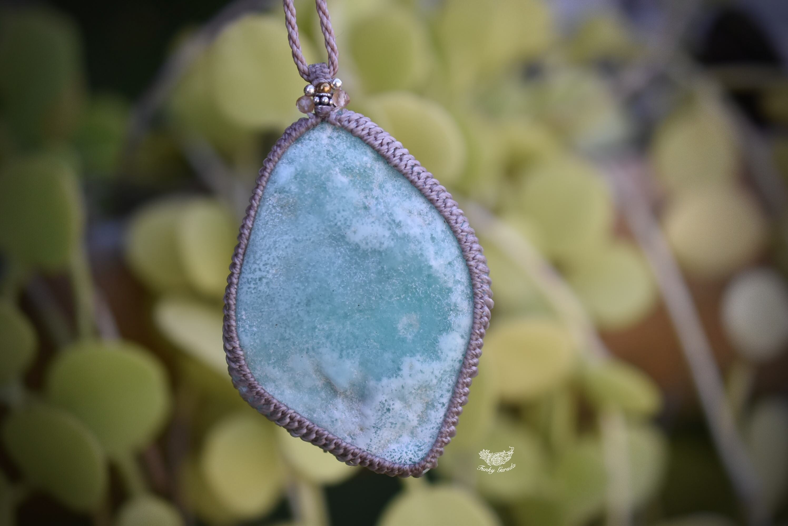 ◆このたびは、ヘンプ、ミルクココア色の蝋引き糸を使用しマクラメ編み装飾を施しました。