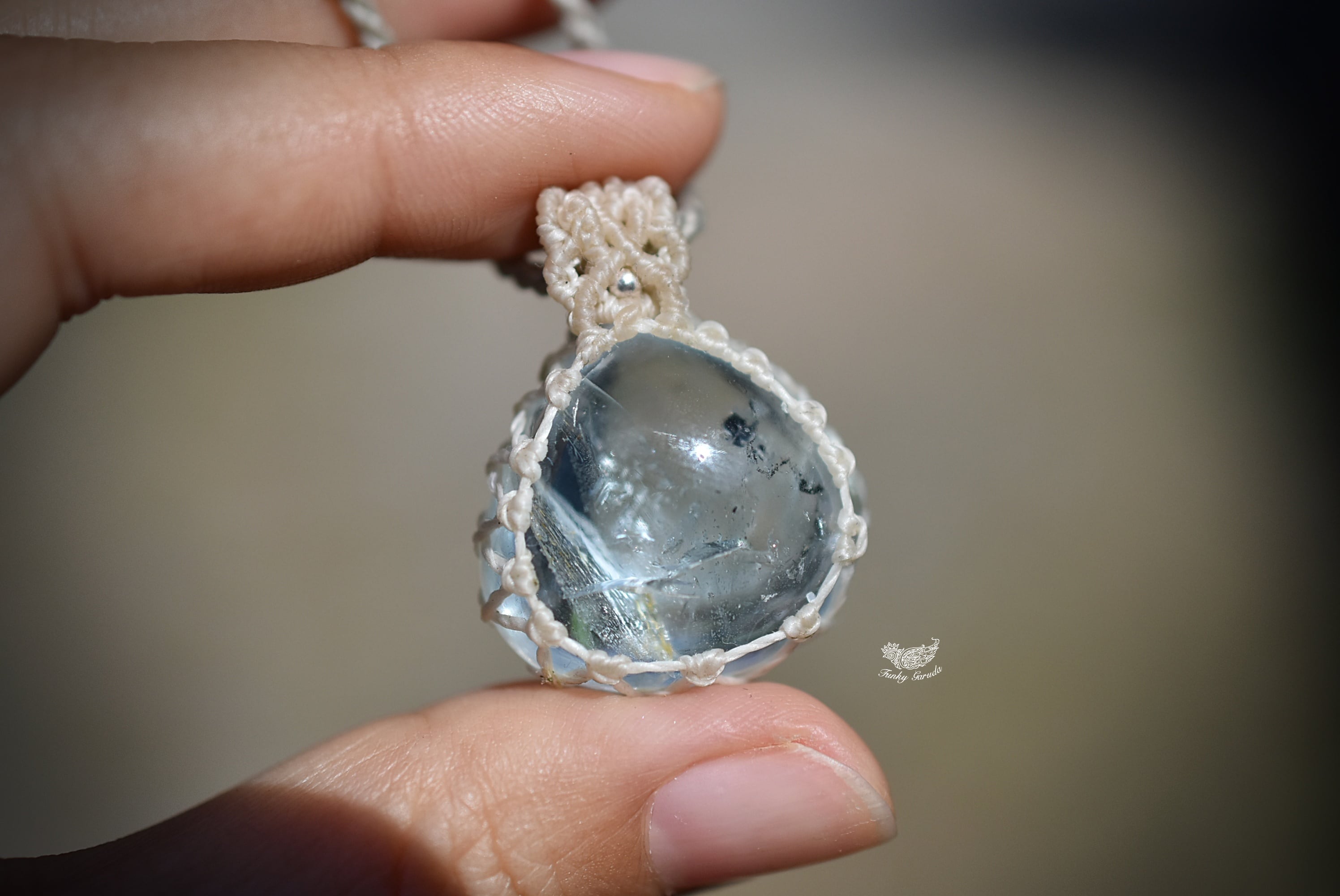 ◆このたびはキナリ、ナチュラルホワイト色の蝋引き糸を使用しマクラメ編み装飾を施しました。